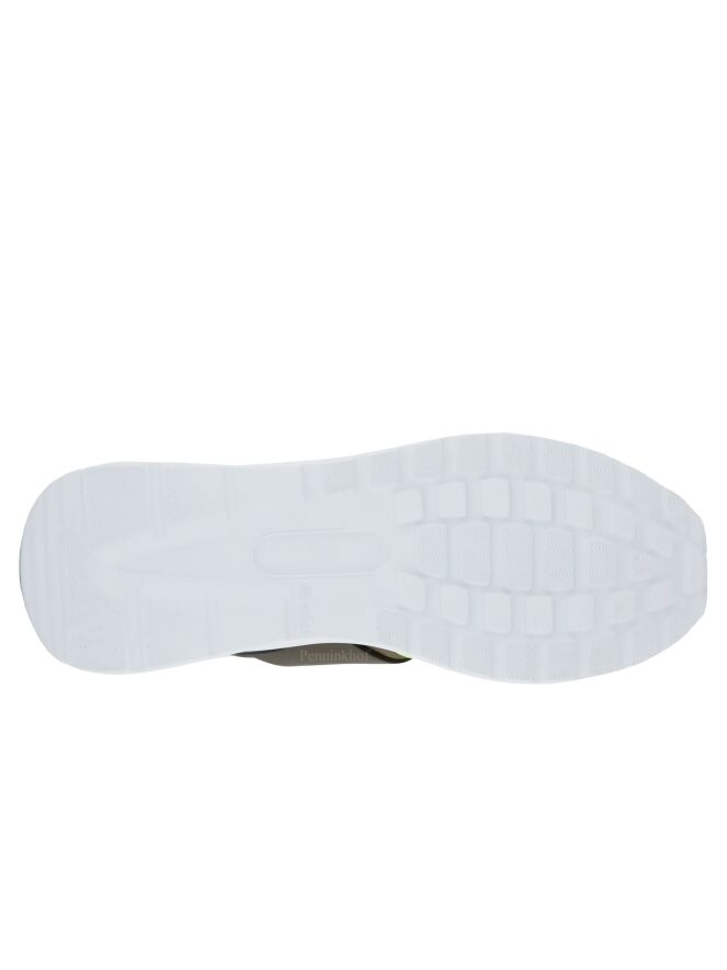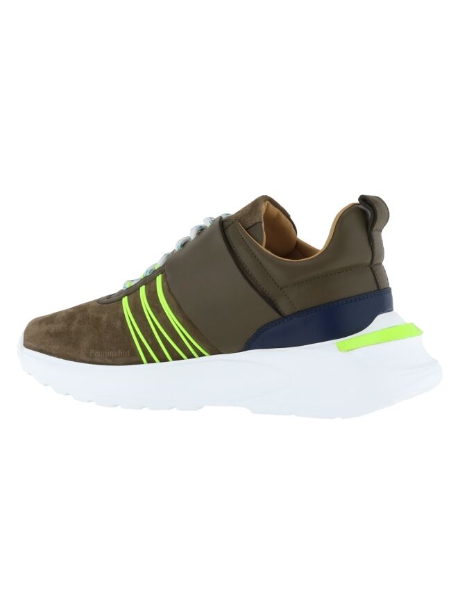 A sneaker from High in an olive green color. The forefoot is in suede and from the sides to the heel, the sneaker is in leather. Along the sides are decorative cords in a lime color. The sole in a light diagonal line is in a white color with a lime-colored stripe on the heel. The inside is lined with leather.