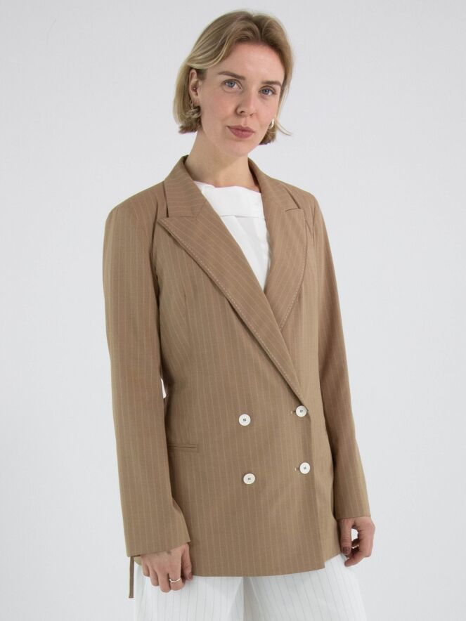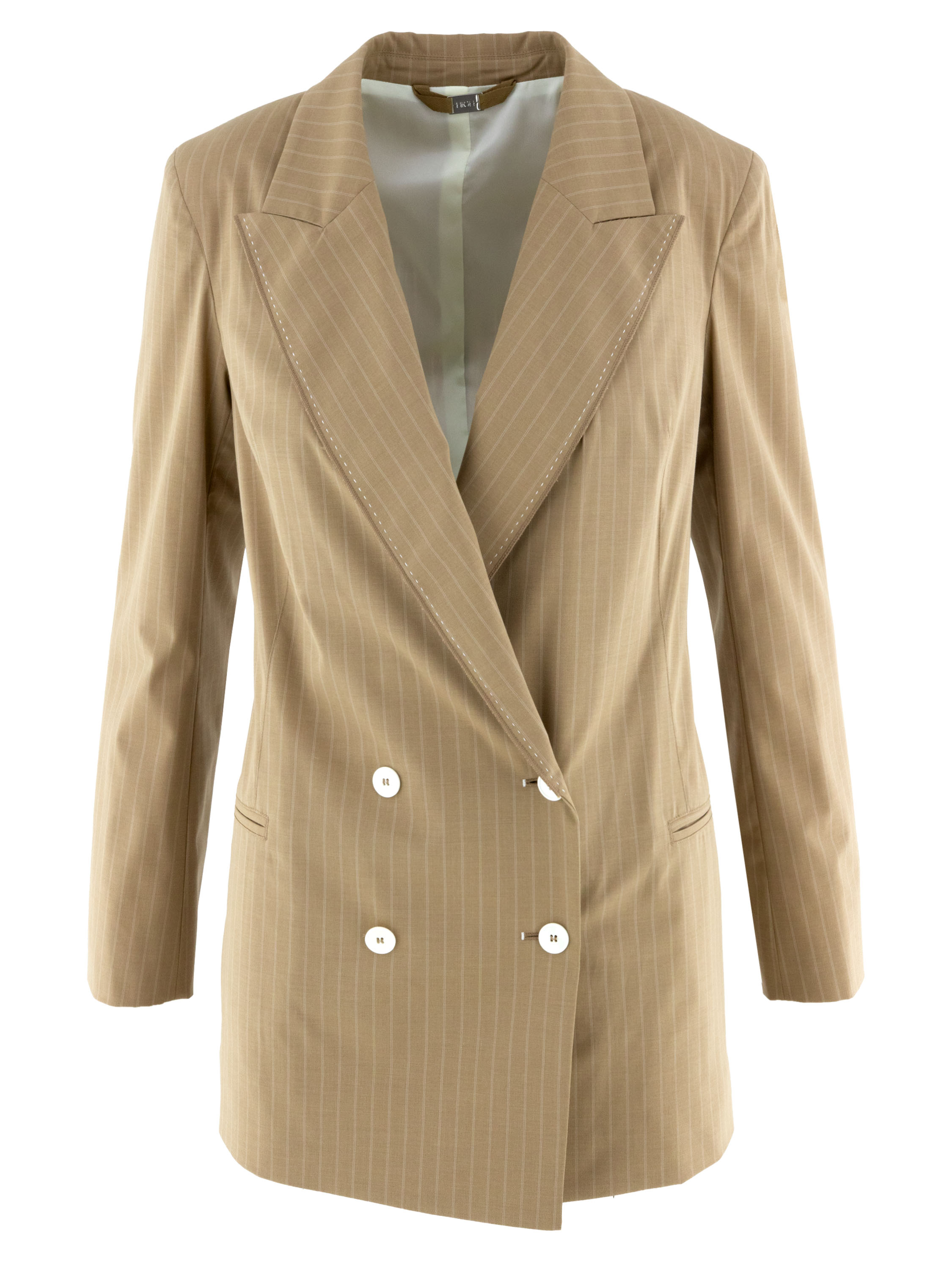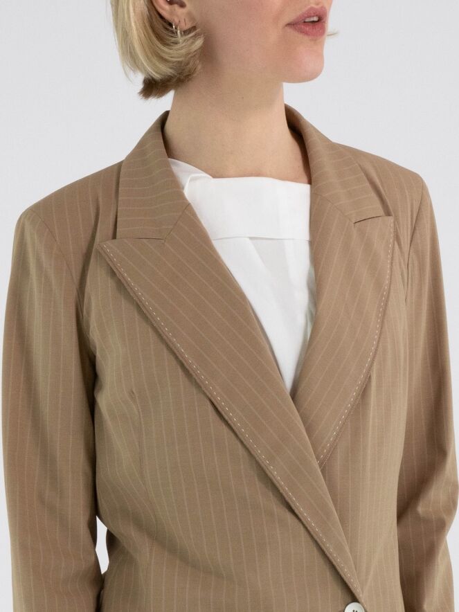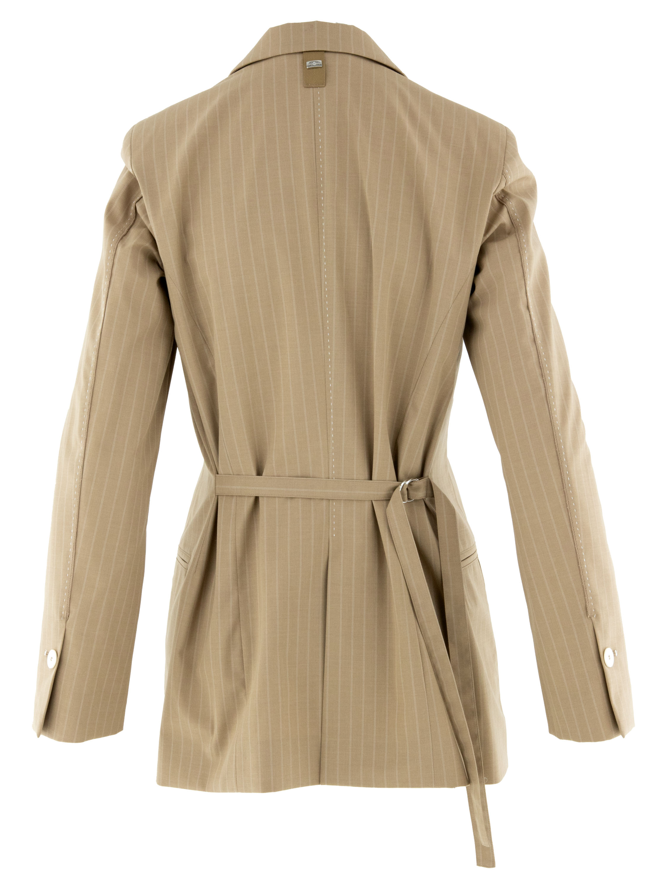 A double-breasted blazer from High in a chalk-stripe structure in camel. Along the edges of the lapels and down the centre back runs a decorative white stitch. The blazer features off-white buttons and is fully lined. At the back, at waist level, there is a strap in the same fabric as the blazer with a silver-coloured buckle, allowing a slightly tailored look if desired. This blazer must not be washed.