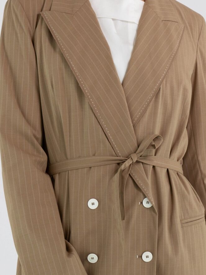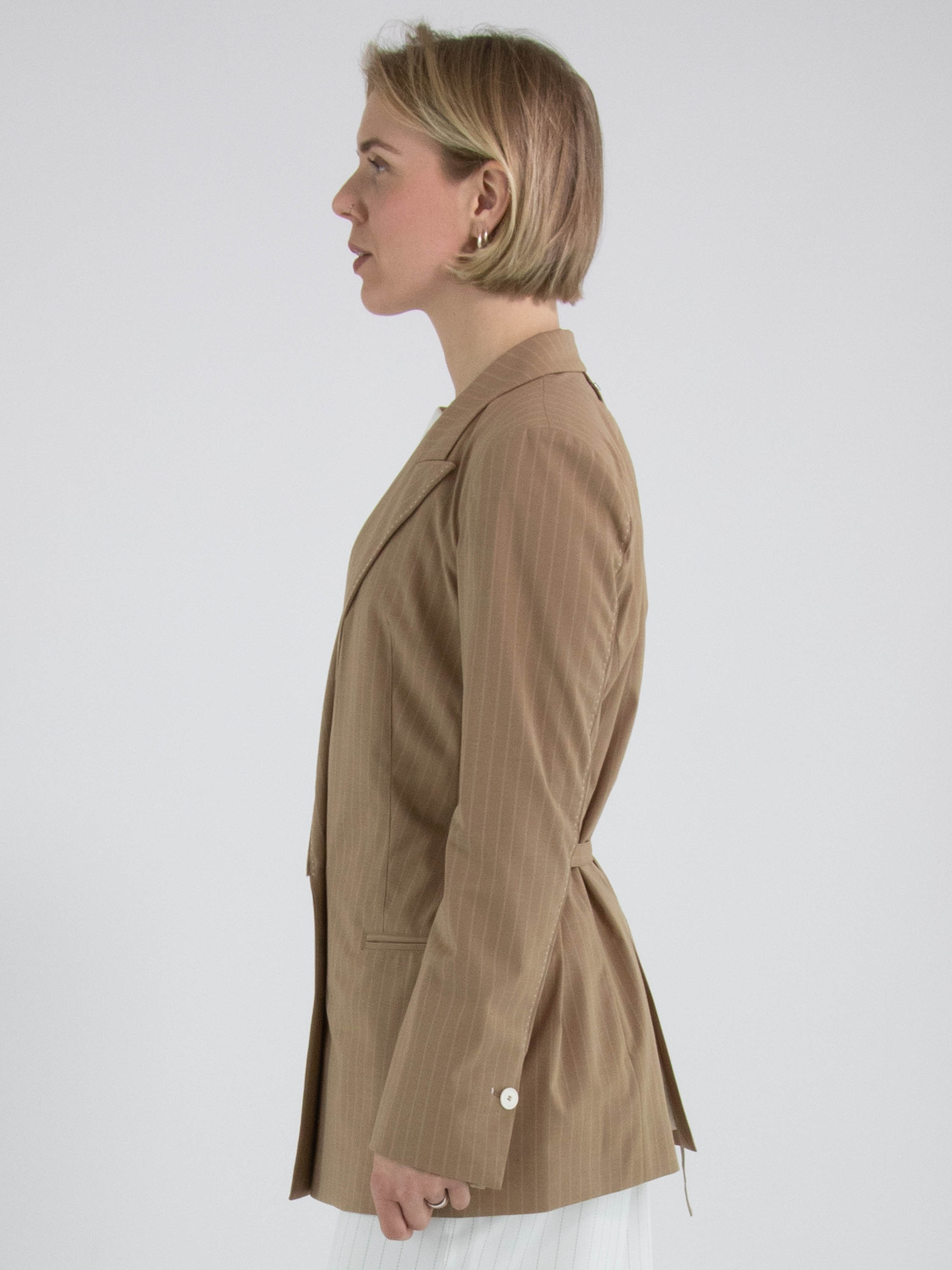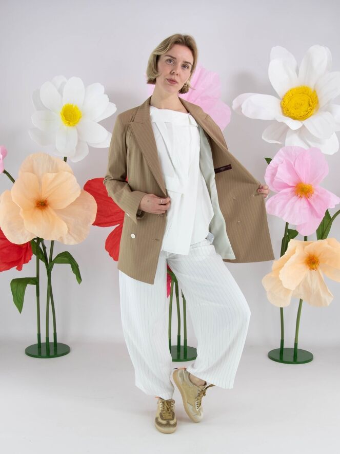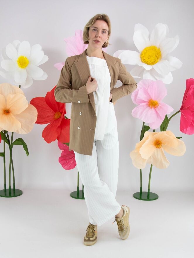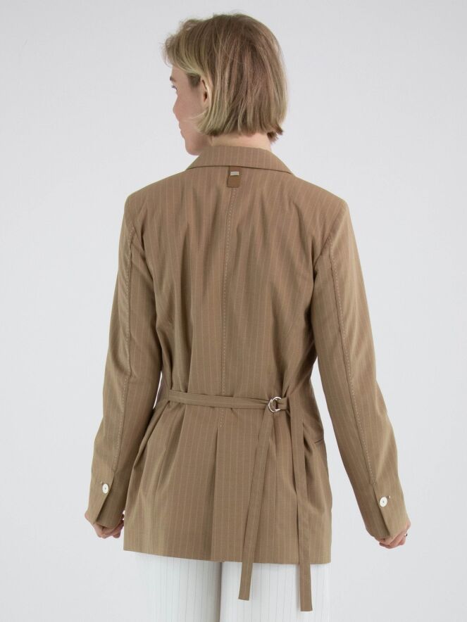A double-breasted blazer from High in a chalk-stripe structure in camel. Along the edges of the lapels and down the centre back runs a decorative white stitch. The blazer features off-white buttons and is fully lined. At the back, at waist level, there is a strap in the same fabric as the blazer with a silver-coloured buckle, allowing a slightly tailored look if desired. This blazer must not be washed.