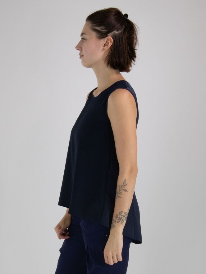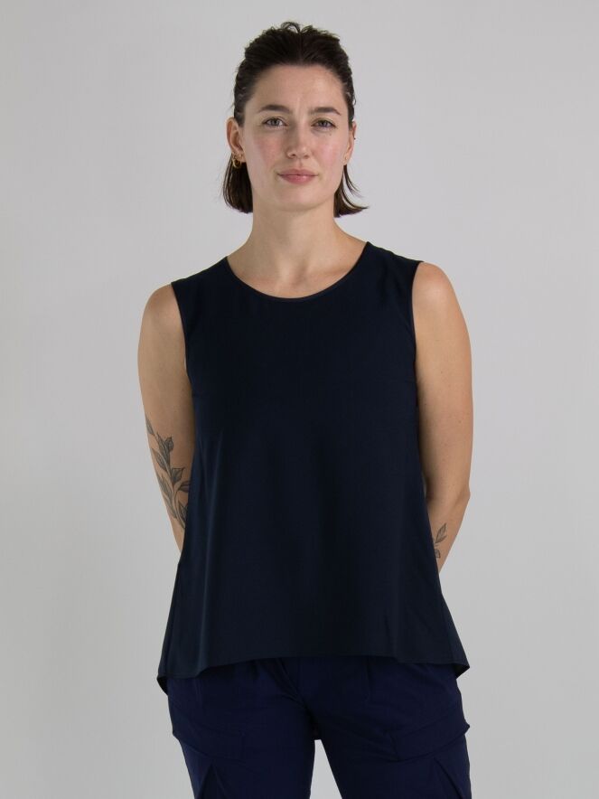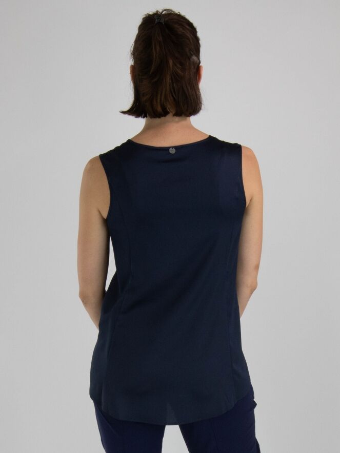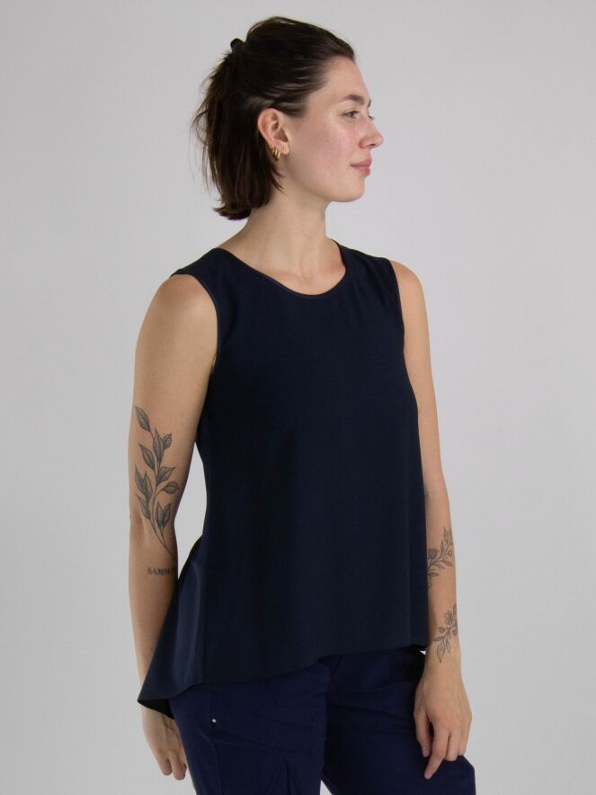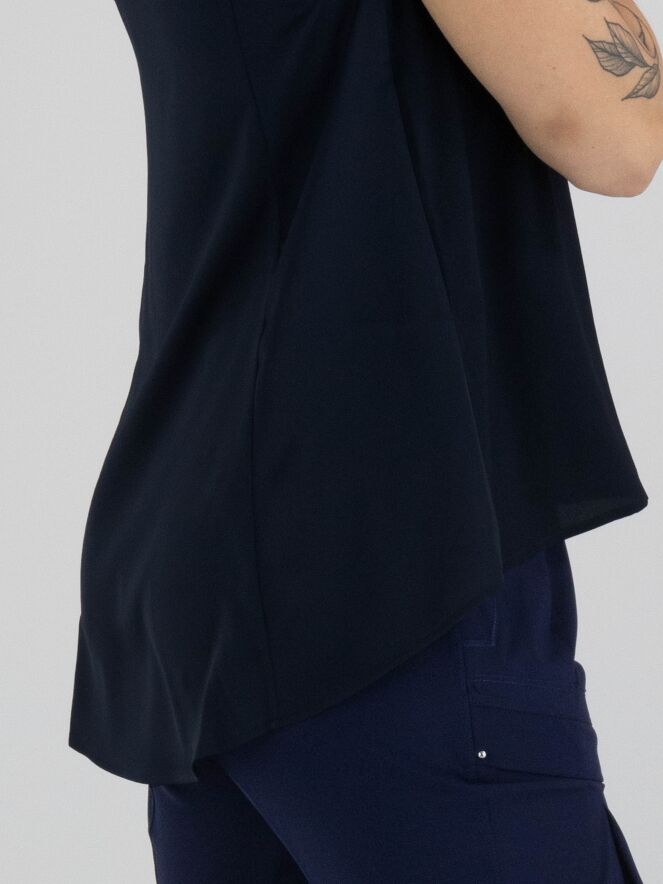 A top from High in navy blue. The top features a round neckline and has a slight A-line shape. The front is matte and the back is matte satin. This top can be hand washed.