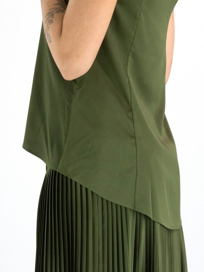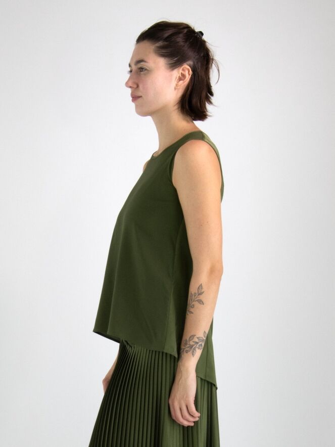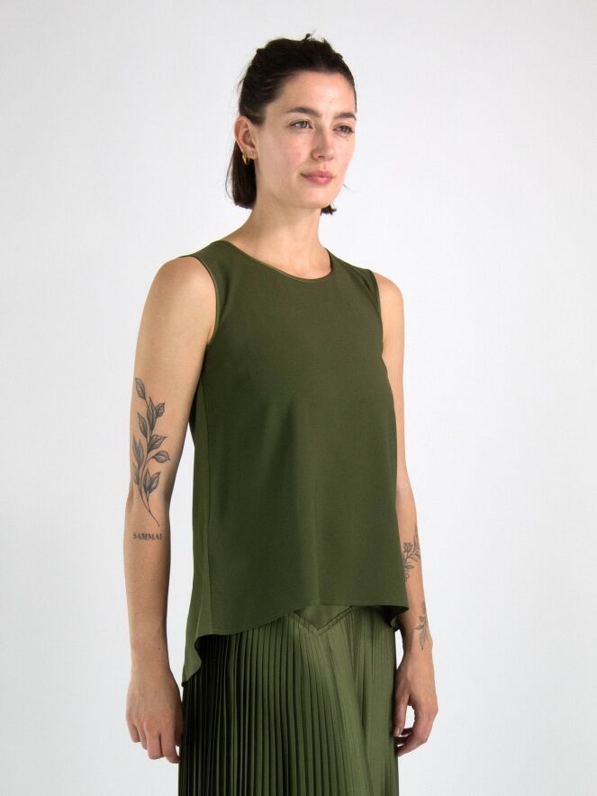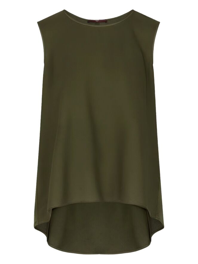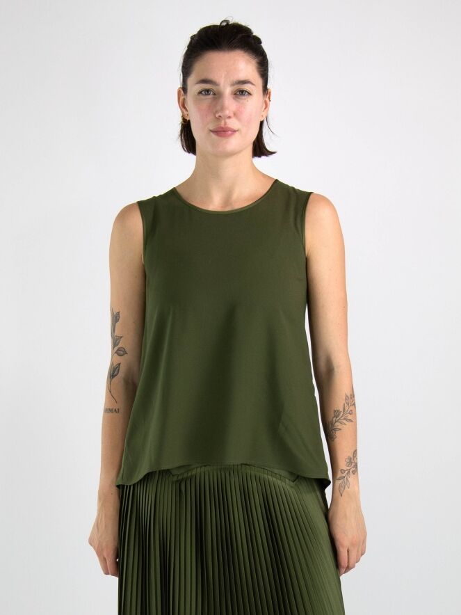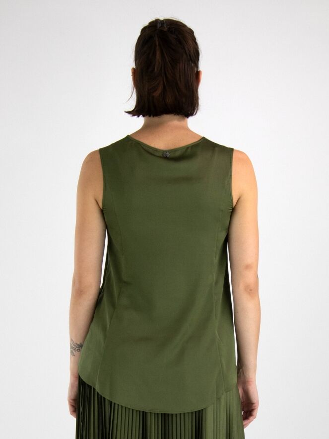 A top from High in olive green. The top features a round neckline and has a slight A-line shape. The front is matte and the back is matte satin. This top can be hand washed.