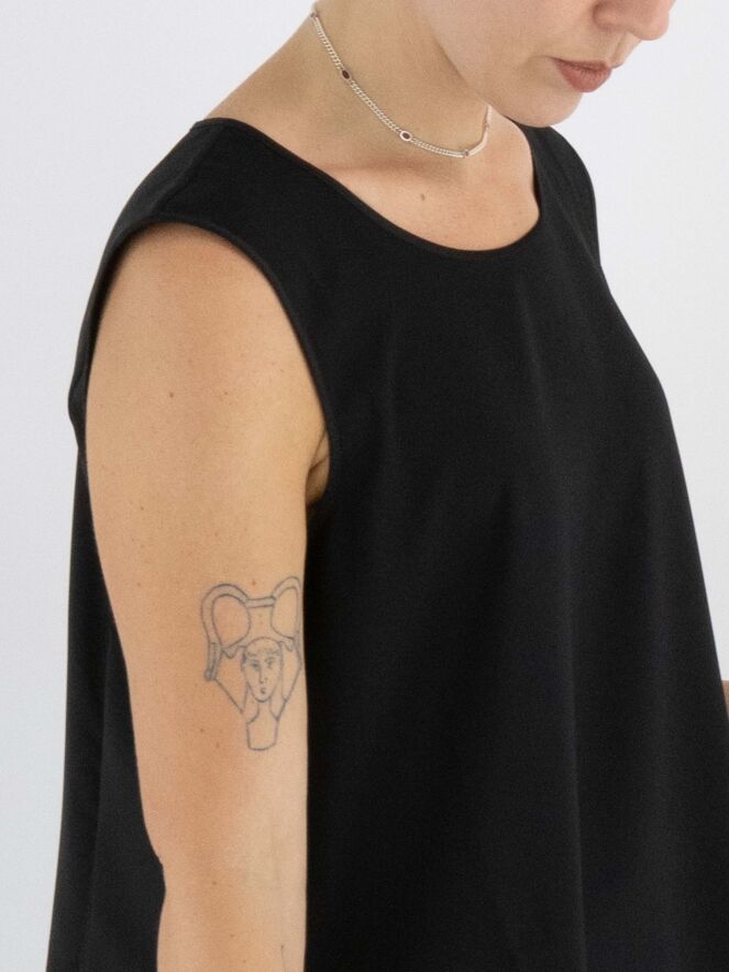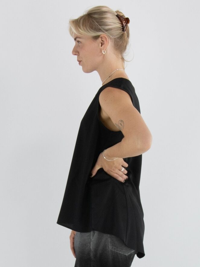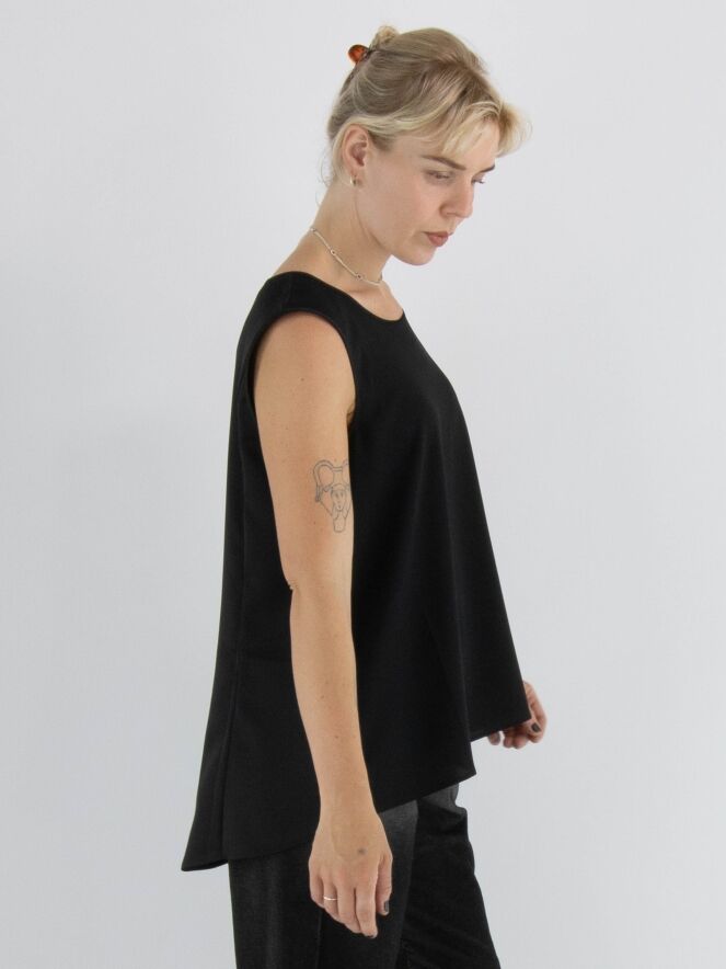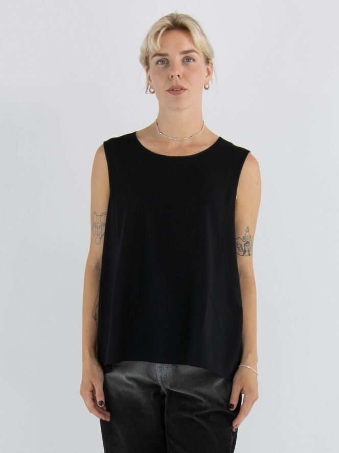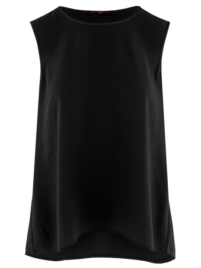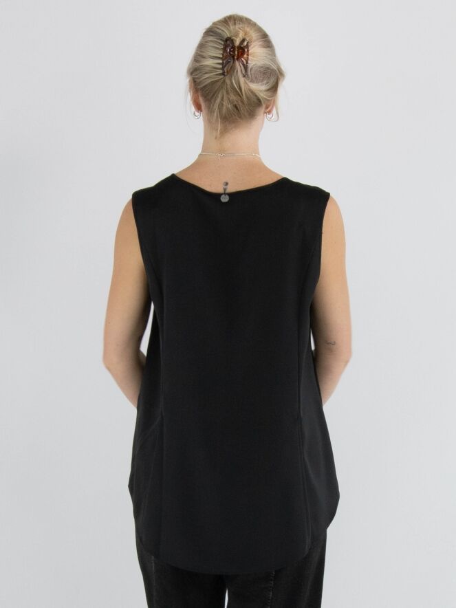 Top by High in black. It features a round neckline and a subtle A-line shape. The front is made of a matte fabric, while the back is in matte satin. This top should be hand-washed.