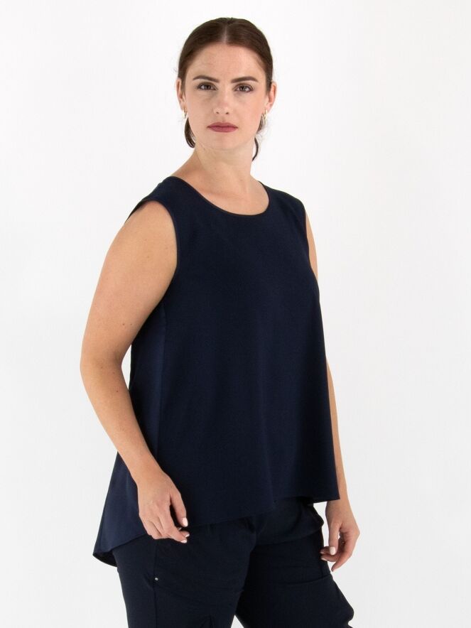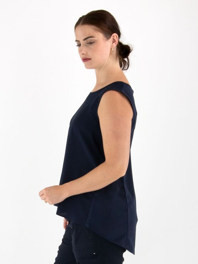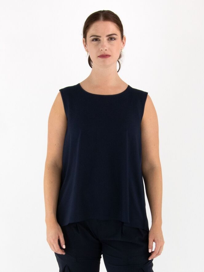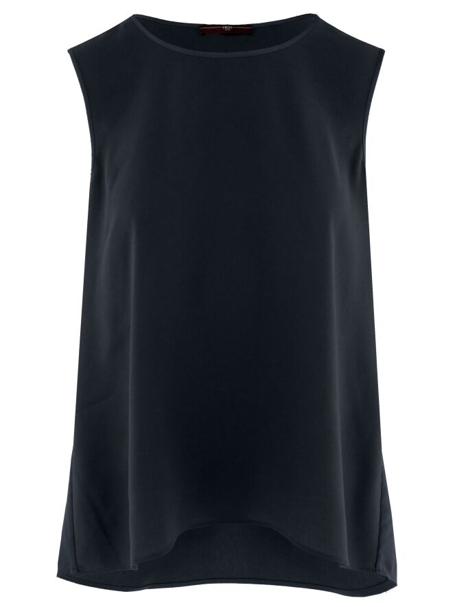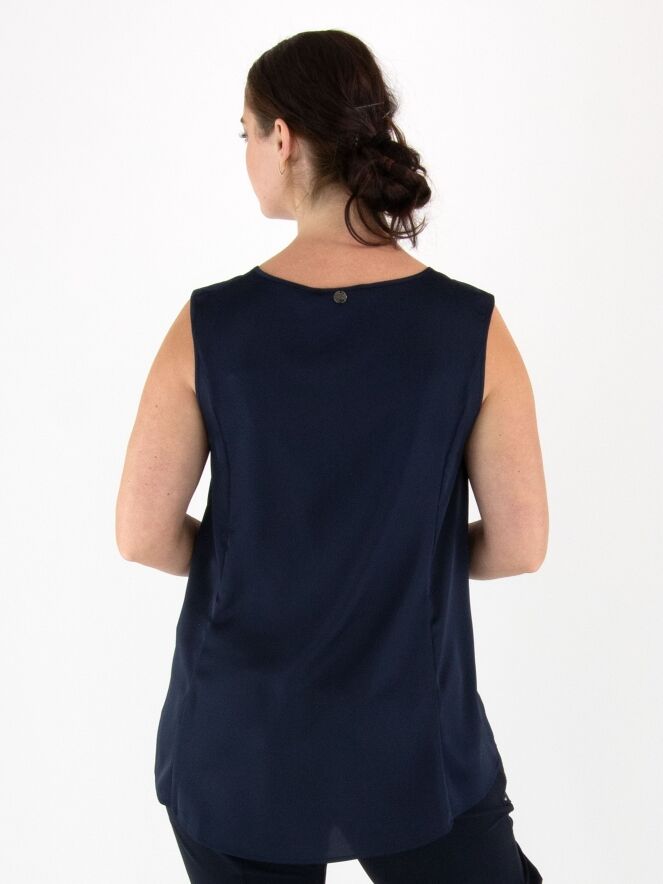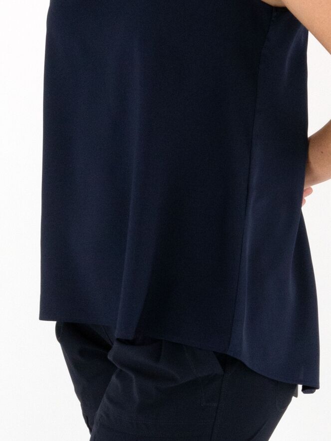 Top by High in navy blue. It features a round neckline and a subtle A-line shape. The front is made of a matte fabric, while the back is finished in matte satin. This top should be hand-washed.