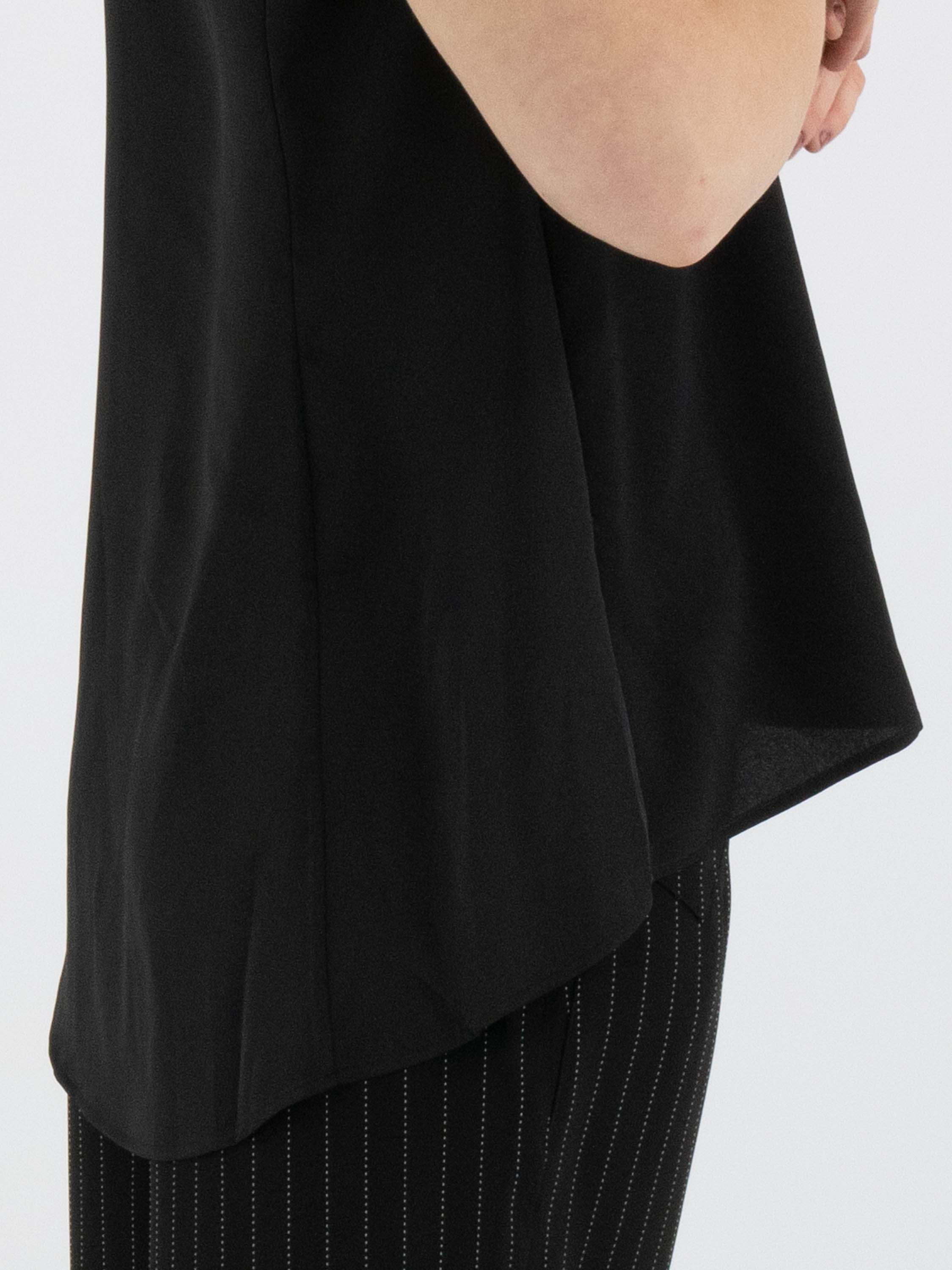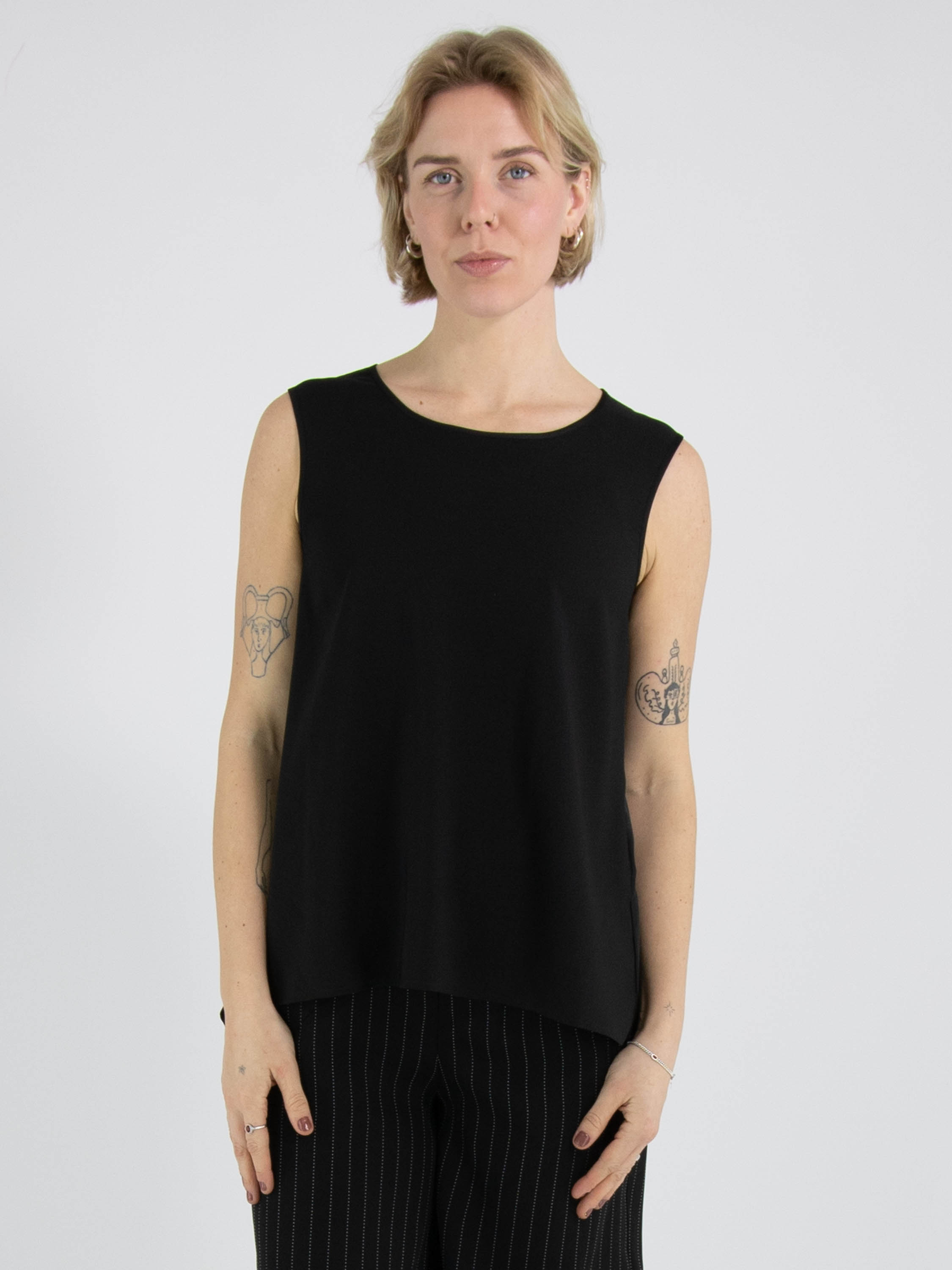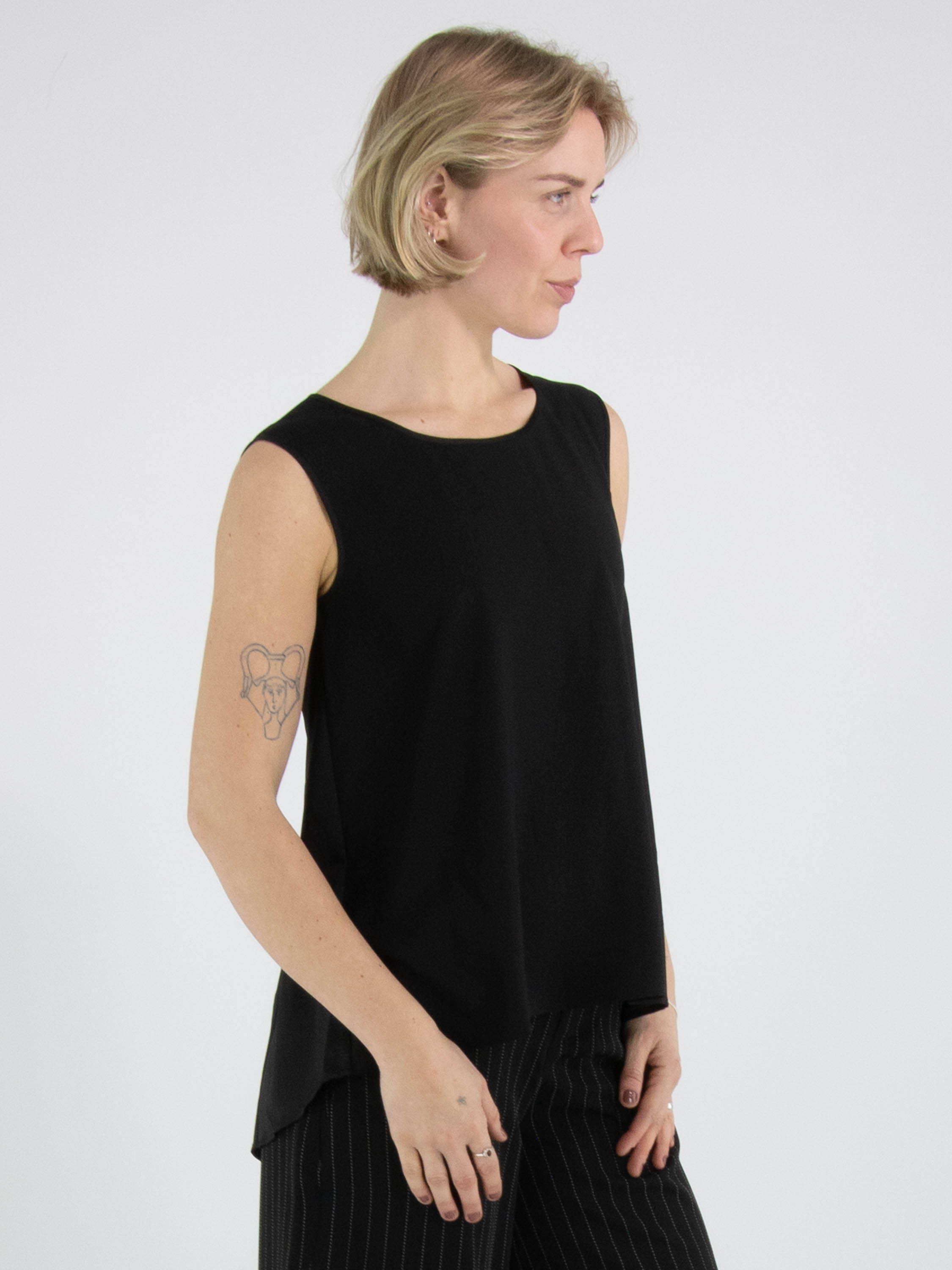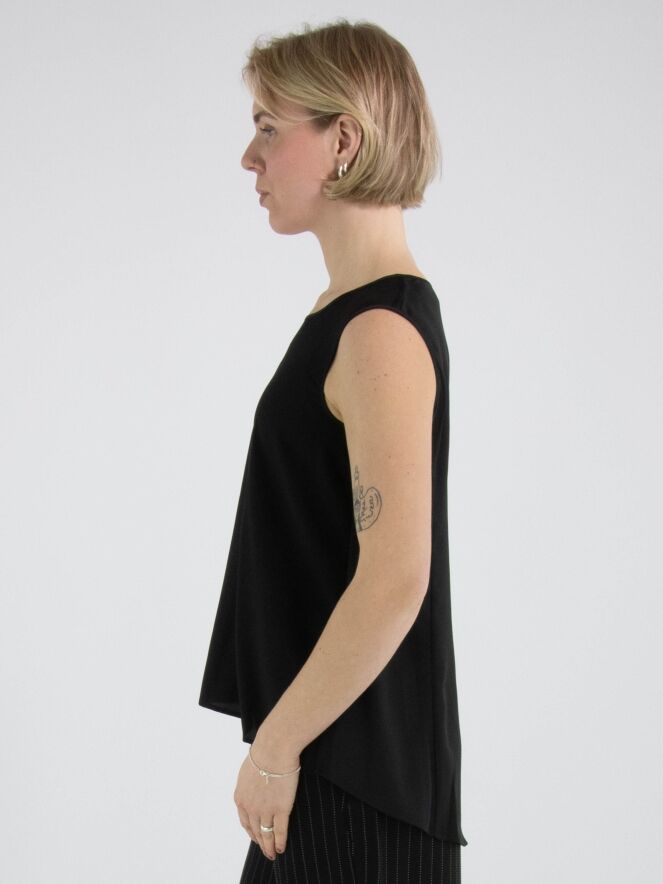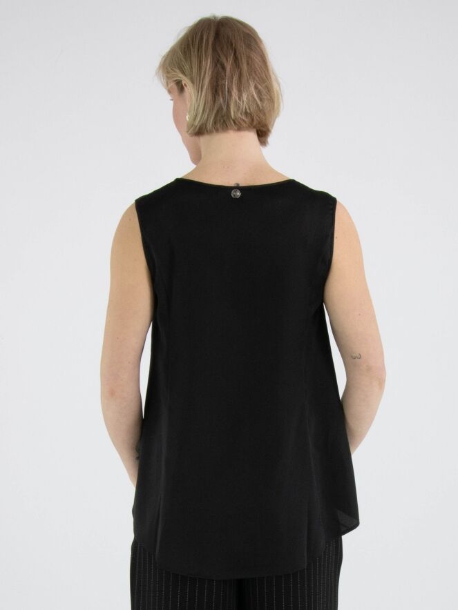 A top from High in black. The top has a round neckline and a slight A-line shape. The front is made from a matte fabric, while the back is finished in matte satin. This top can be hand-washed.