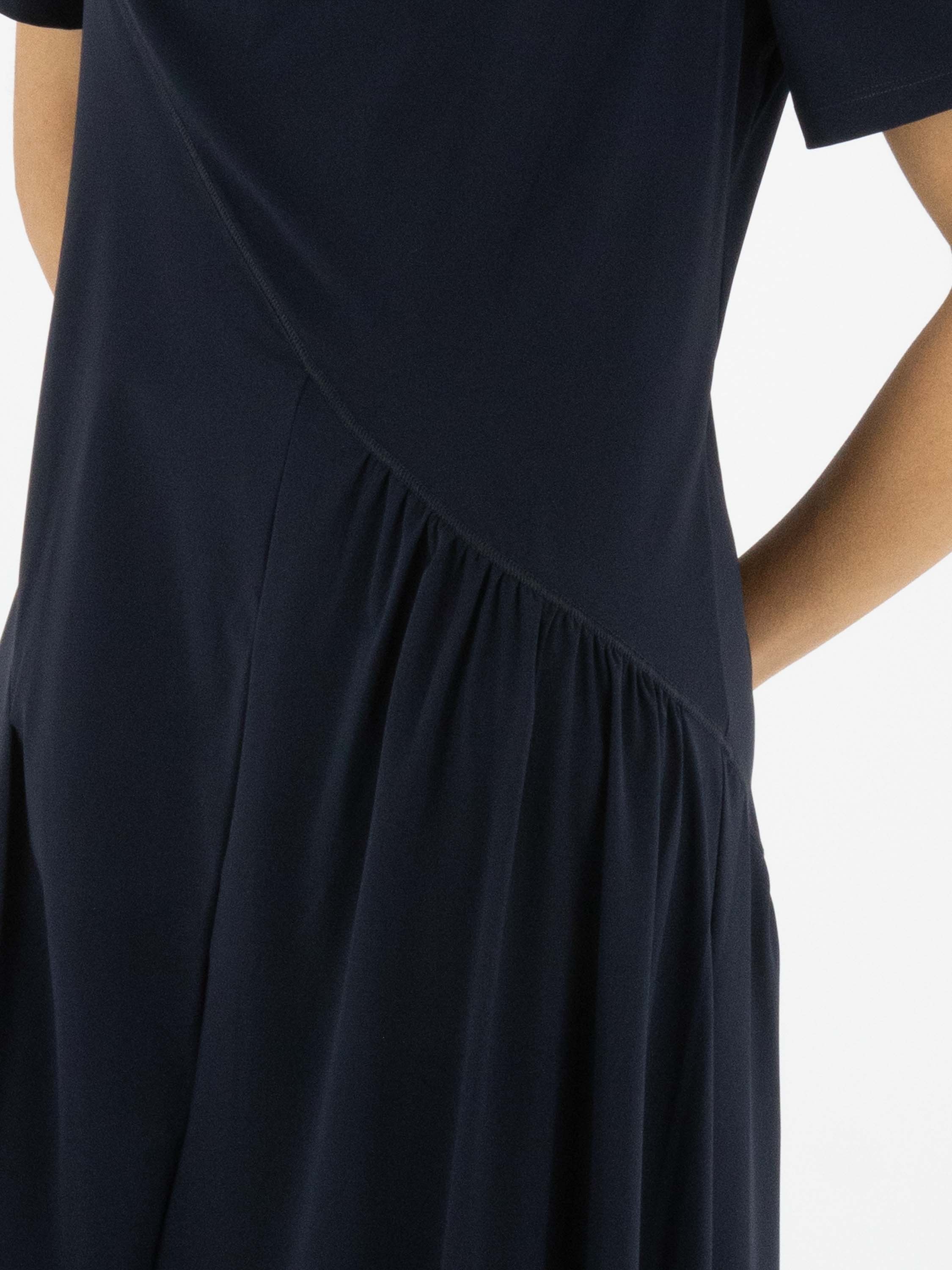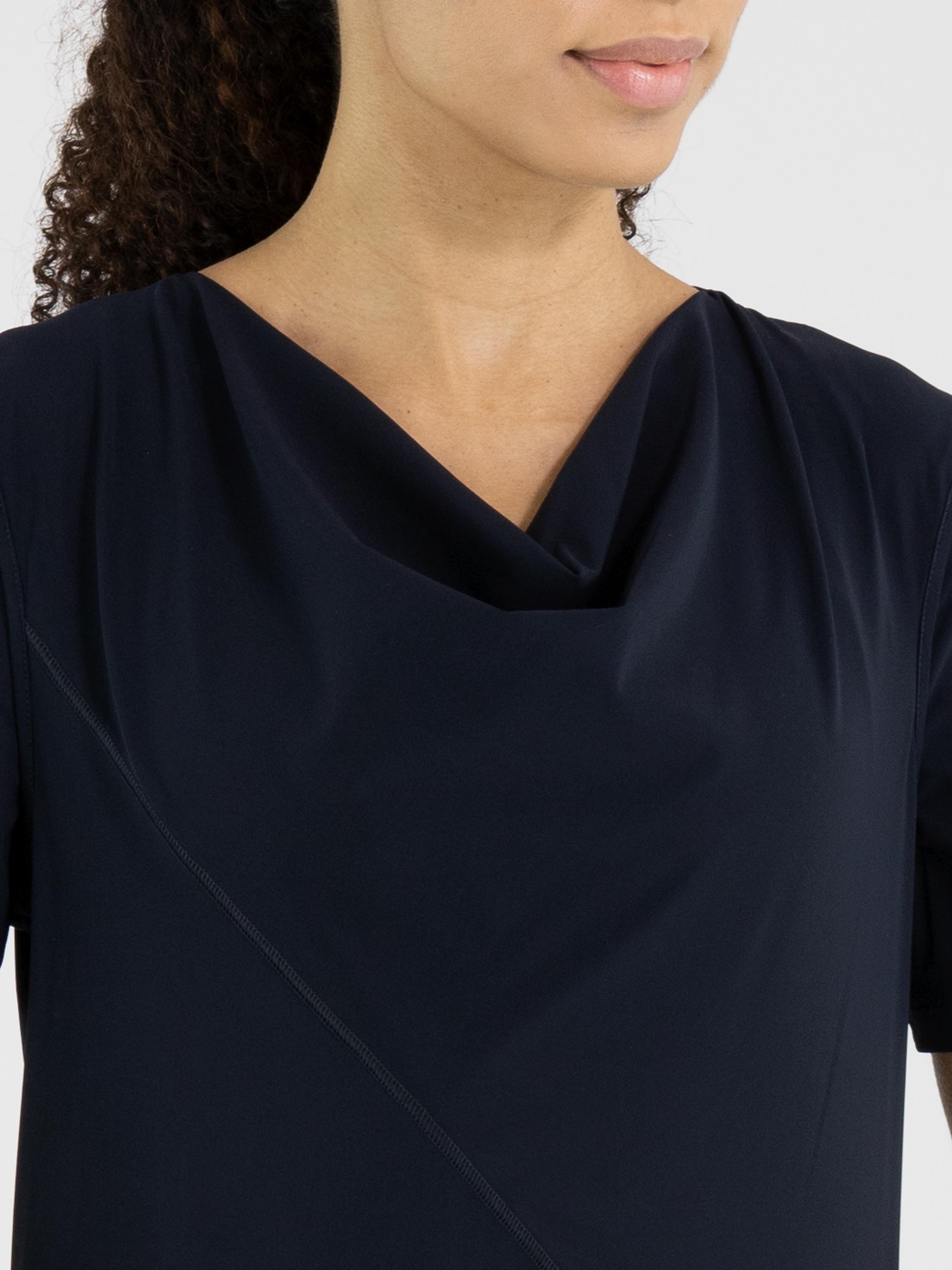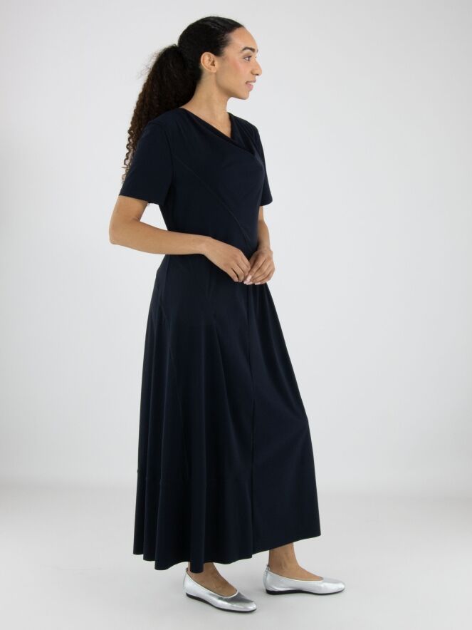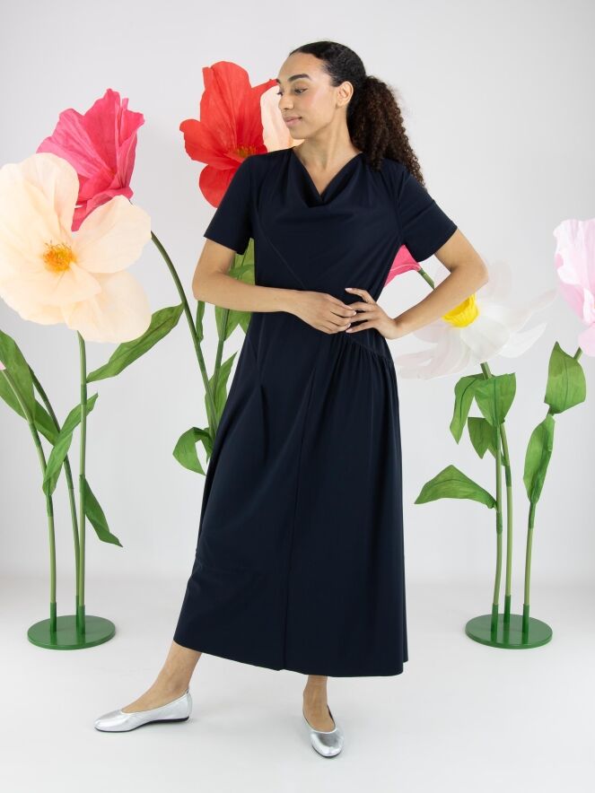 Dress by High in an elegant navy blue shade. Featuring a soft draped neckline and short sleeves, it offers a fluid and feminine look. A diagonal seam runs from the left shoulder to the right side of the waist. Beneath this seam, the fabric is delicately pleated at the waist, adding a refined detail. From the waist down, the dress flows into a flattering A-line silhouette. This exclusive designer dress can be washed at 30 degrees.