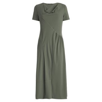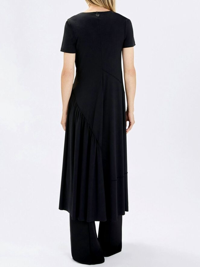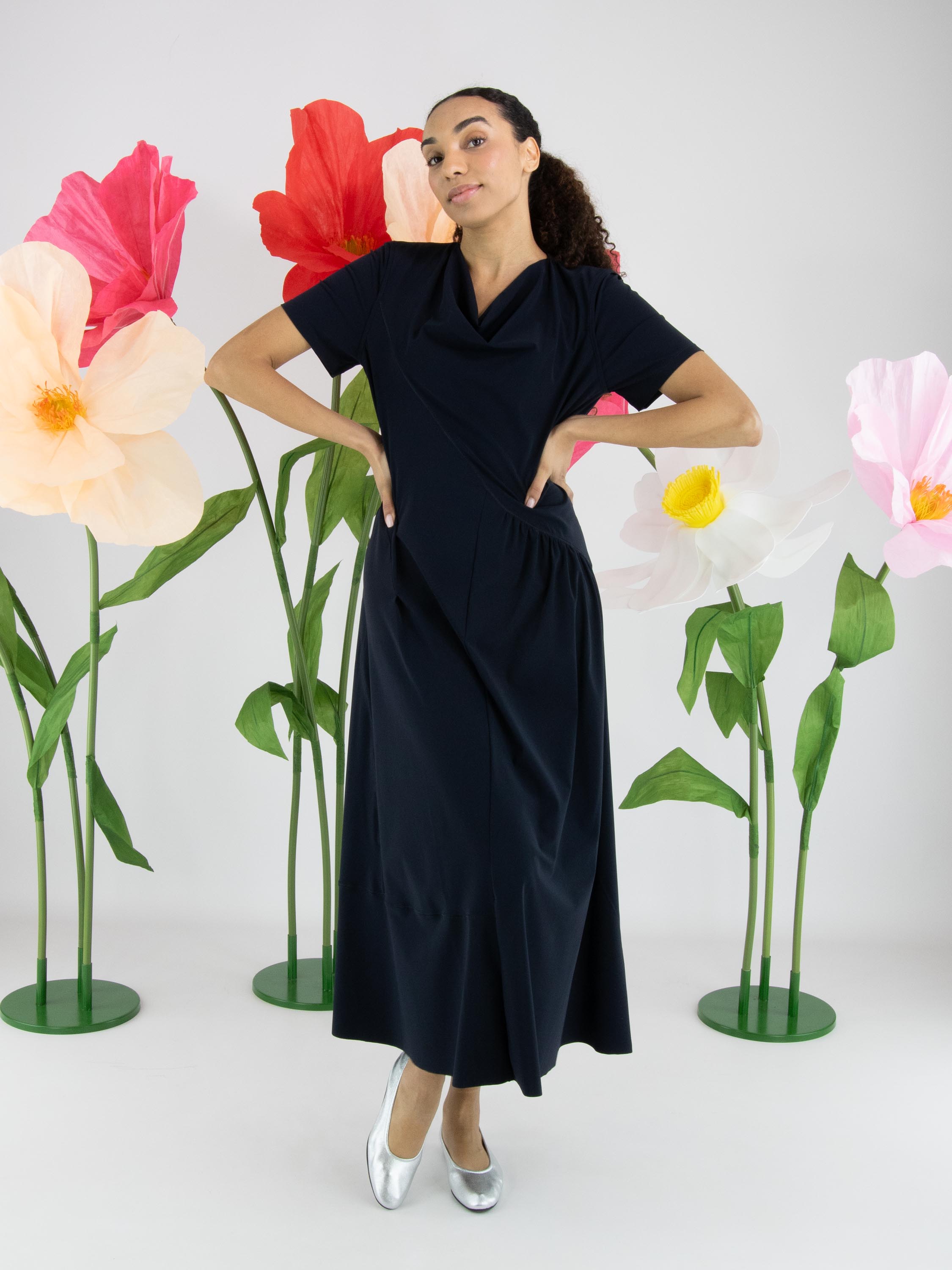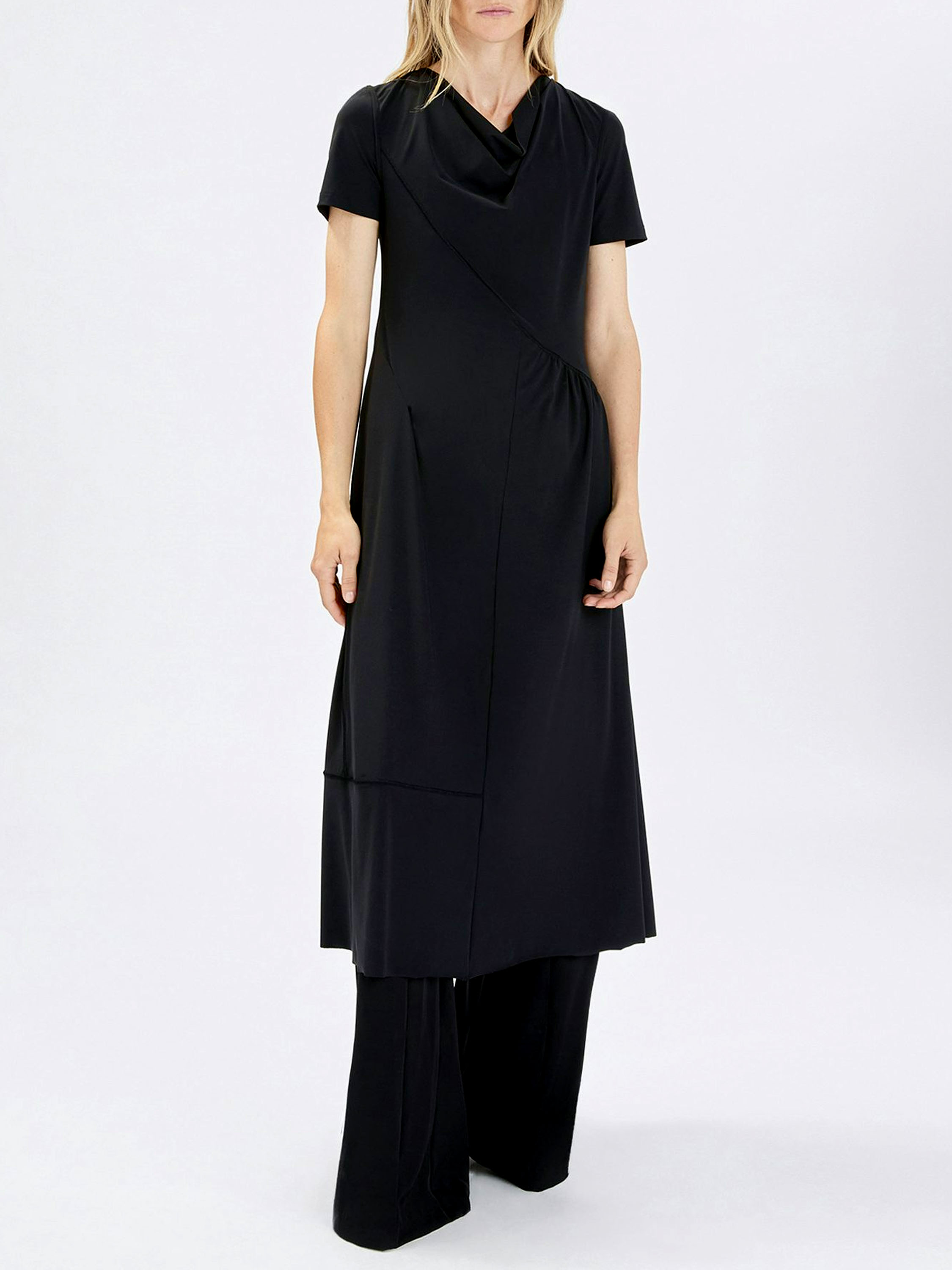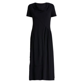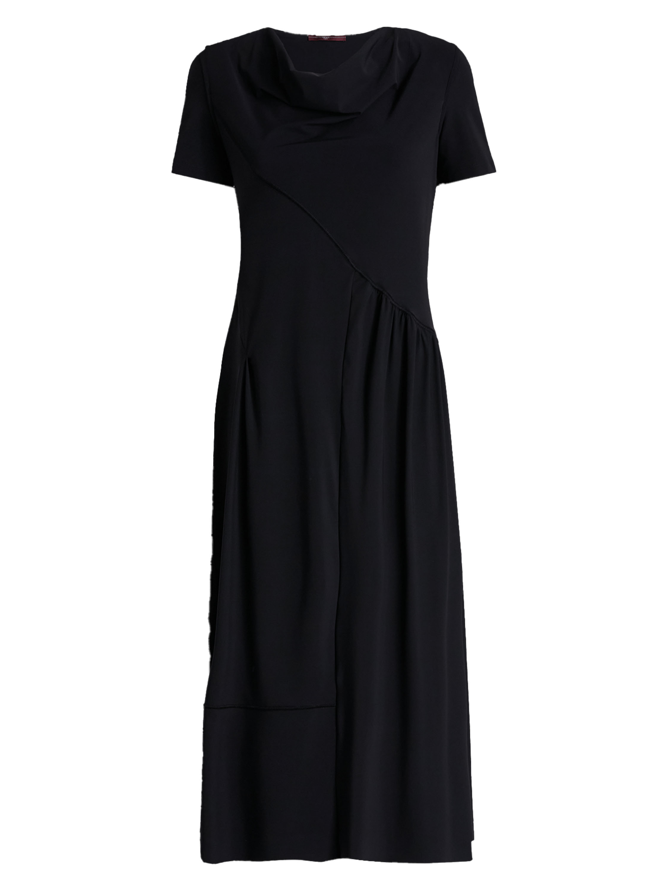 Dress by High in an elegant navy blue shade. Featuring a soft draped neckline and short sleeves, it offers a fluid and feminine look. A diagonal seam runs from the left shoulder to the right side of the waist. Beneath this seam, the fabric is delicately pleated at the waist, adding a refined detail. From the waist down, the dress flows into a flattering A-line silhouette. This exclusive designer dress can be washed at 30 degrees.