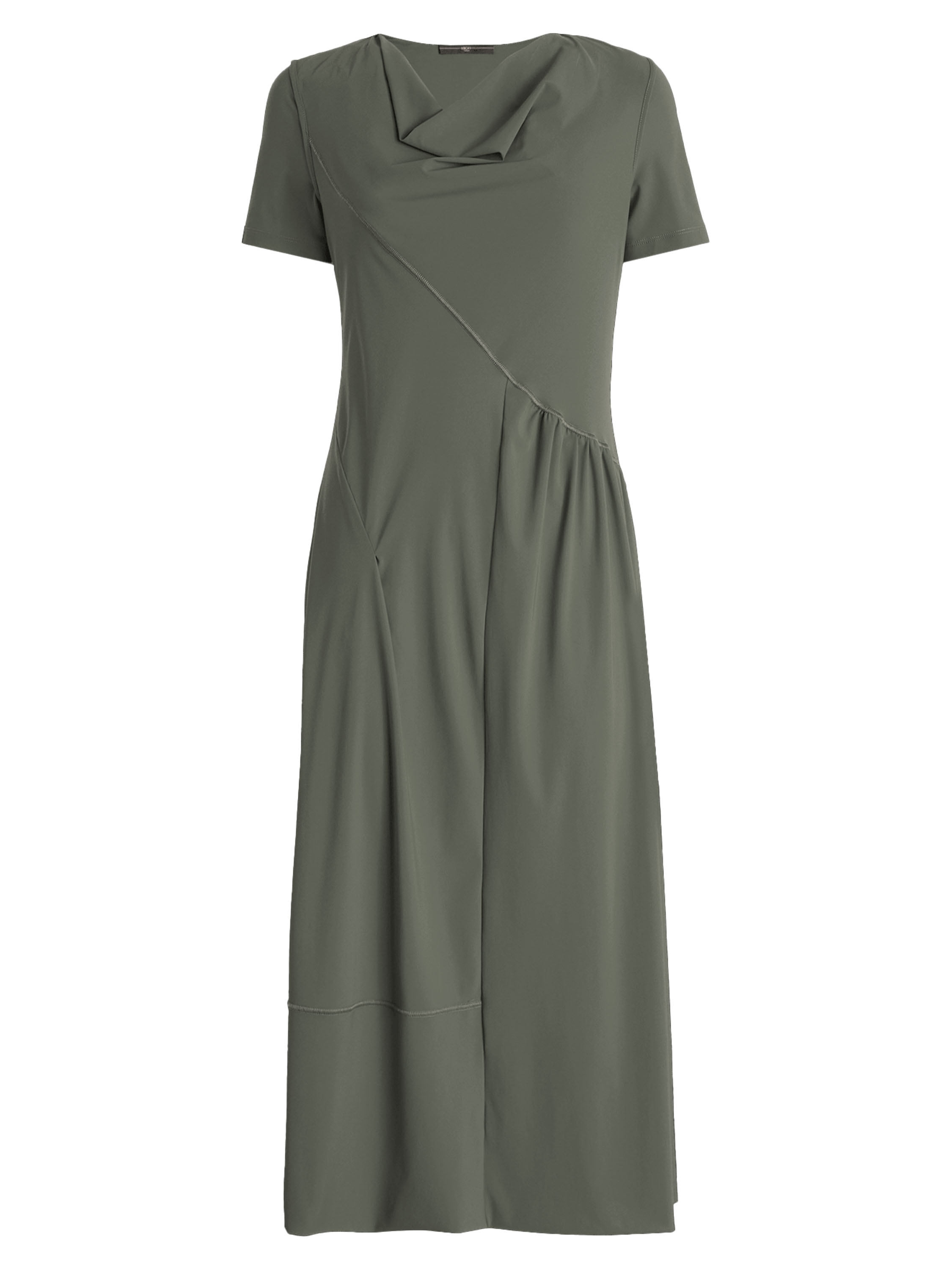 A dress by High in an olive green shade. The dress features a draped neckline and short sleeves. From the left shoulder, a diagonal seam runs down to the right side of the waist. At waist level, the fabric is finely pleated beneath this seam. From the waist, the dress flares out into a wide A-line silhouette. This dress can be washed at 30 degrees.