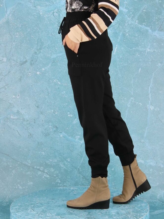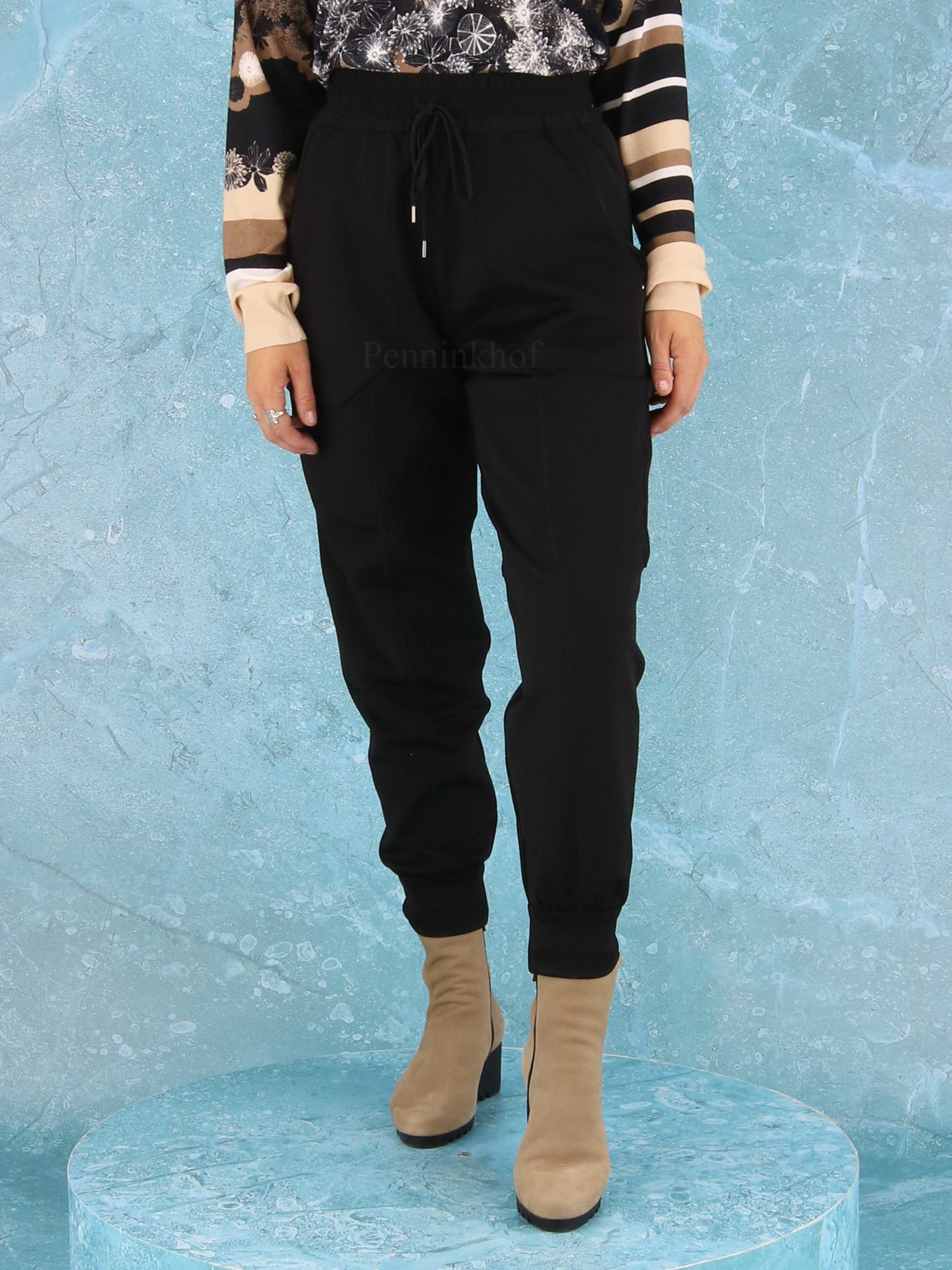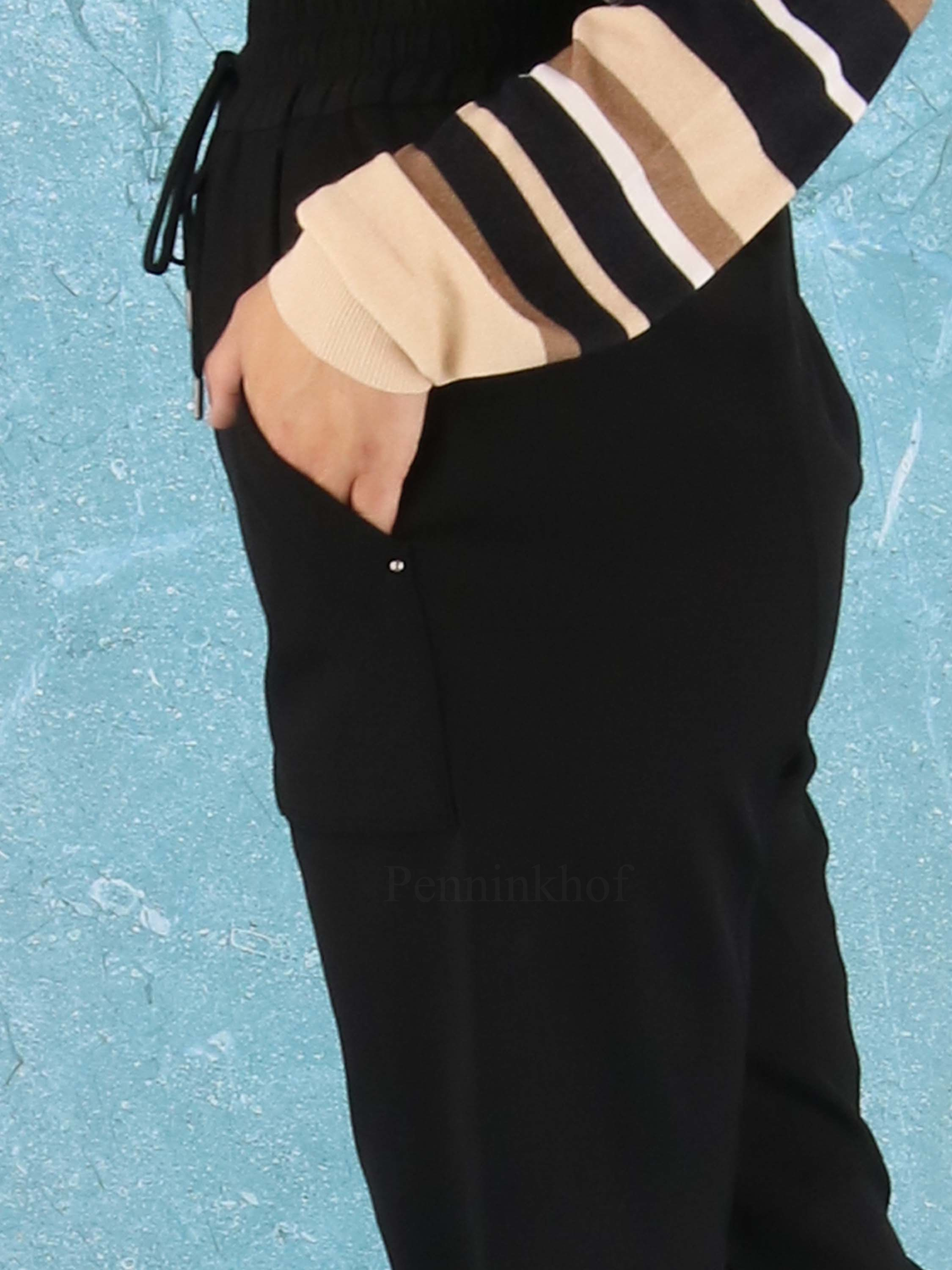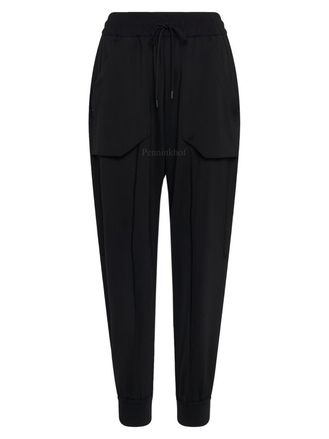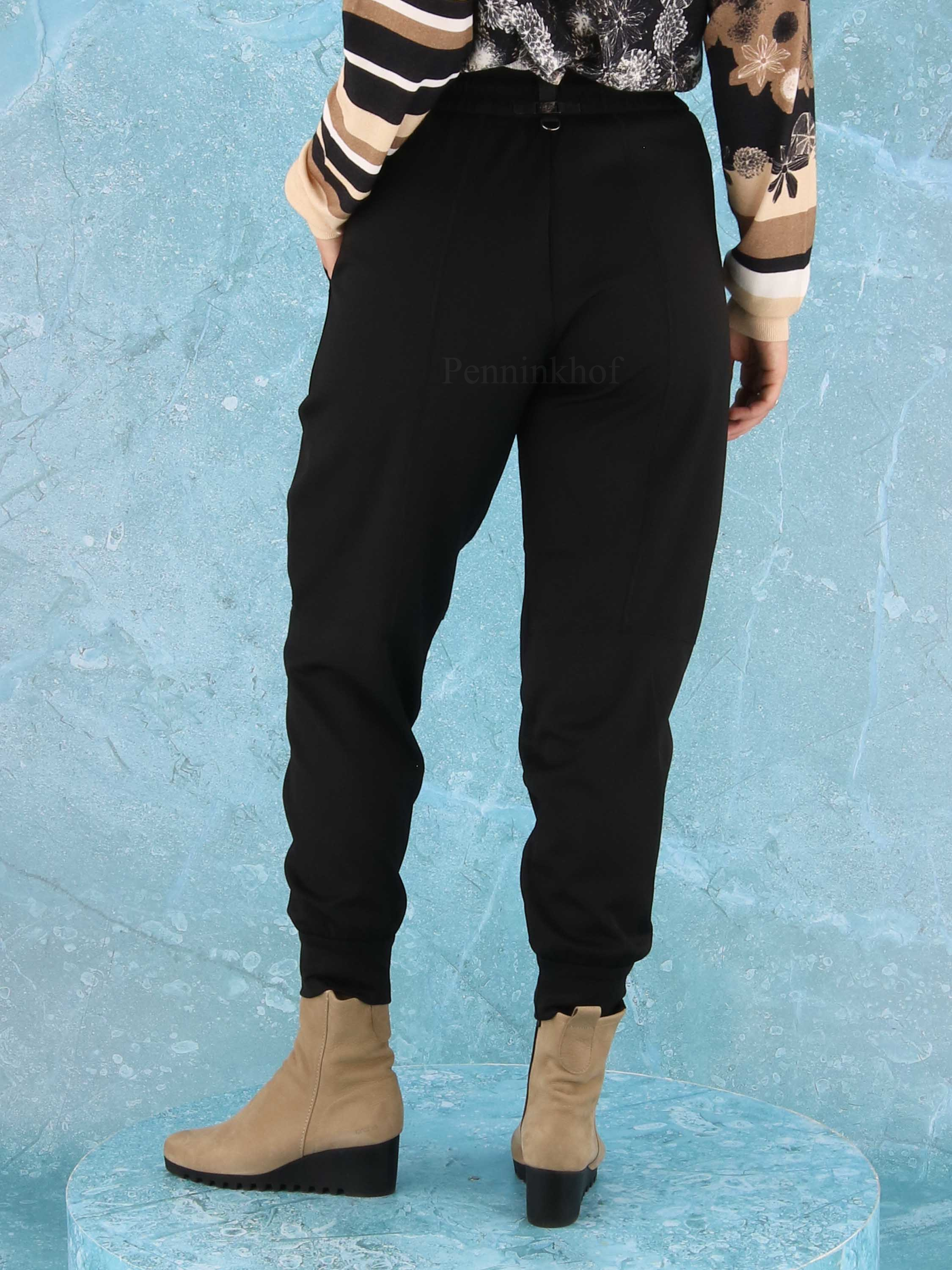Pants from High in the color black. At the waist is a finely pleated elastic band. There is a stitched seam across the middle of the legs. the pants have large side pockets and a wide collar at the bottom of the legs. These pants can be washed by hand.