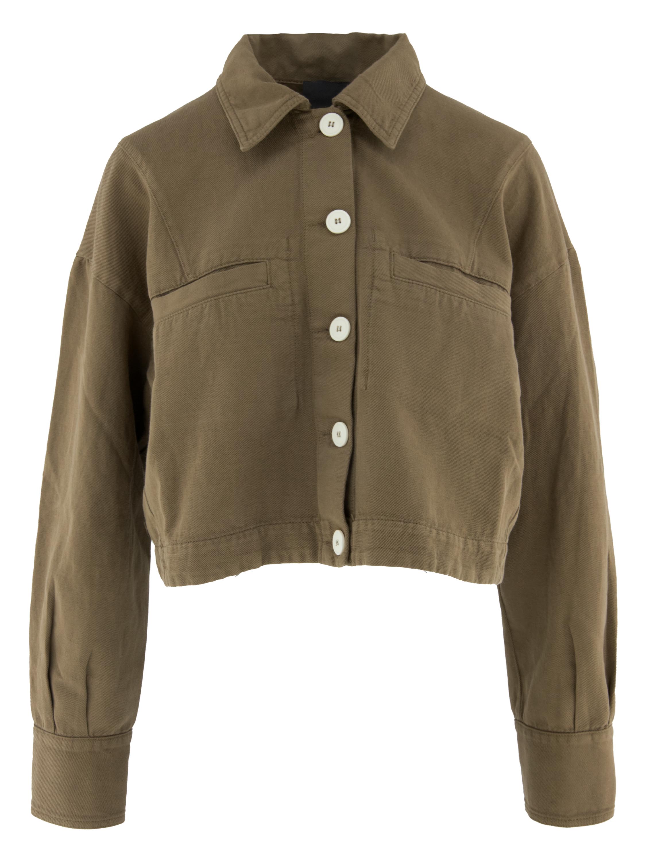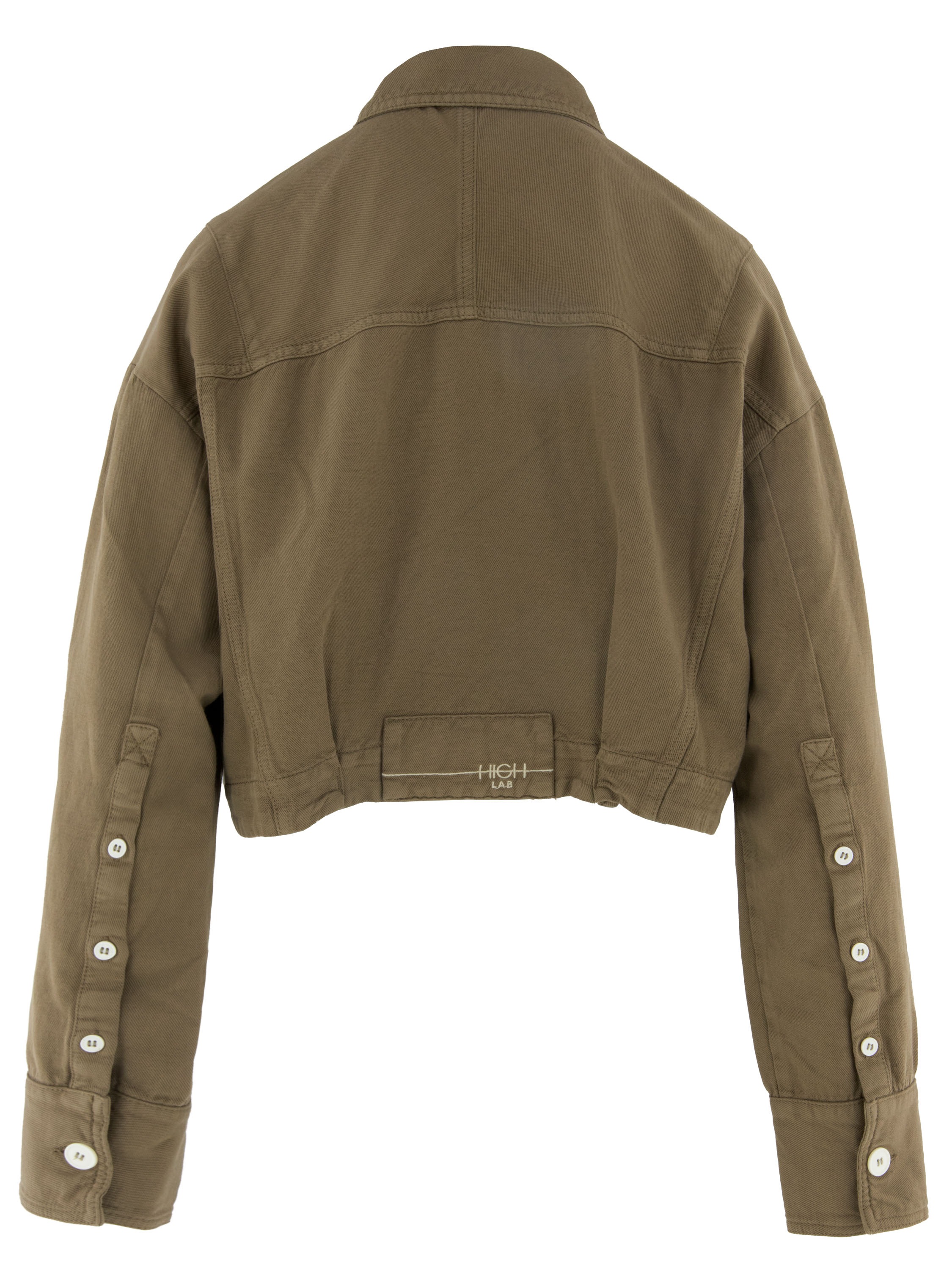 Short blazer by High in an olive green shade. The blazer fastens with five buttons and features a modern, structured silhouette. The sleeves are detailed with a button closure running along the forearm to the cuffs, adding a distinctive and refined element. The blazer includes chest pockets and can be washed at 30 degrees.