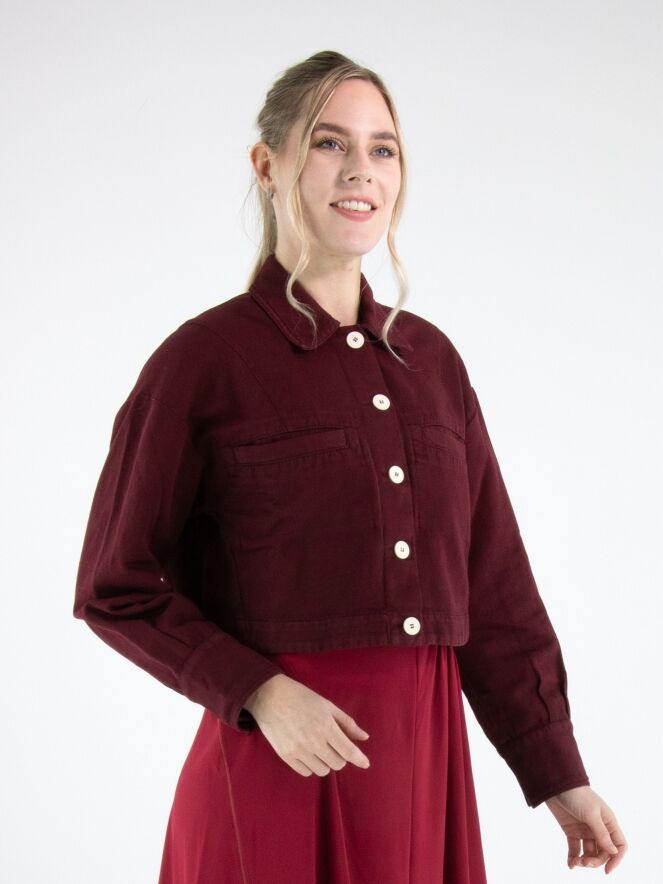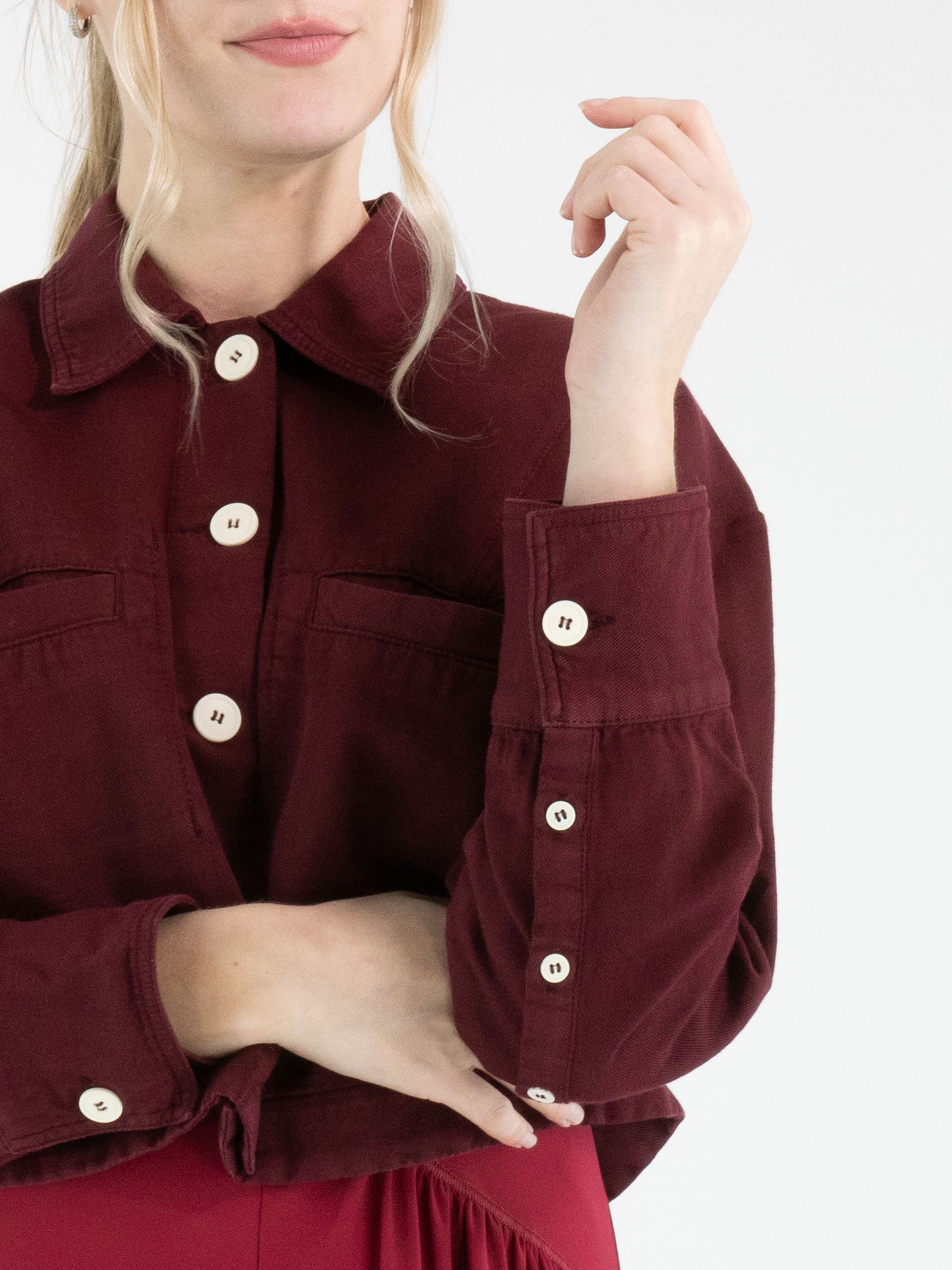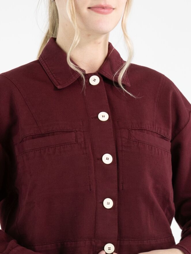 Short blazer by High in a rich aubergine shade. The blazer fastens with five buttons and features a strong, contemporary silhouette. The sleeves are detailed with a button closure running along the length of the forearm to the cuffs, creating a distinctive and refined design element. The blazer includes chest pockets and can be washed at 30 degrees.