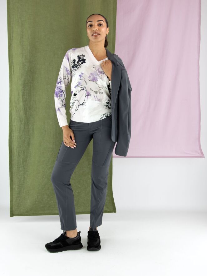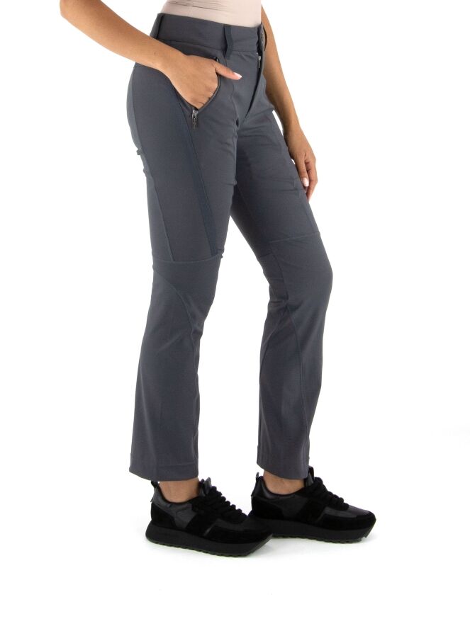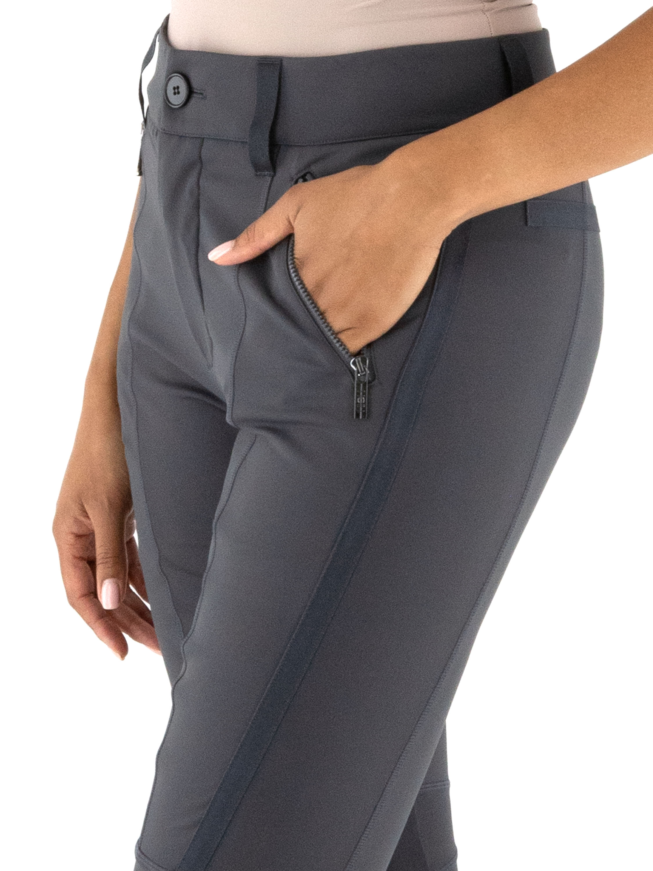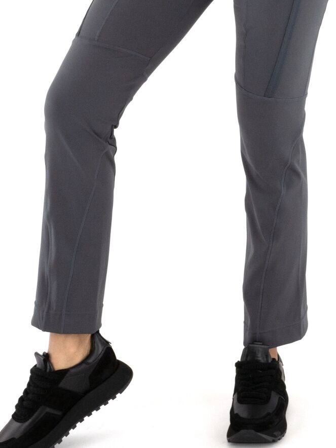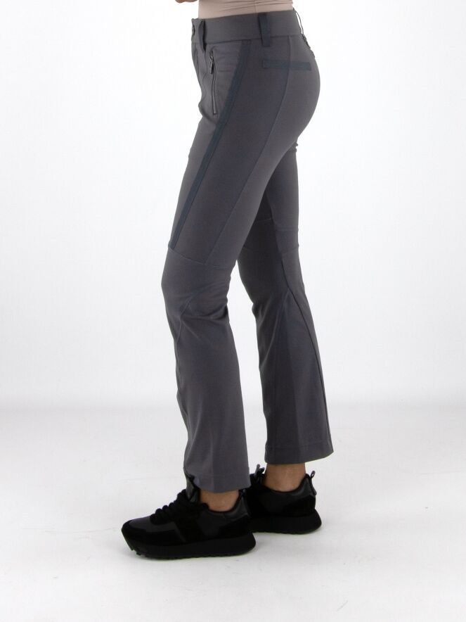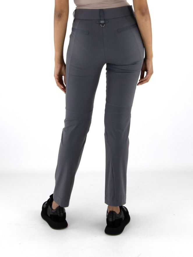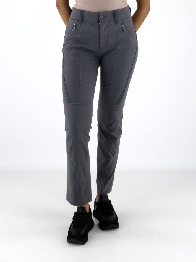 Trousers by High in anthracite grey. The front pockets are finished with zip closures. The trousers are detailed with multiple diagonal, vertical and horizontal seams and piping. These trousers can be hand-washed.