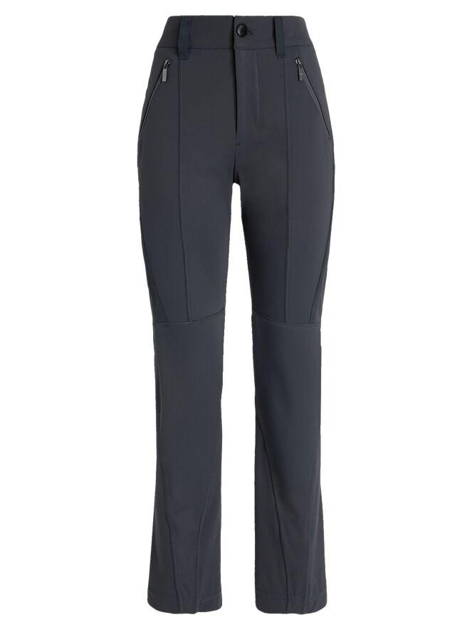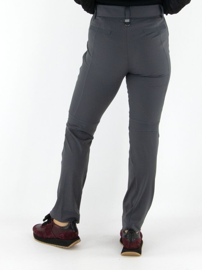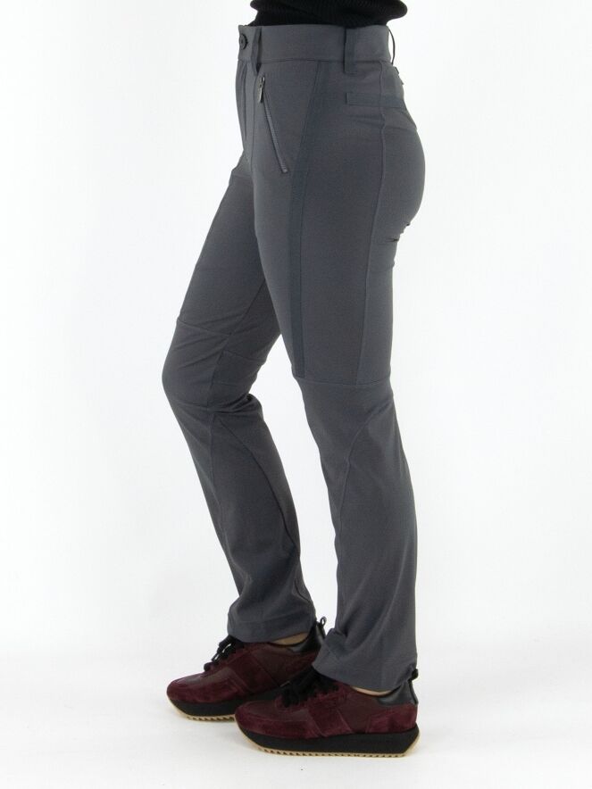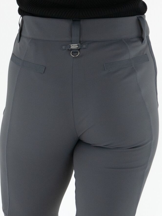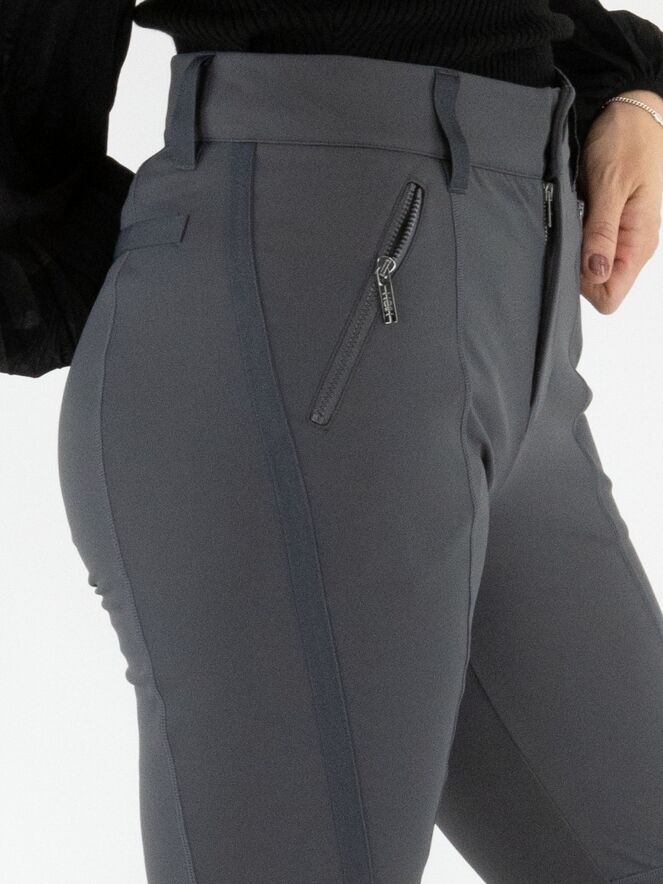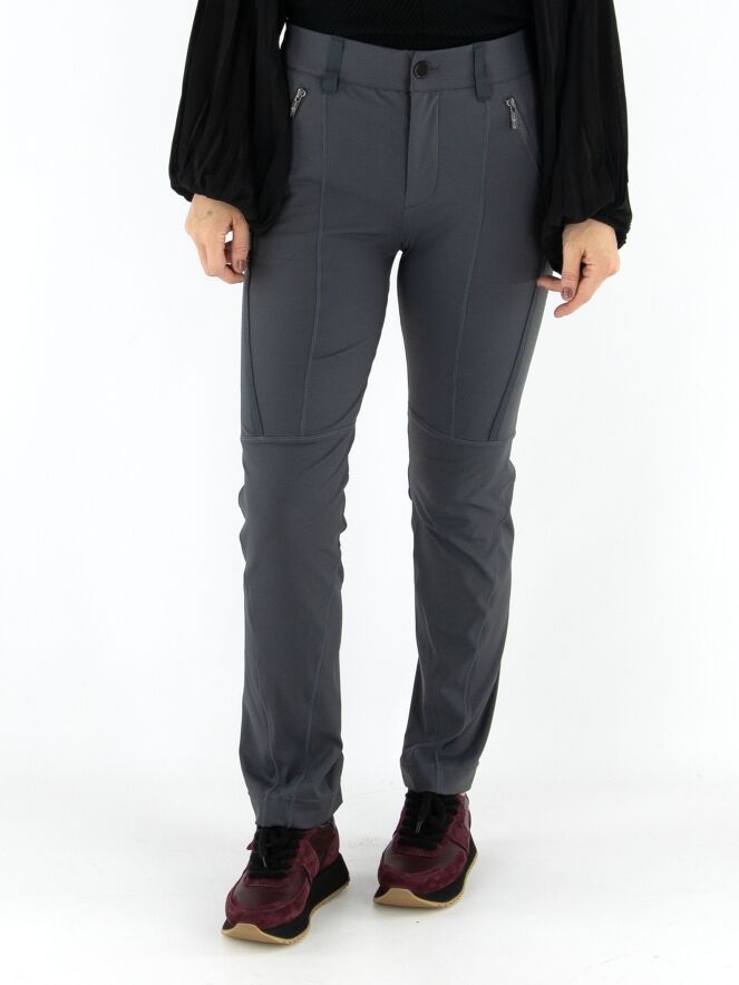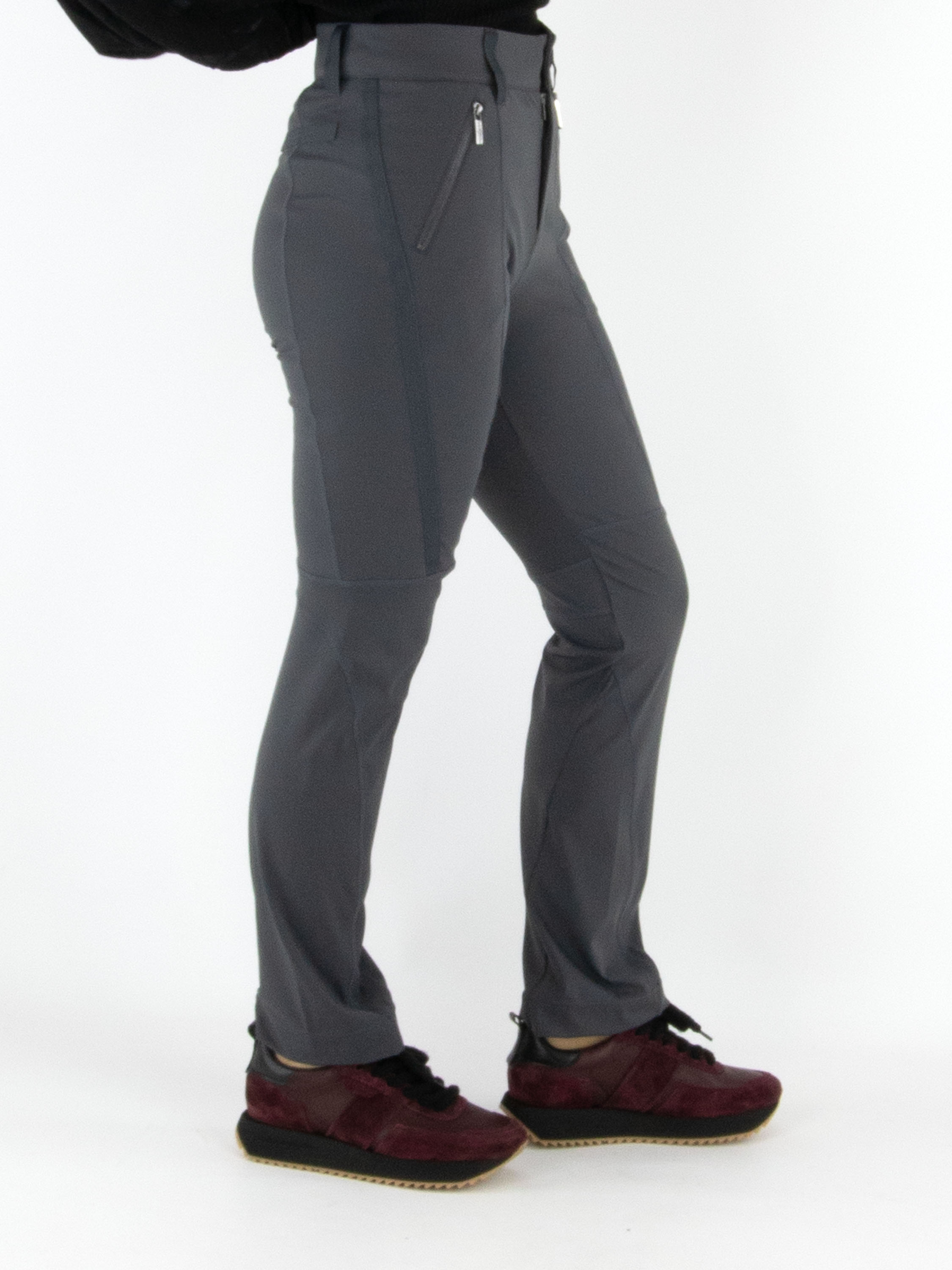A pair of trousers by High in grey. The front pockets are finished with zip closures. The trousers are detailed with multiple diagonal, vertical and horizontal seams and piping. These trousers can be hand-washed.