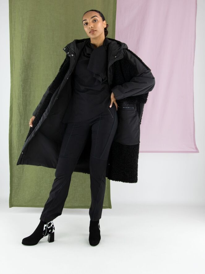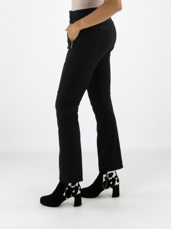 Trousers by High in black. The front pockets are equipped with zippers. The design features multiple diagonal, vertical, and horizontal seams and piped details. These trousers should be hand-washed.