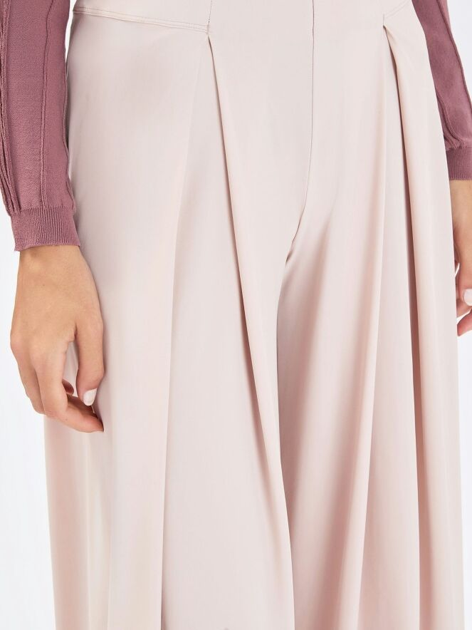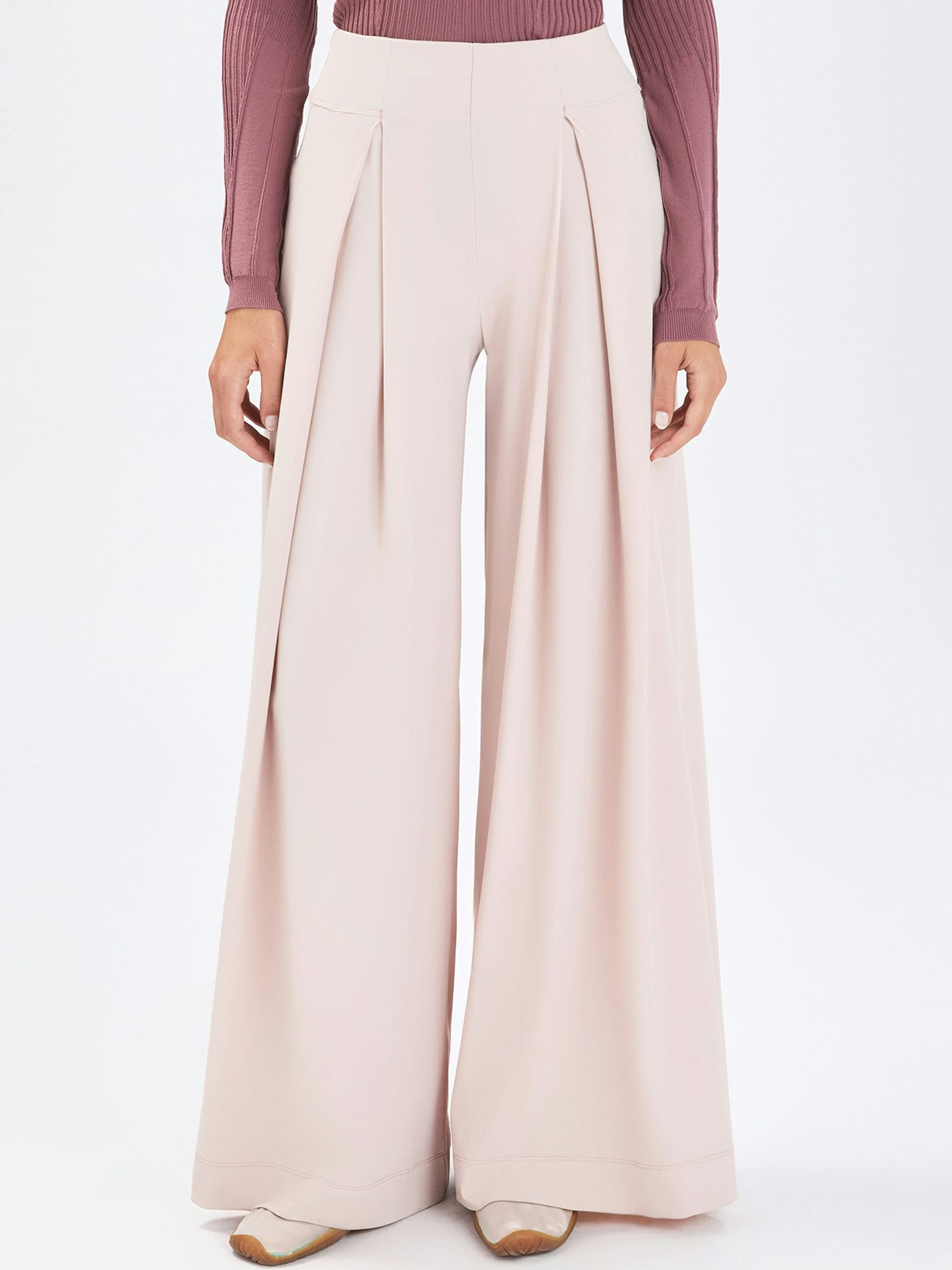 Wide-leg trousers by High in a soft nude shade. The waistband features an elastic band for a comfortable fit. Two pleats below the waist create an elegant and fluid drape. These trousers can be washed at 30 degrees.