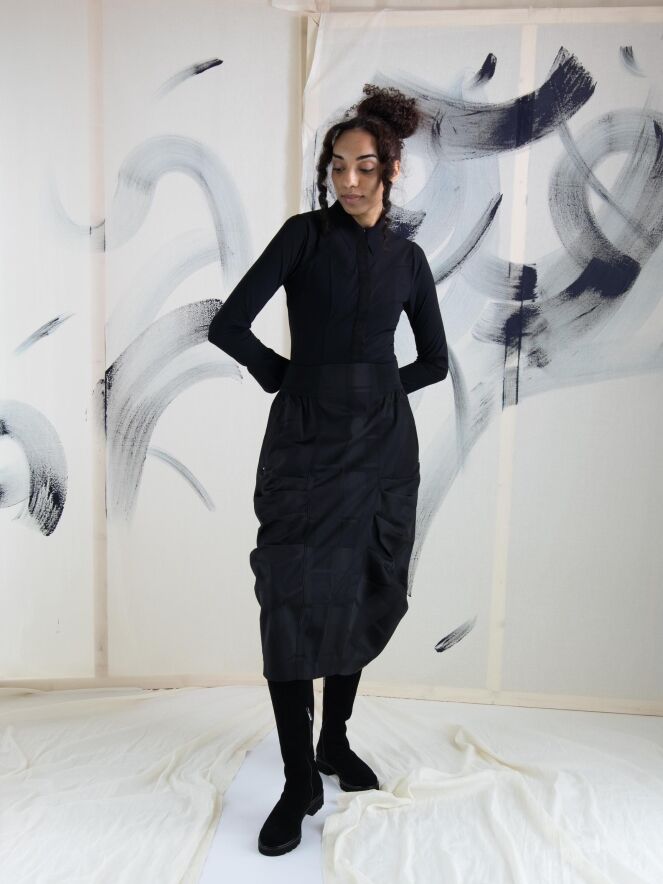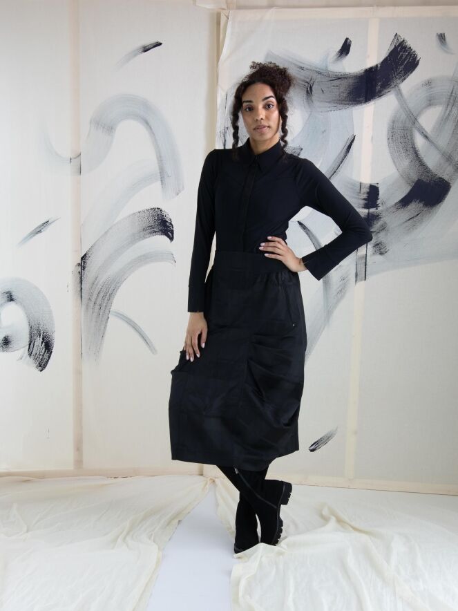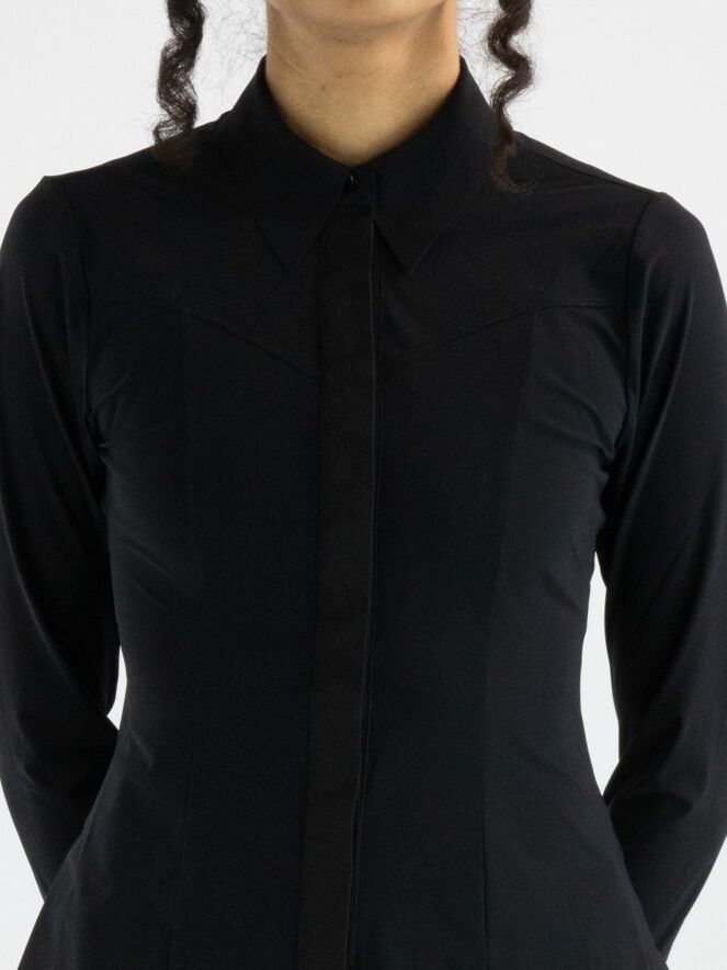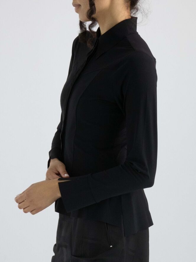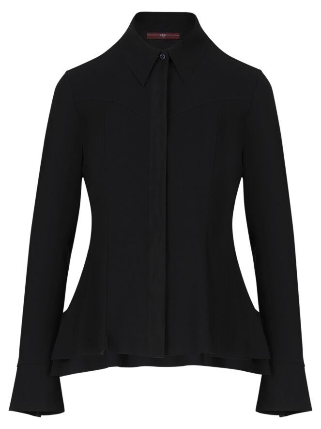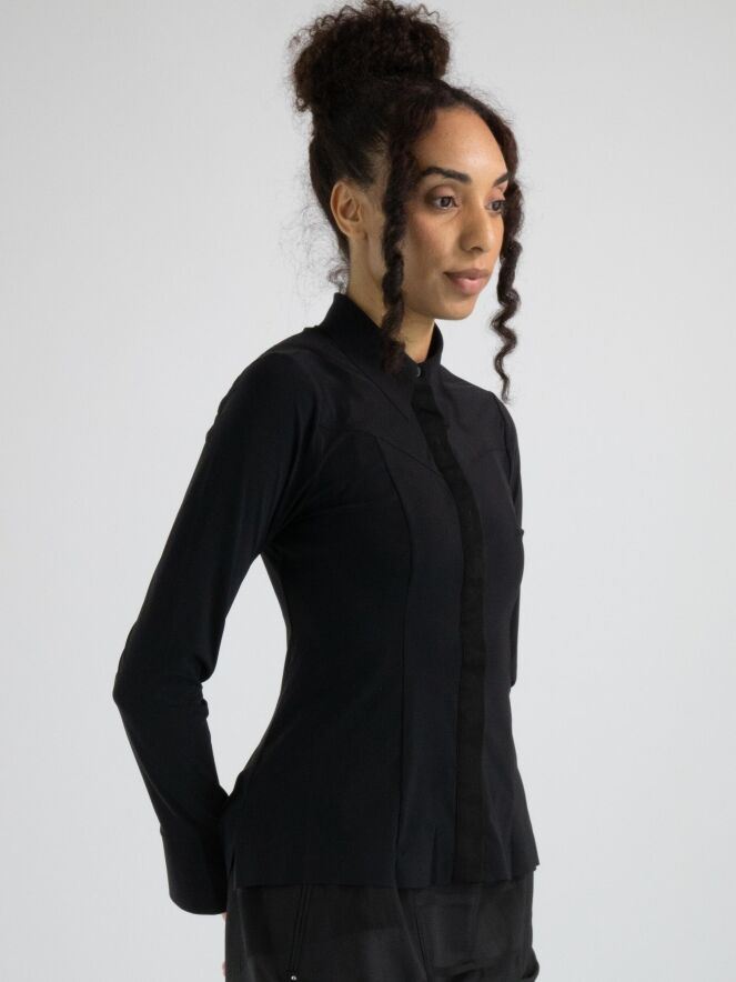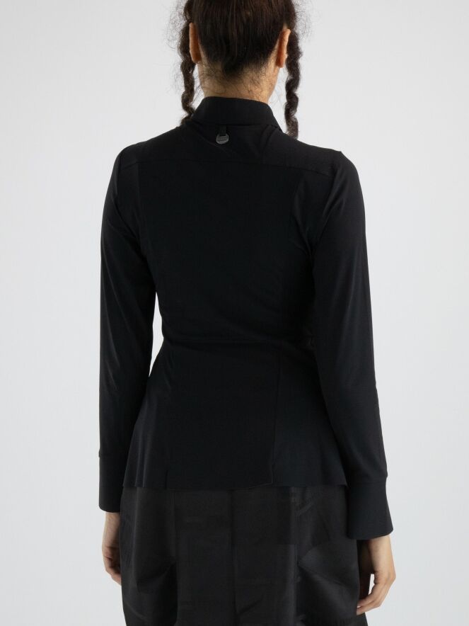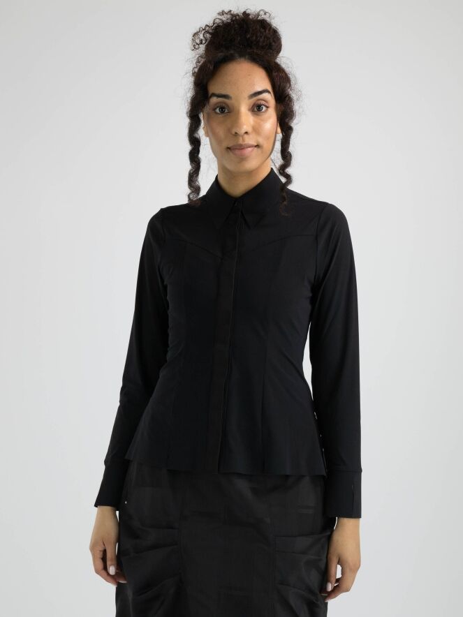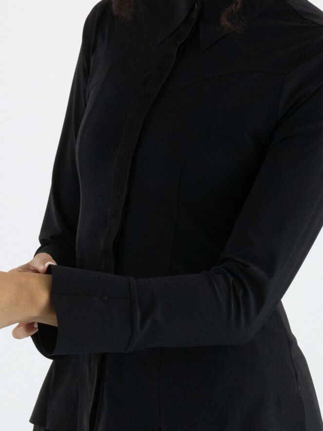 A black blouse from High that slightly flares out. The long sleeves end with a delicate elastic V-split. This blouse can be washed at 30 degrees.