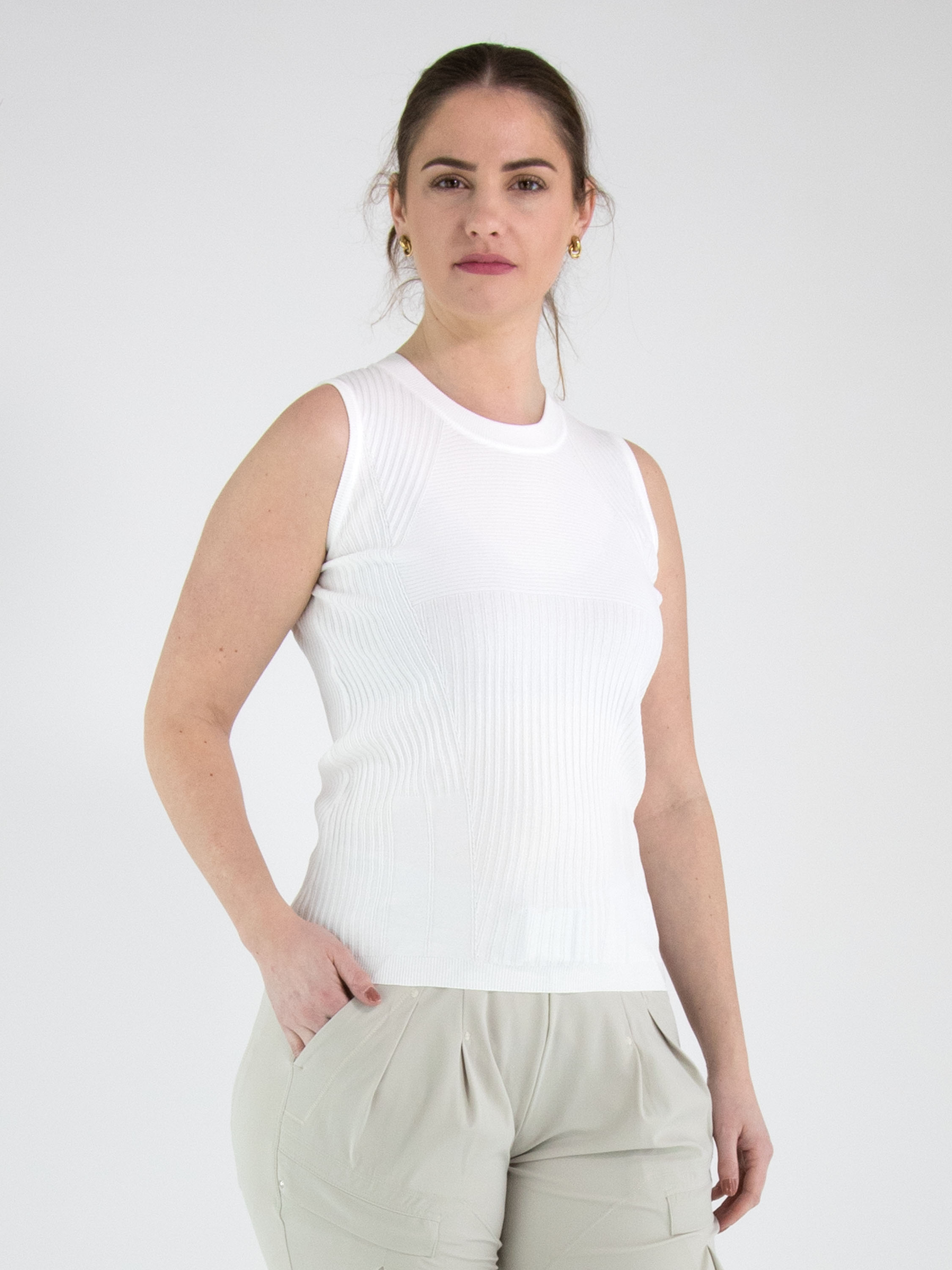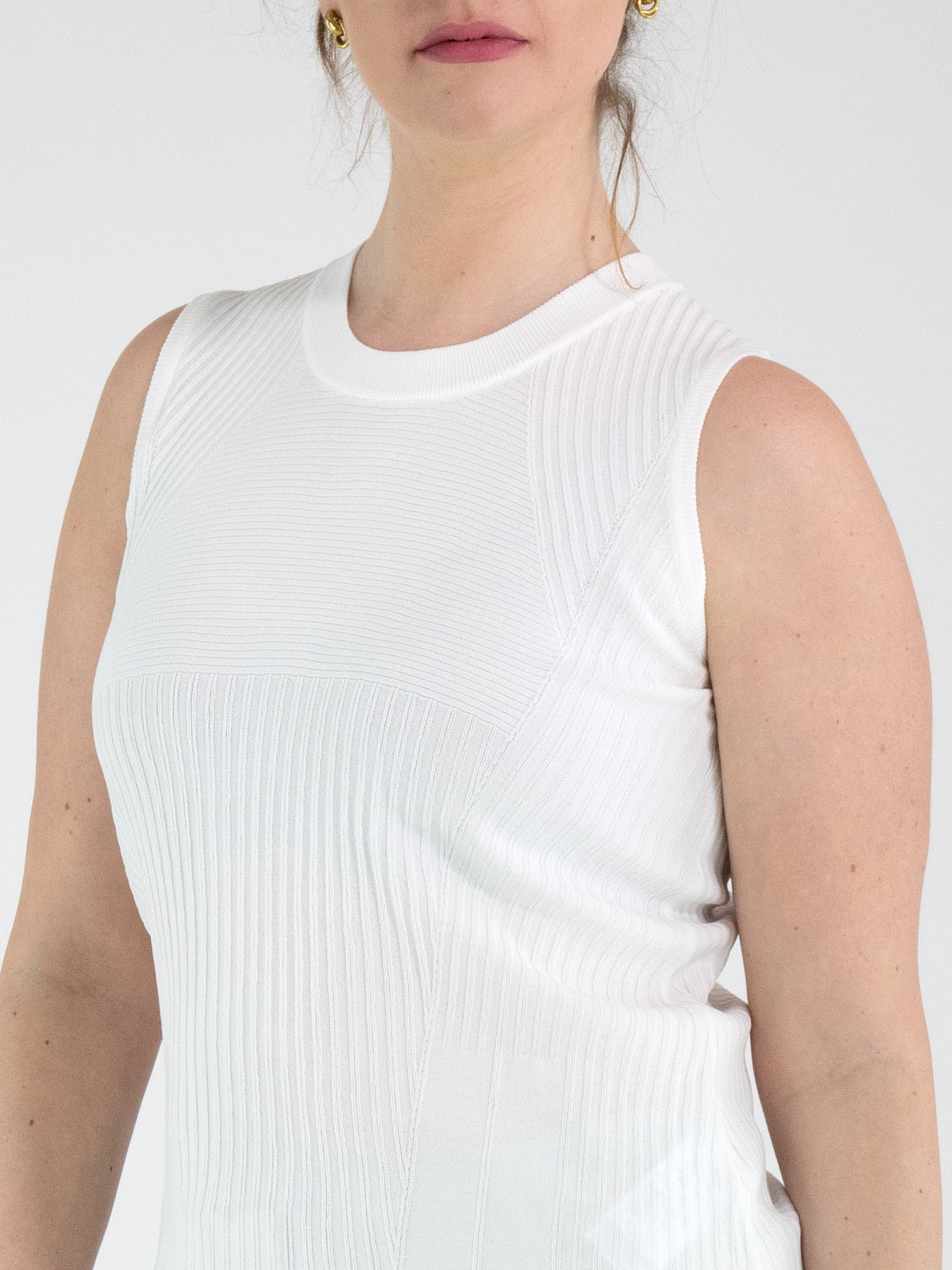 A top from High in an off-white colour. The top features a striped texture running horizontally, vertically and diagonally. Along the edge of the round neckline, there is a finely ribbed knit trim. This top can be hand-washed.