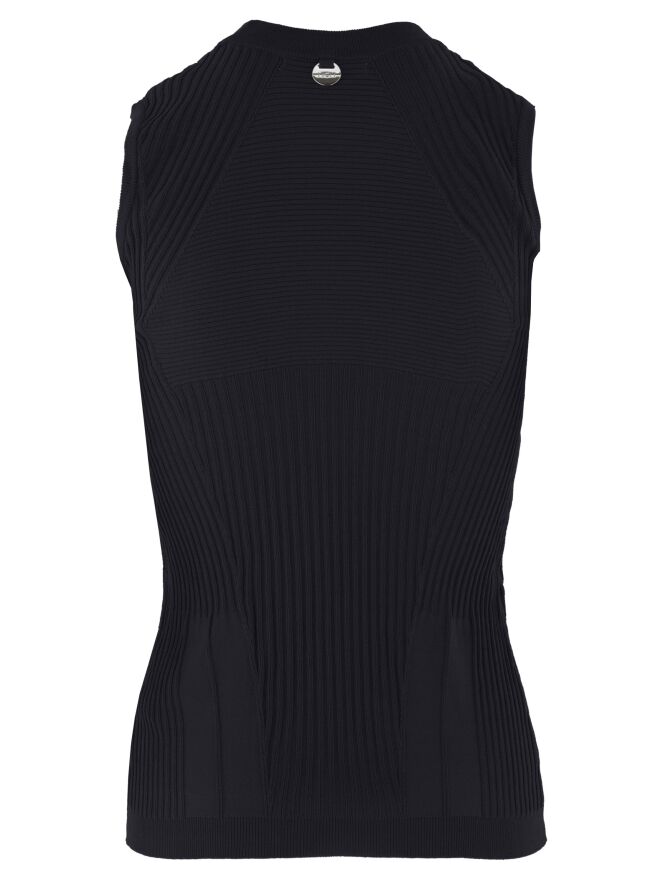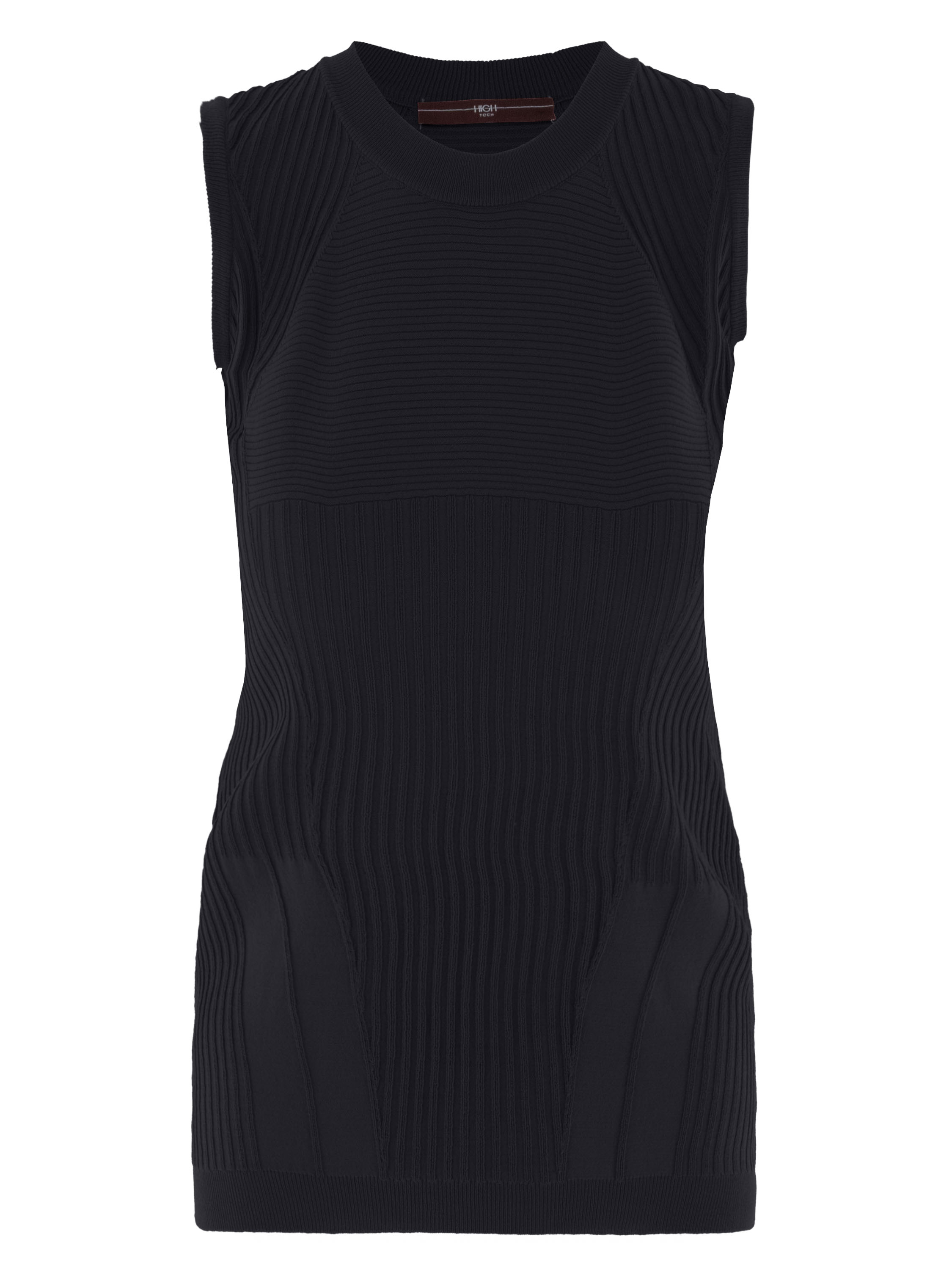 A top from High in a navy blue colour. The top features a striped structure running horizontally, vertically and diagonally. Along the edge of the round neckline, there is a finely ribbed knit trim. This top can be hand-washed.