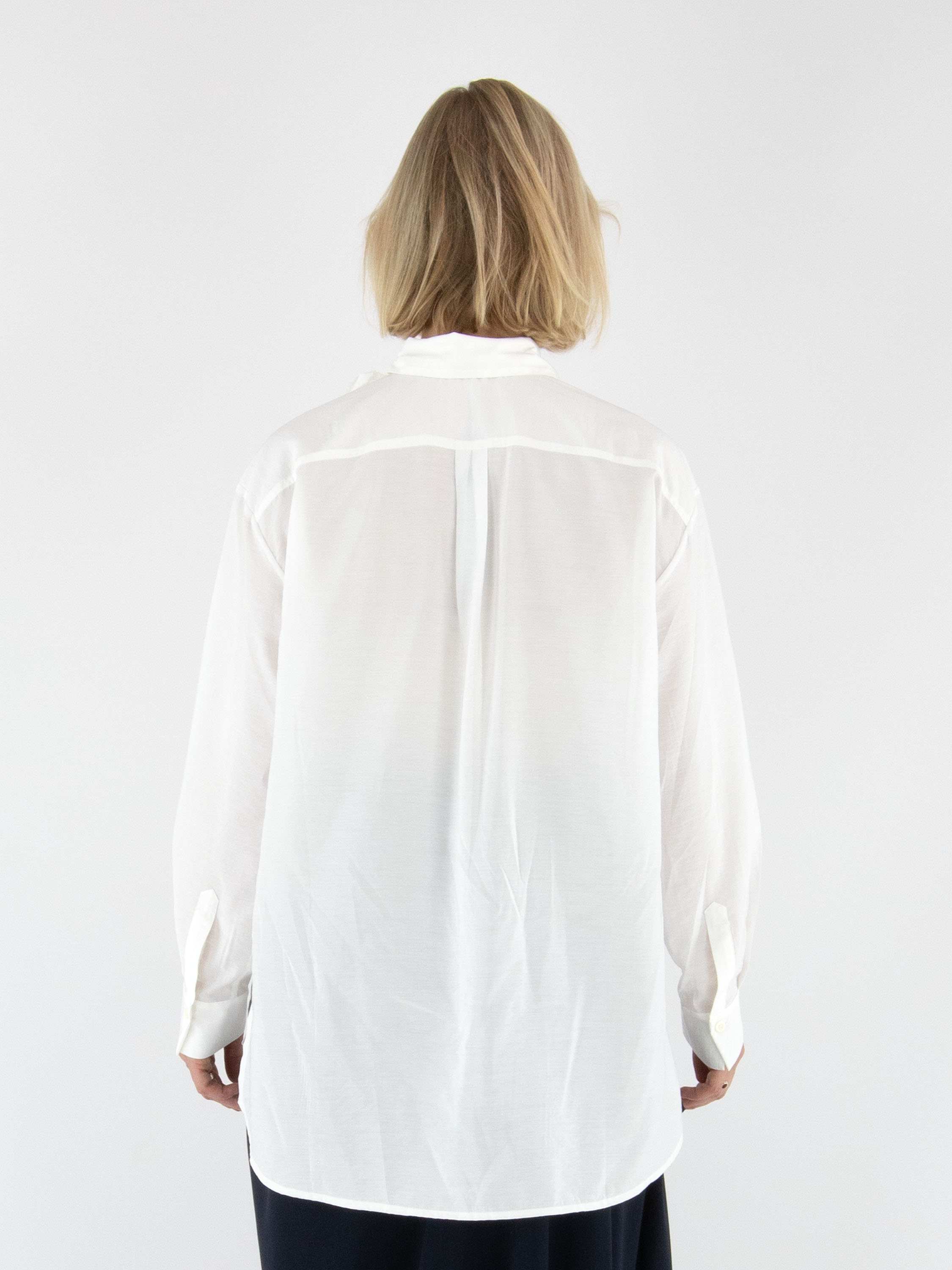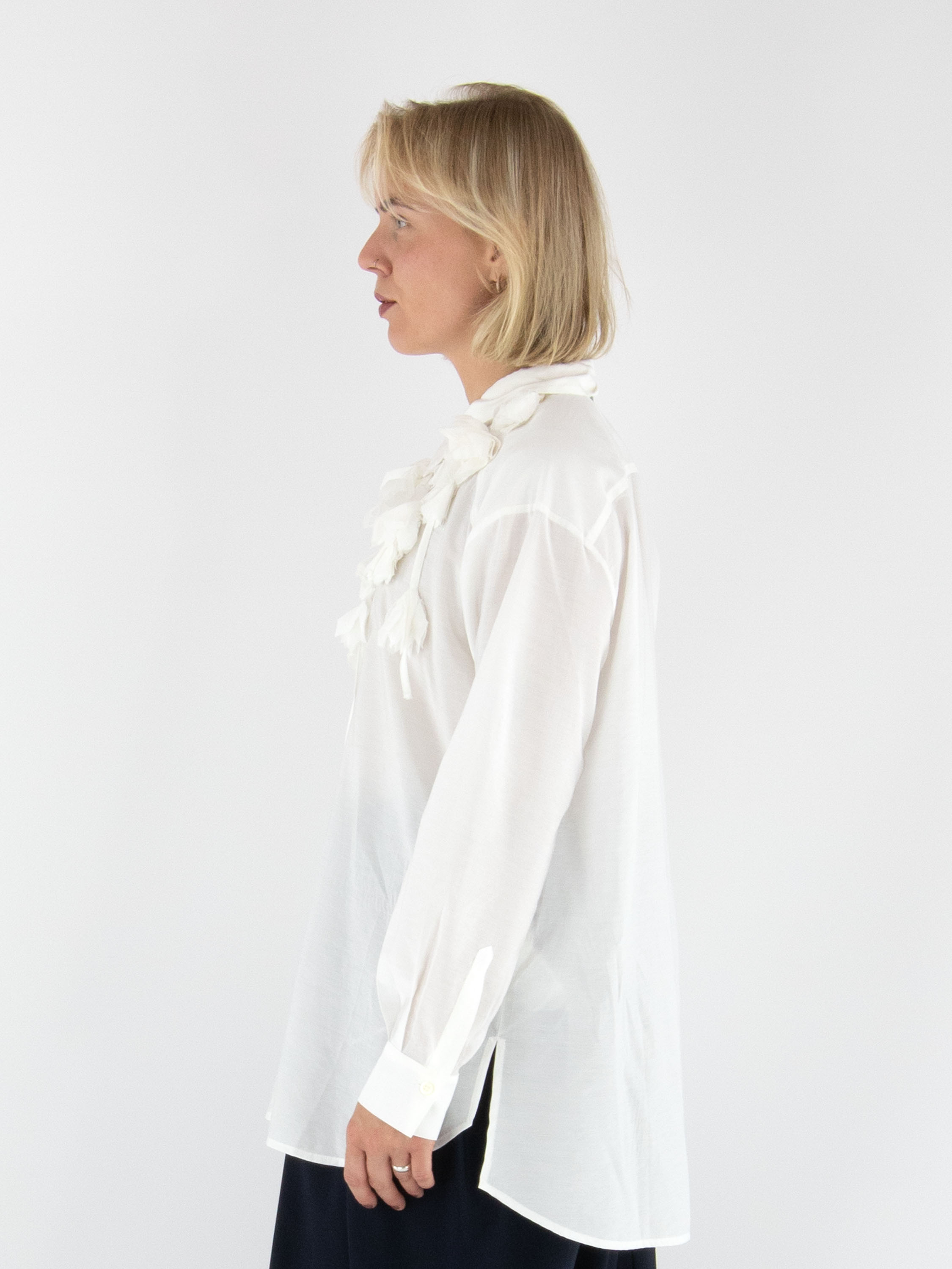 A long, wide blouse from High in matte satin in off-white. Flowing from the collar are three ribbons adorned with flowers crafted from the same fabric as the blouse, creating a refined and artistic detail. This blouse can be hand-washed.