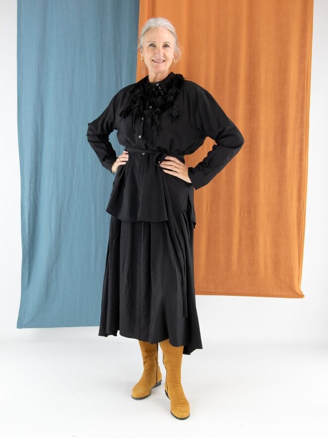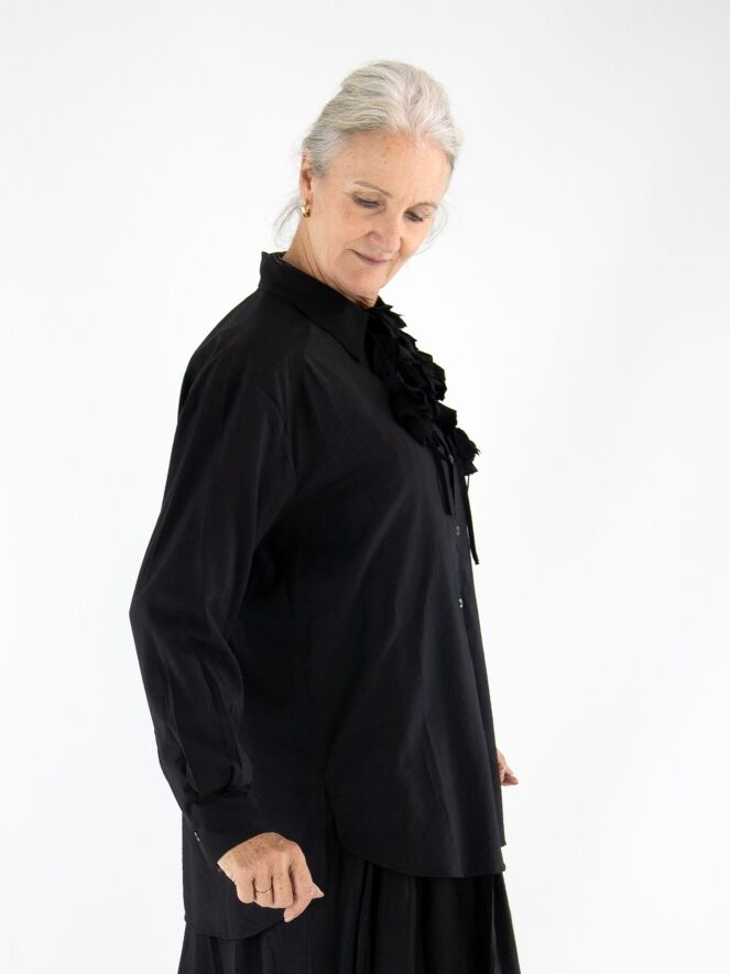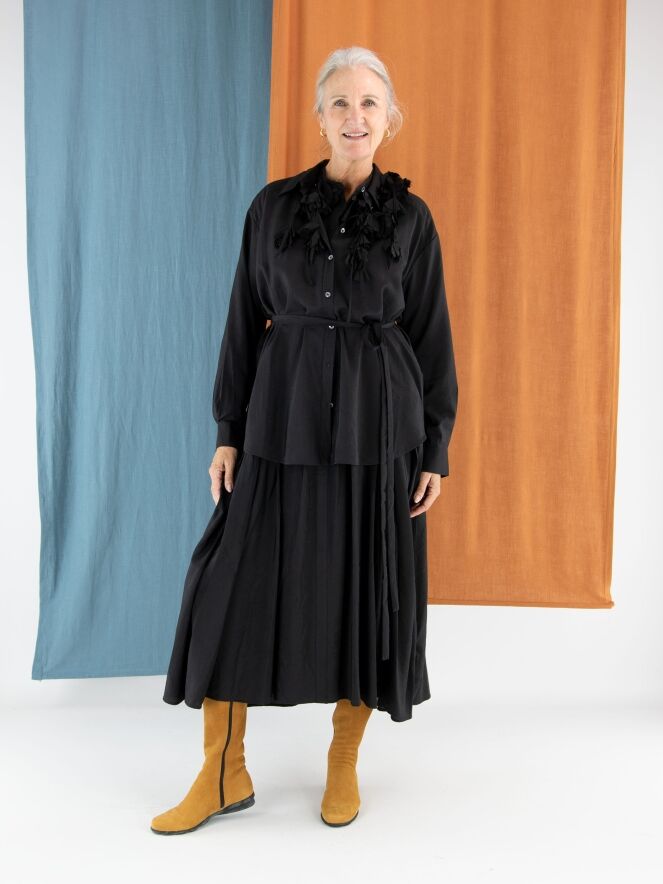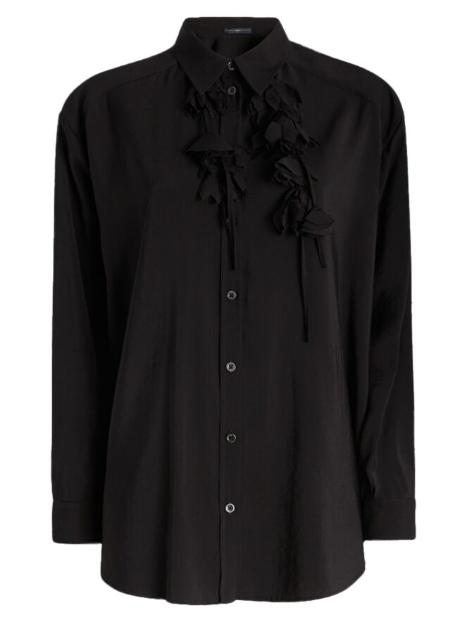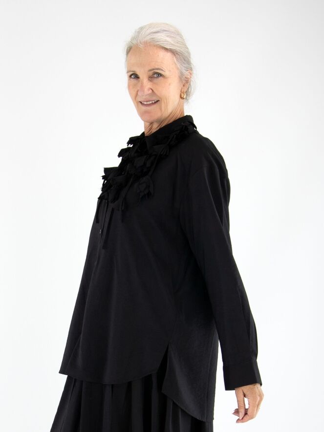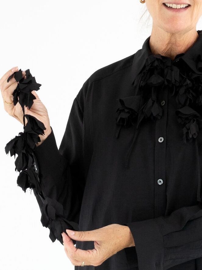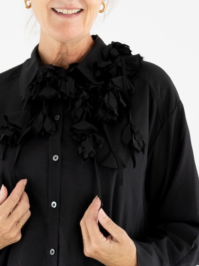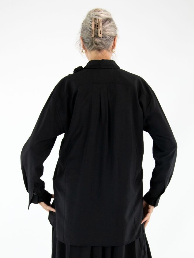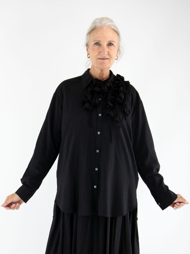 A long, wide blouse from High in matte satin fabric in black. From the collar fall three ribbons adorned with flowers crafted from the same fabric as the blouse. This unique detail lends the design an artistic and refined touch. The blouse can be hand-washed.