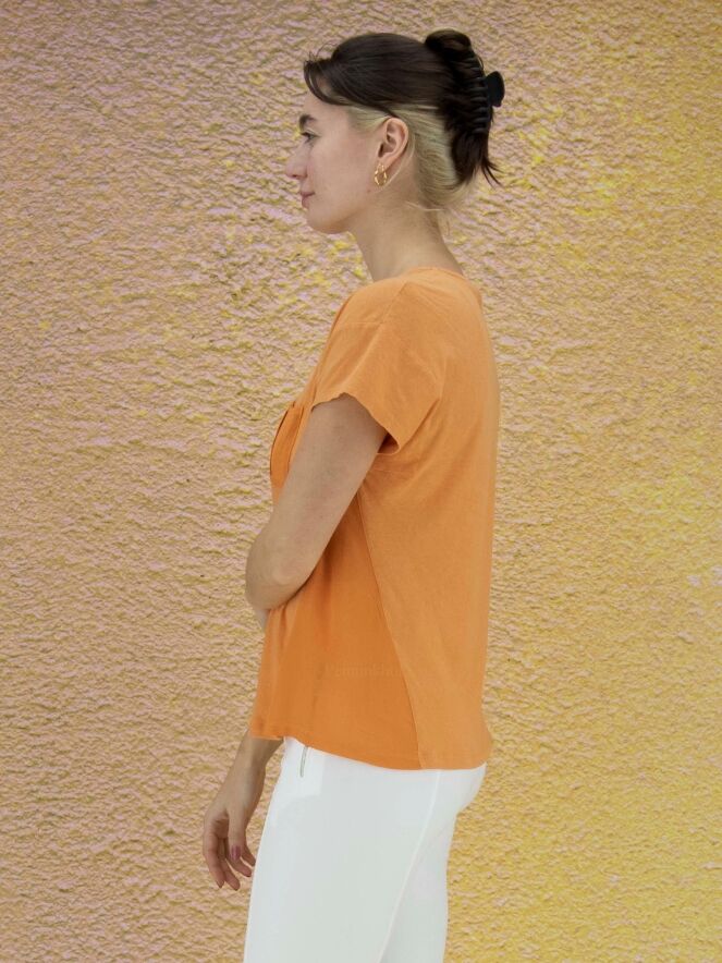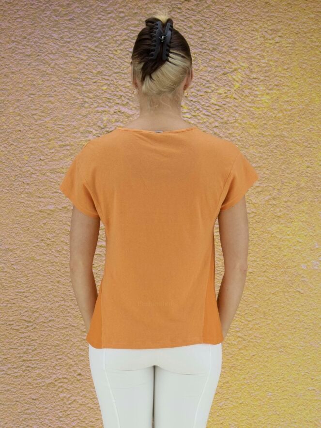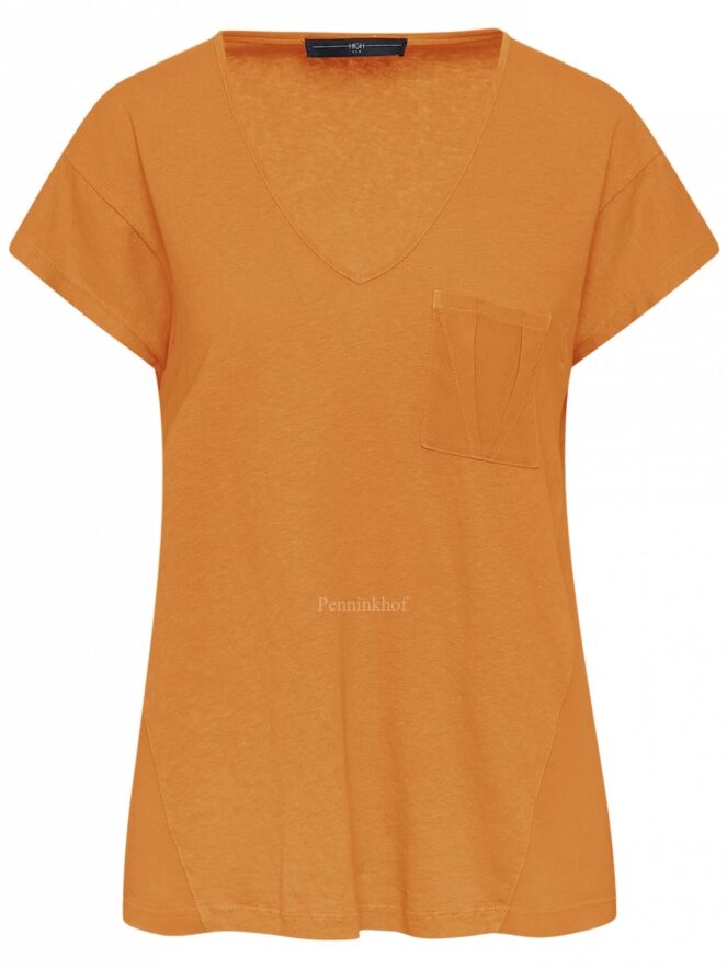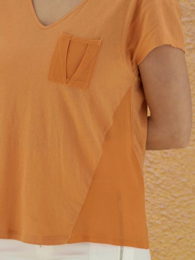 A shirt from High in the color orange. The shirt has a V - Neck. The breast pocket and the sides have a slightly transparent crepe fabric. This shirt can be hand washed.