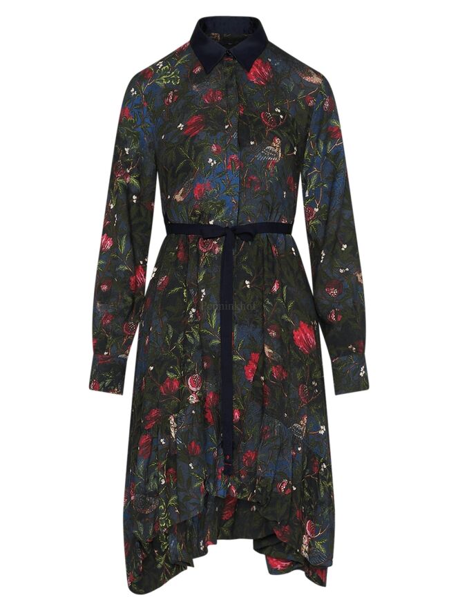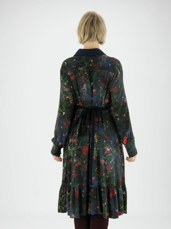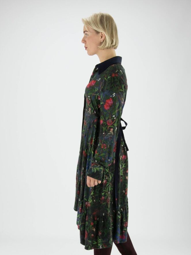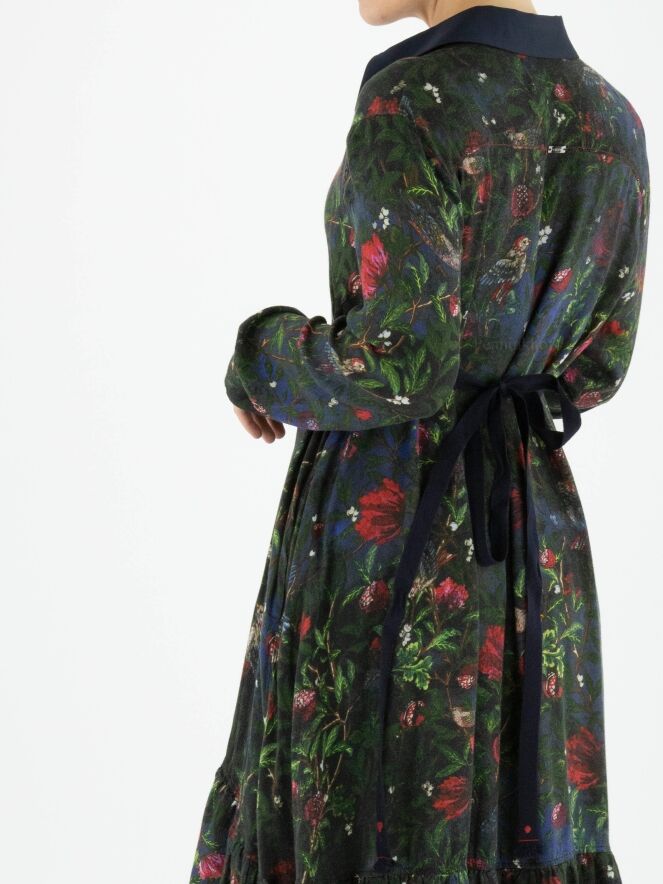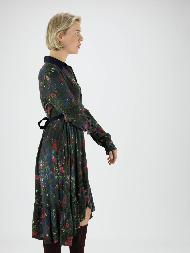 A button-through dress from High in a print of flowers, birds and leaves with the colours red, green and blue. At waist level is a narrow navy blue belt. The collar is in a plain colour and this dress should not be washed.