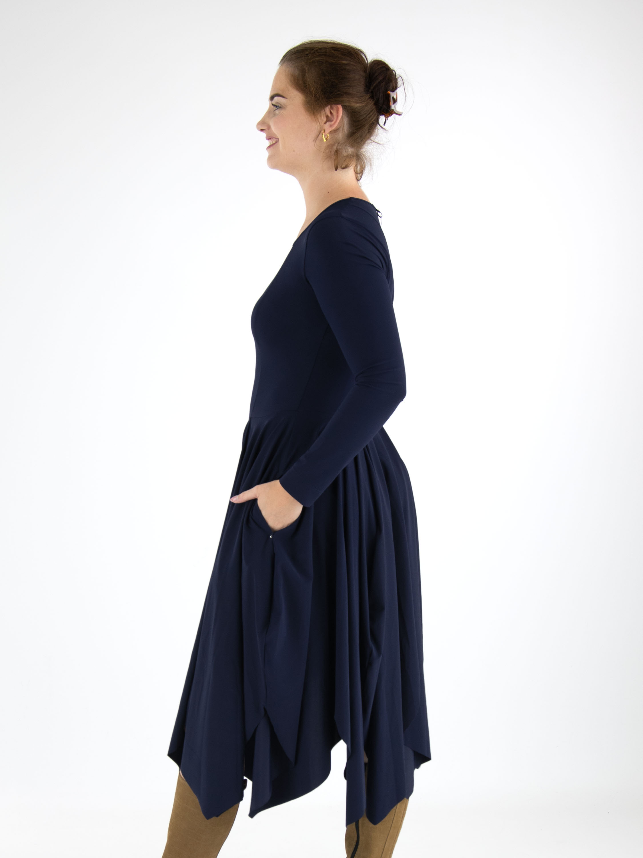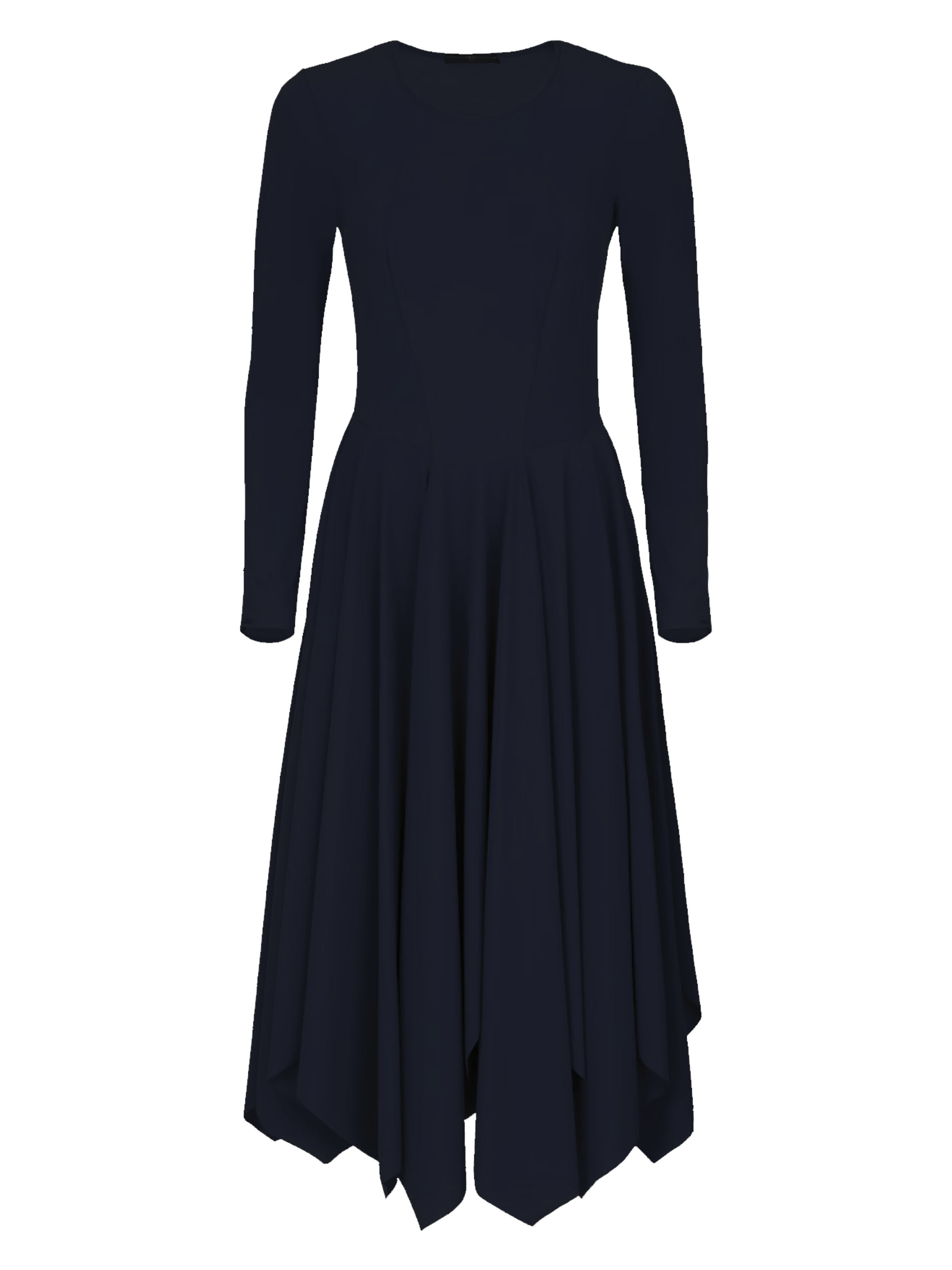 A dress from High in midnight blue. The dress has long sleeves and a high round neckline. The top is slim-fitted, and from the waist, the dress flares out into a very wide A-line with slits. Just below the waist are pockets. This dress can be washed at 30 degrees.