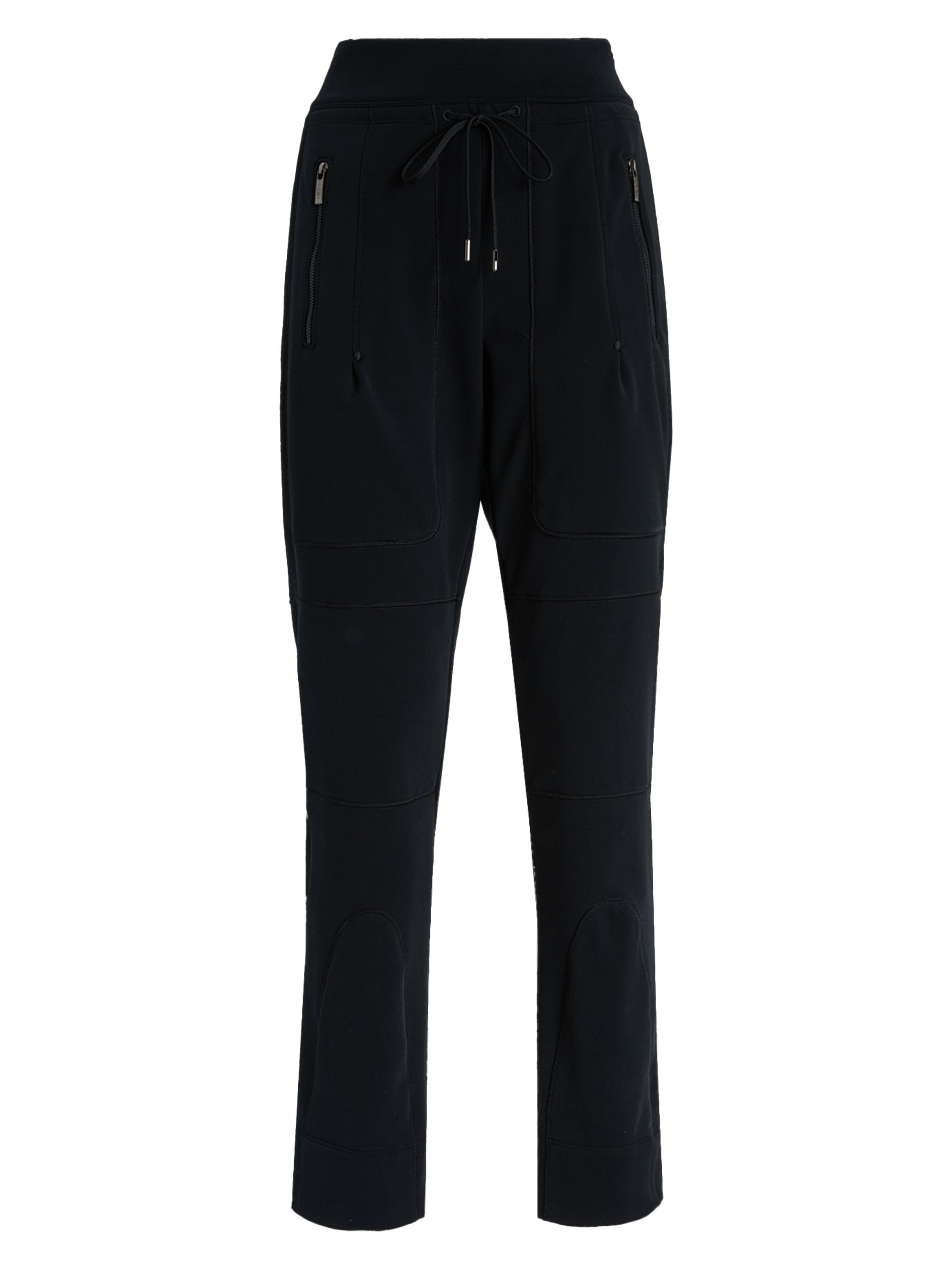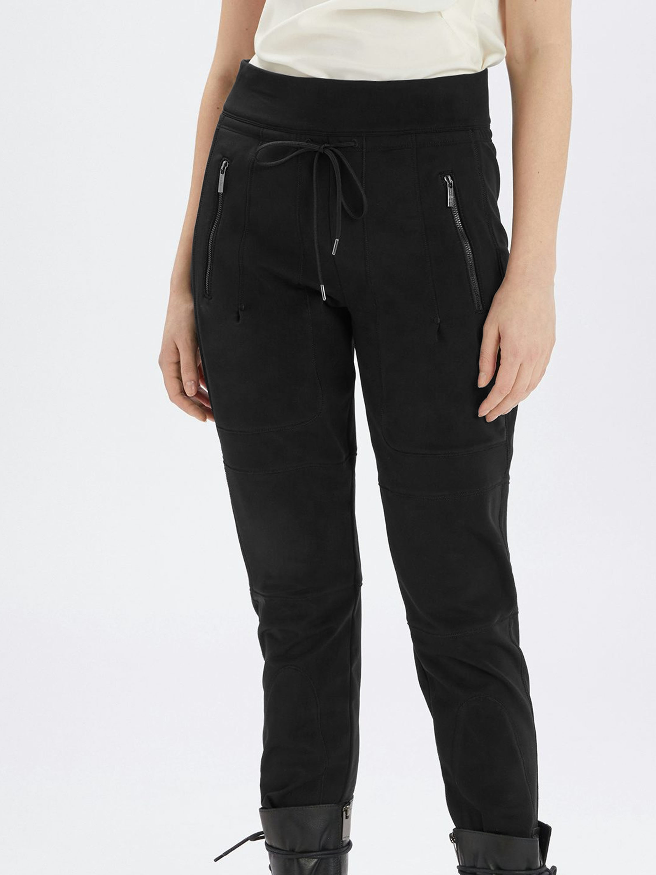 Trousers by High in black. The waistband features an elastic band with a drawstring in a tunnel design, allowing the trousers to be adjusted. The trousers are detailed with decorative stitching near the pockets and on the lower leg. The pockets are finished with zip closures. These trousers can be washed at 30 degrees.