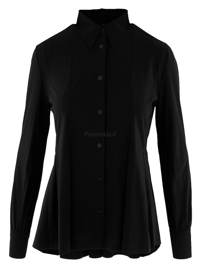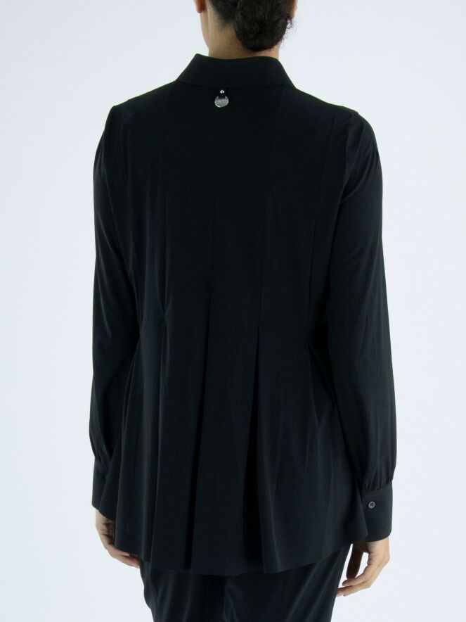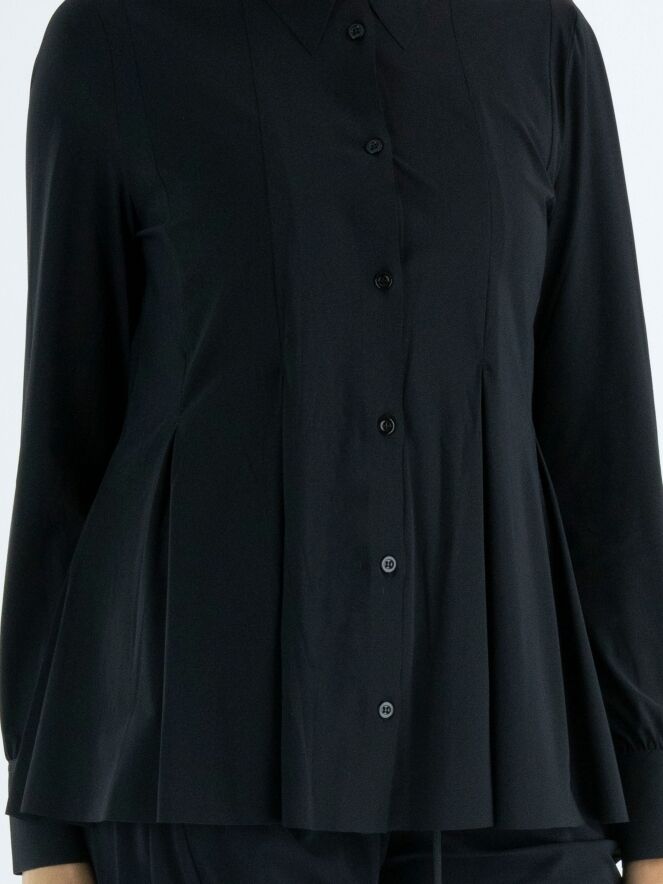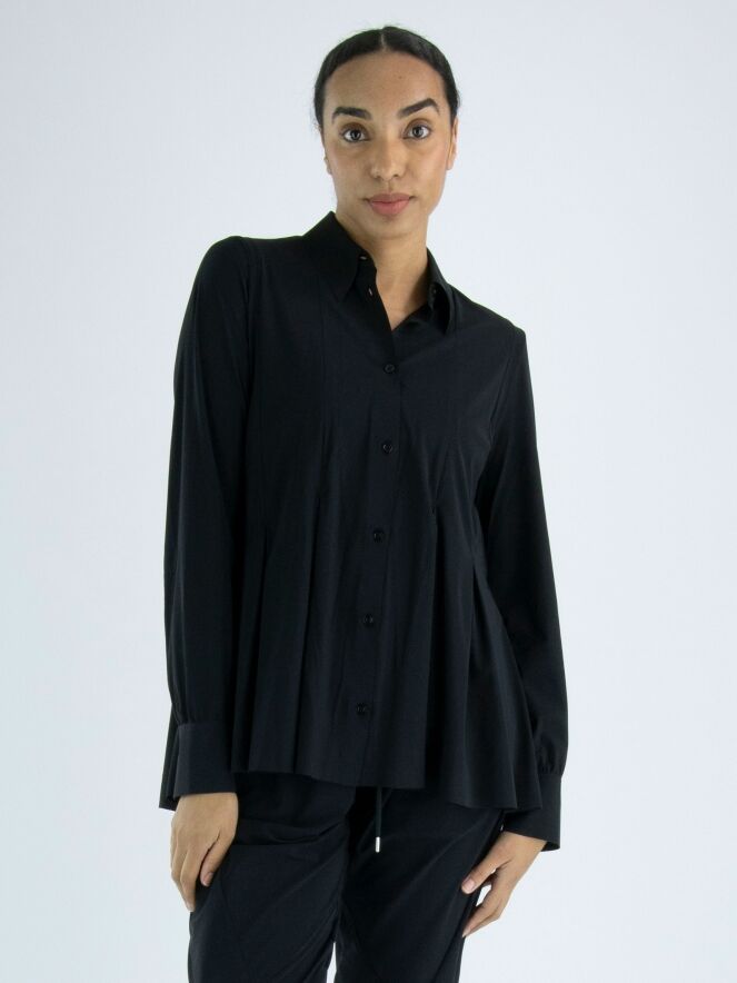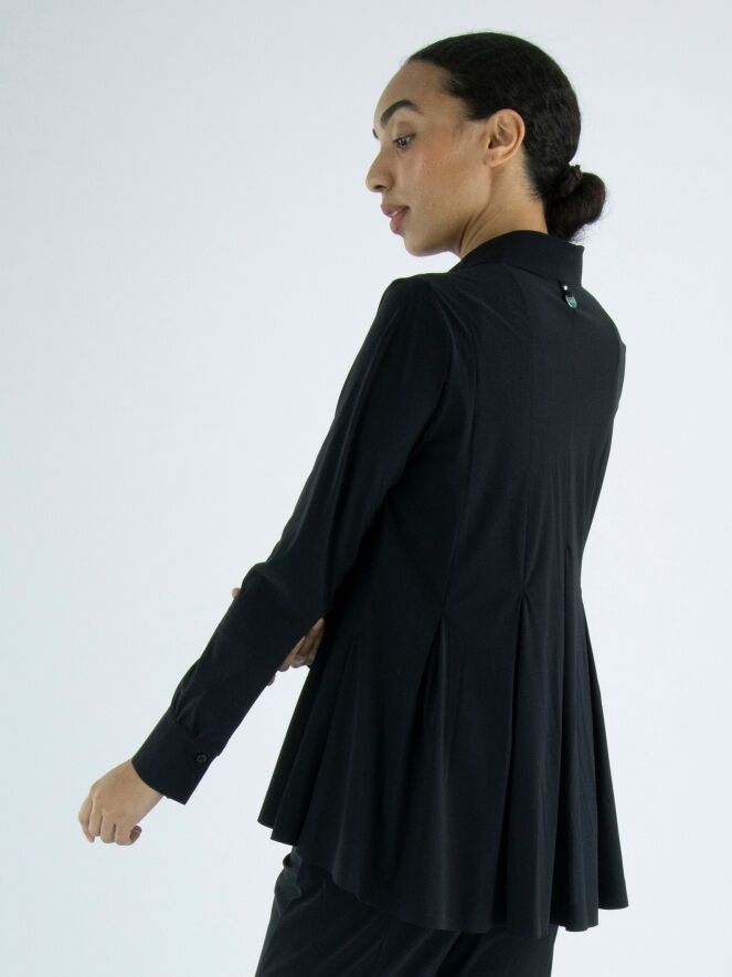 A cardigan or blouse by High in black. From the waist, there are multiple band pleats, giving the cardigan an A-line shape from the waist. This cardigan can be hand washed.