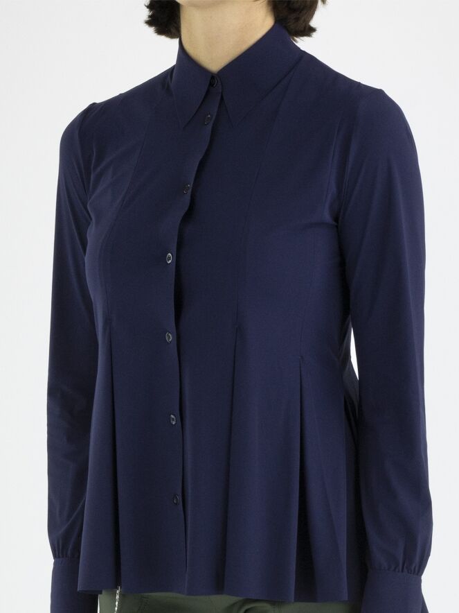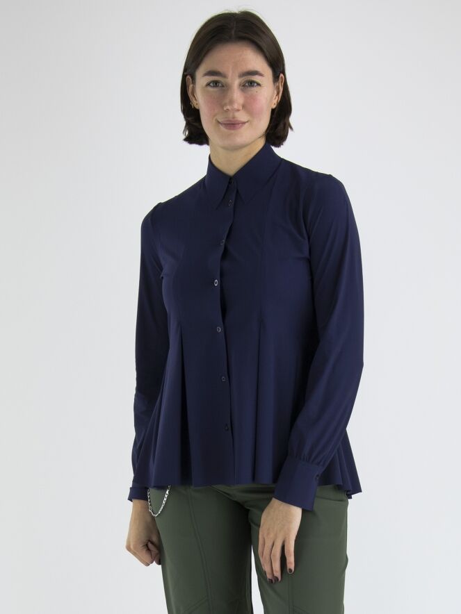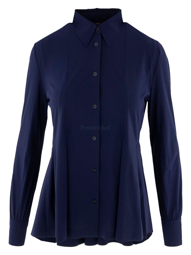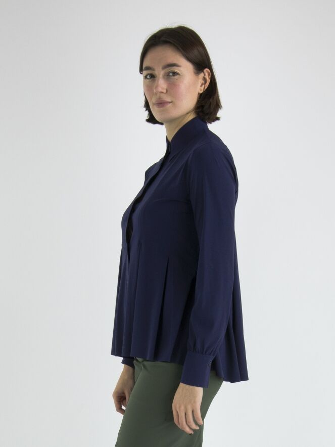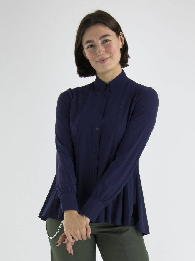 A cardigan or blouse by High in midnight blue. From the waist, there are multiple band pleats, giving the cardigan an A-line shape from the waist. This cardigan can be hand washed.