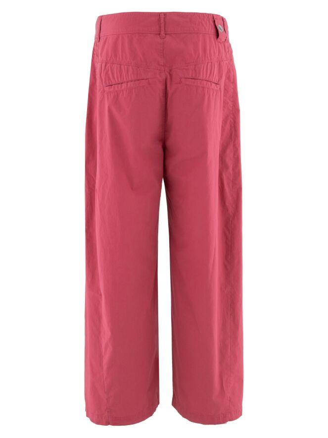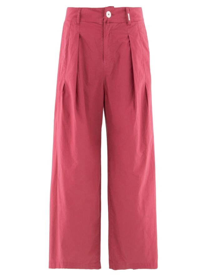 Trousers by High in a lightweight summer cotton fabric in raspberry red. Pleats from the waistband create a fluid and feminine fit. Featuring side pockets, these exclusive designer trousers can be washed at 30 degrees.