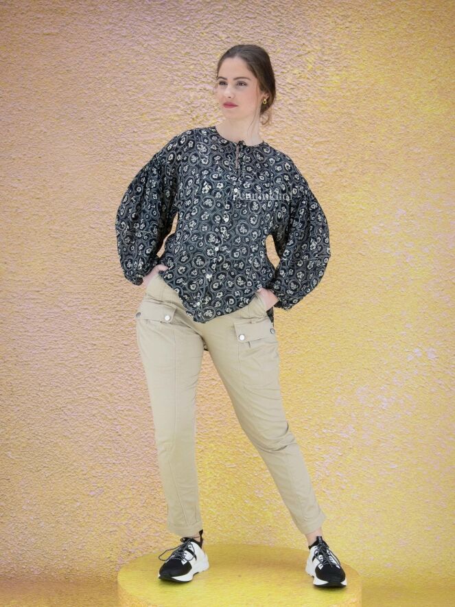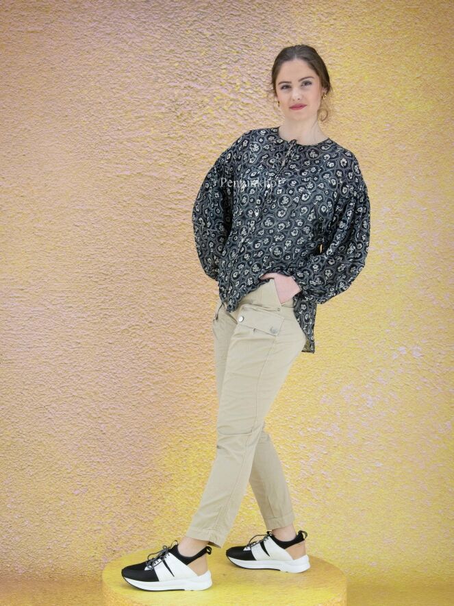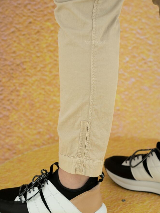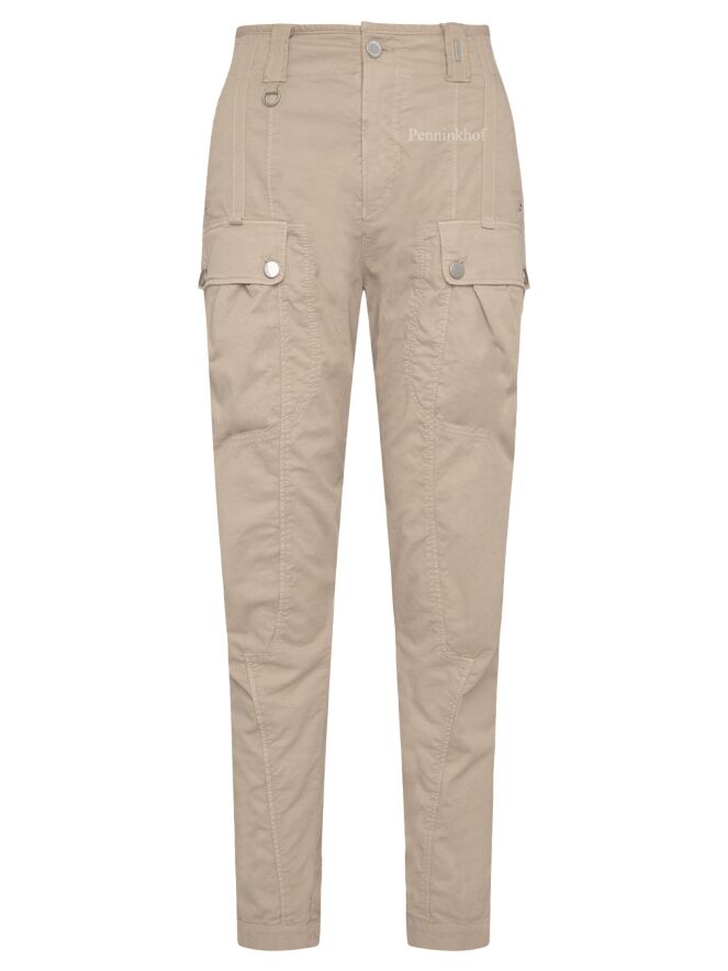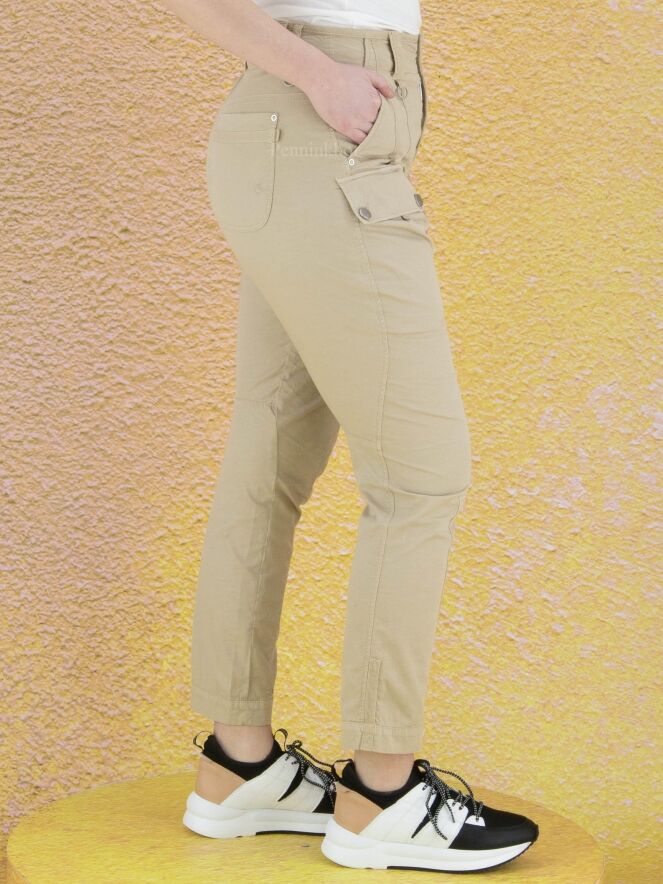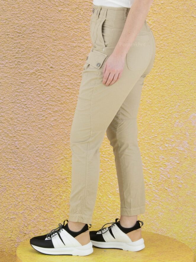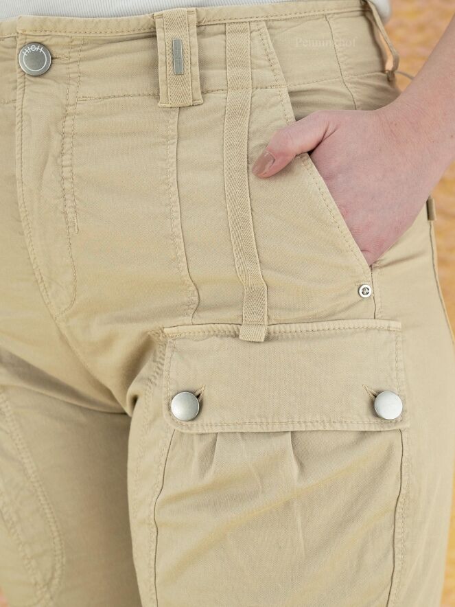 Pants from High in the color beige. There are pockets on the thigh from the knee, the legs have a slim line. The pants have side pockets and can be washed by hand.