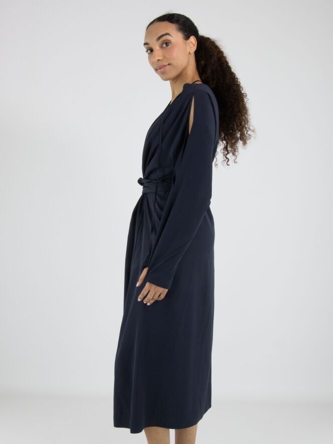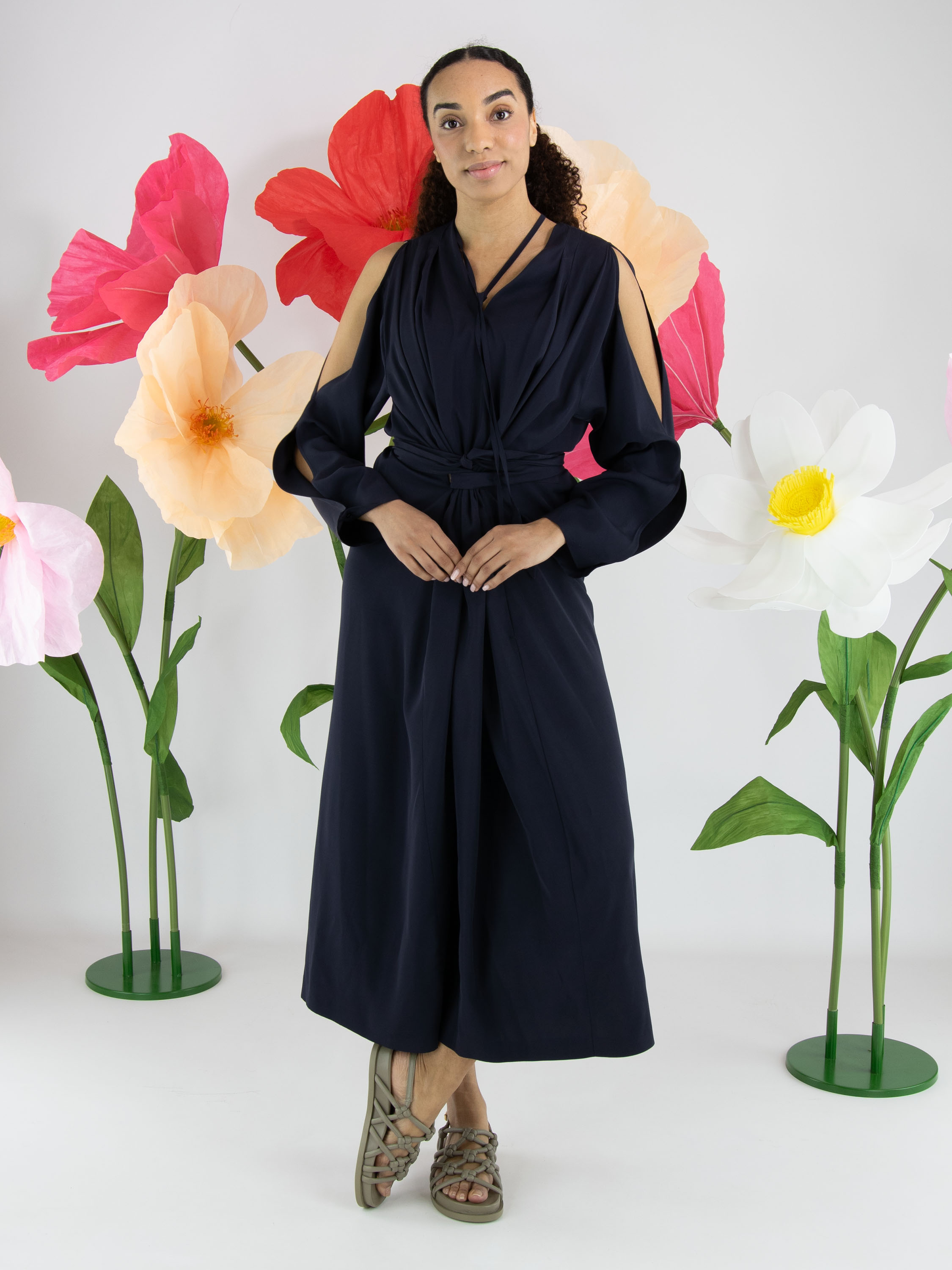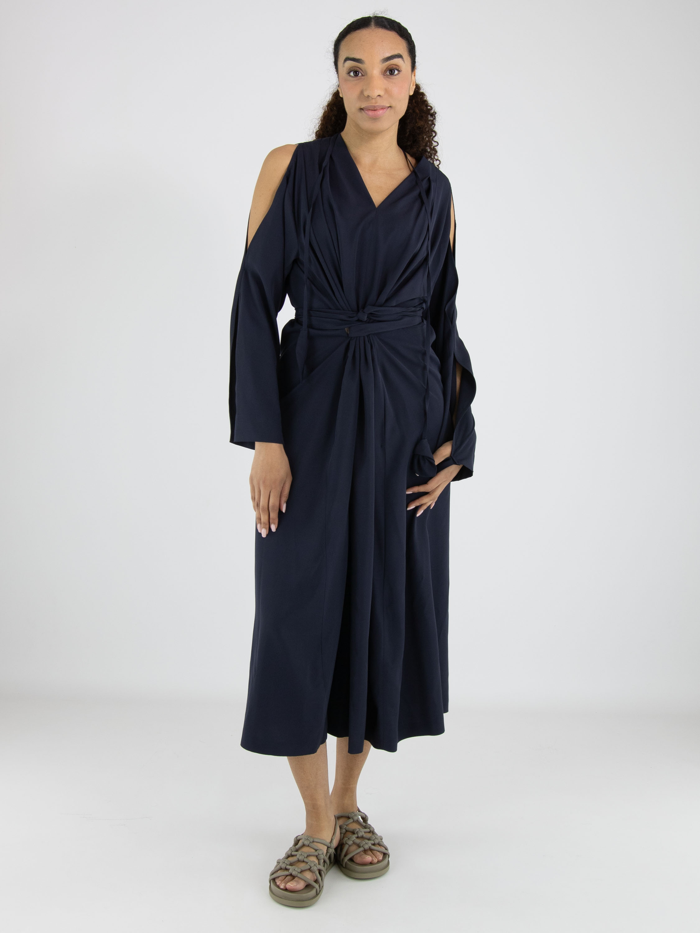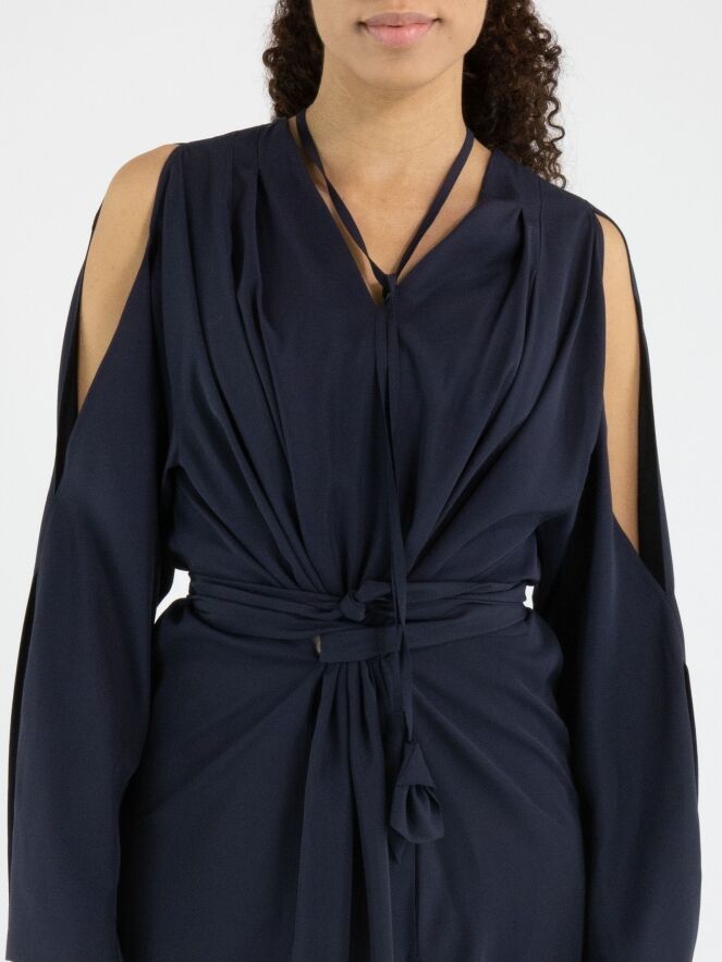 Dress by High in an elegant navy blue shade. From the sides of the V-neckline, two pleats on each side create a refined and fluid drape. Two long ribbons extend from the neckline, finished with decorative leaf-shaped ends that add an artistic and playful detail. A belt at the waist continues towards the inside of the dress at the sides, subtly shaping the silhouette. The upper part of the sleeves is open from the shoulder to the elbow. Side pockets are placed at waist level. This dress should not be washed.
