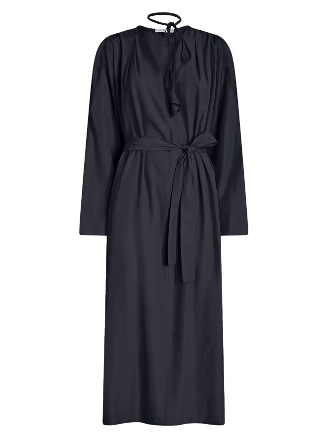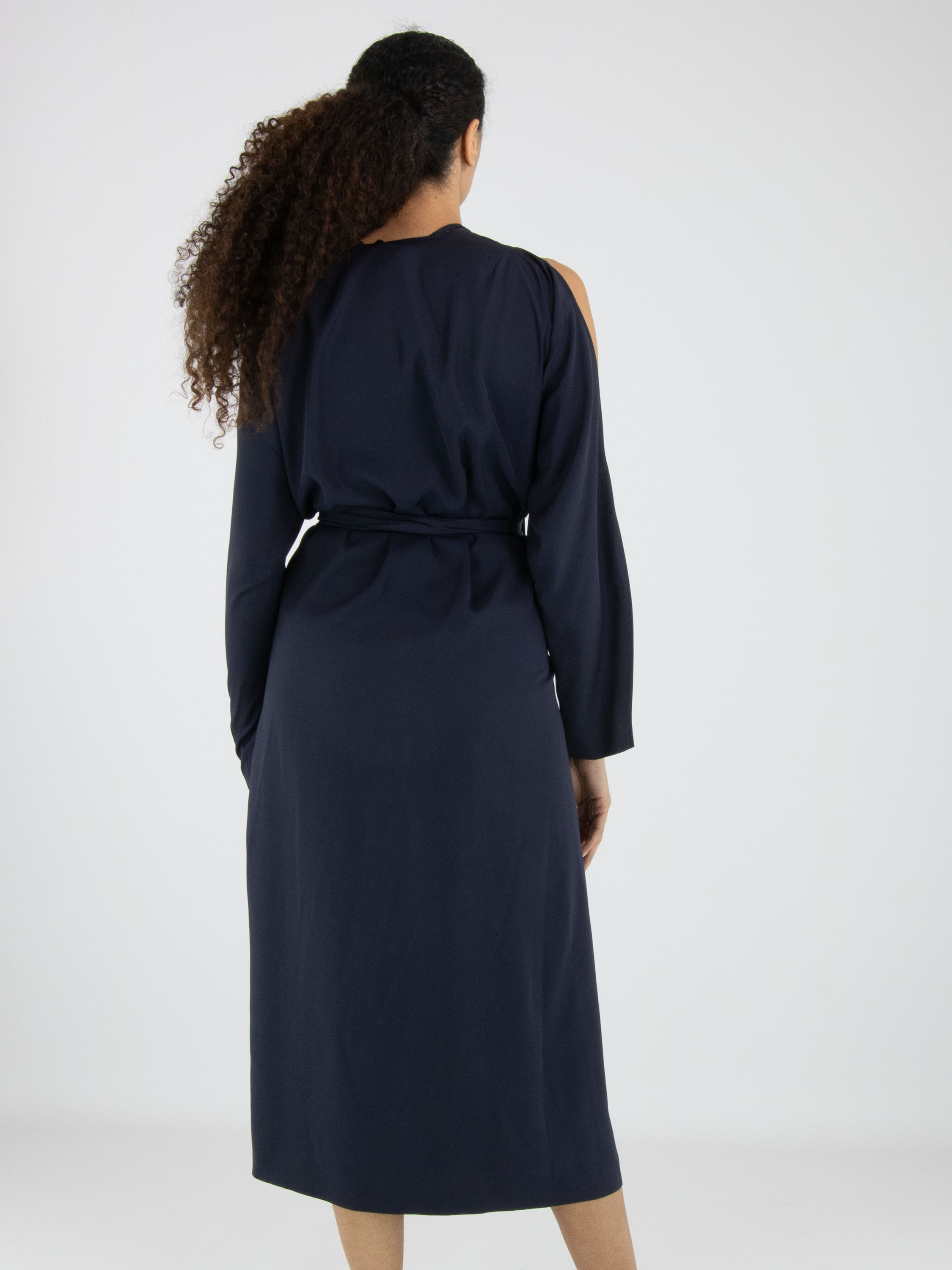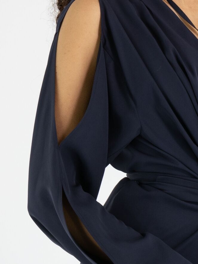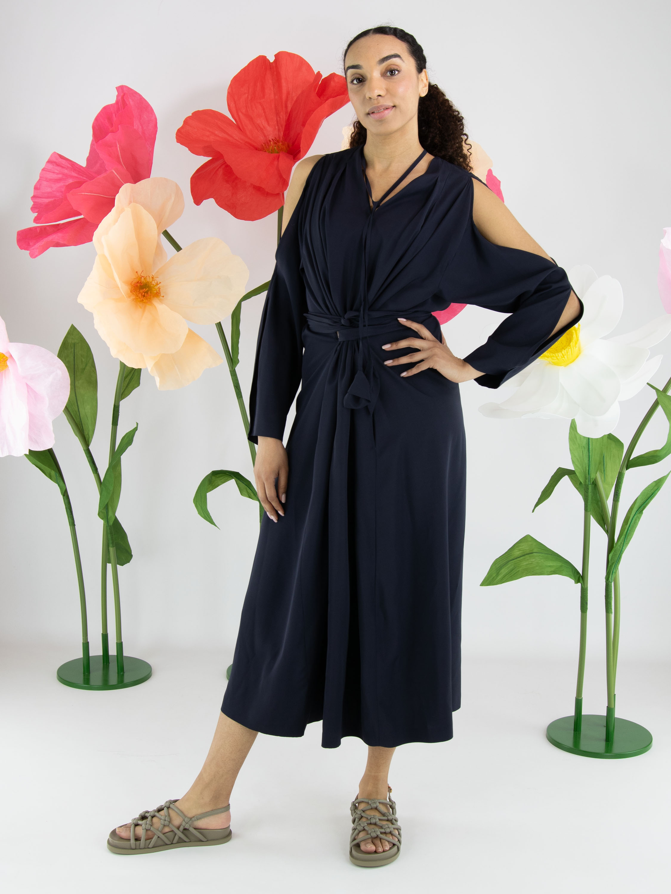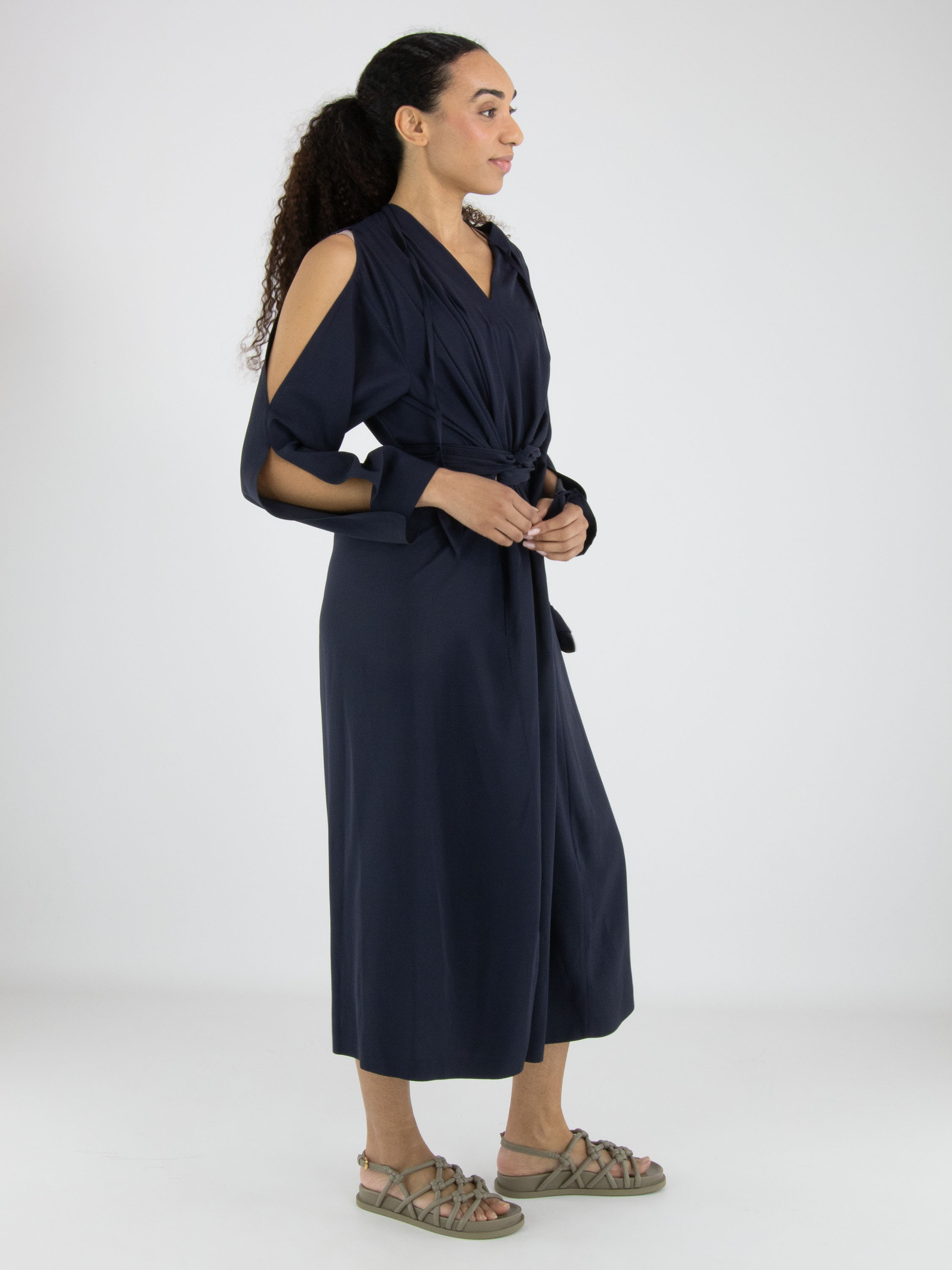 Dress by High in an elegant navy blue shade. From the sides of the V-neckline, two pleats on each side create a refined and fluid drape. Two long ribbons extend from the neckline, finished with decorative leaf-shaped ends that add an artistic and playful detail. A belt at the waist continues towards the inside of the dress at the sides, subtly shaping the silhouette. The upper part of the sleeves is open from the shoulder to the elbow. Side pockets are placed at waist level. This dress should not be washed.
