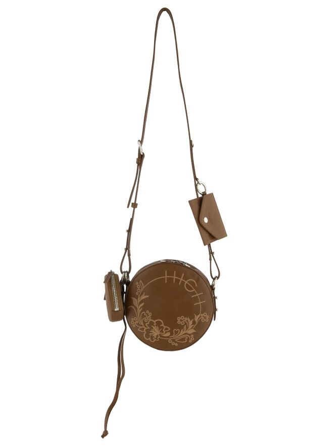 A designer shoulder bag by High in cognac color, divided into three compartments. The "large" round bag features an embroidered floral design with the text 'High' on the outside. Both round bags have a zipper closure. The small envelope-style bag has a snap button closure. The shoulder strap is adjustable in two positions.
