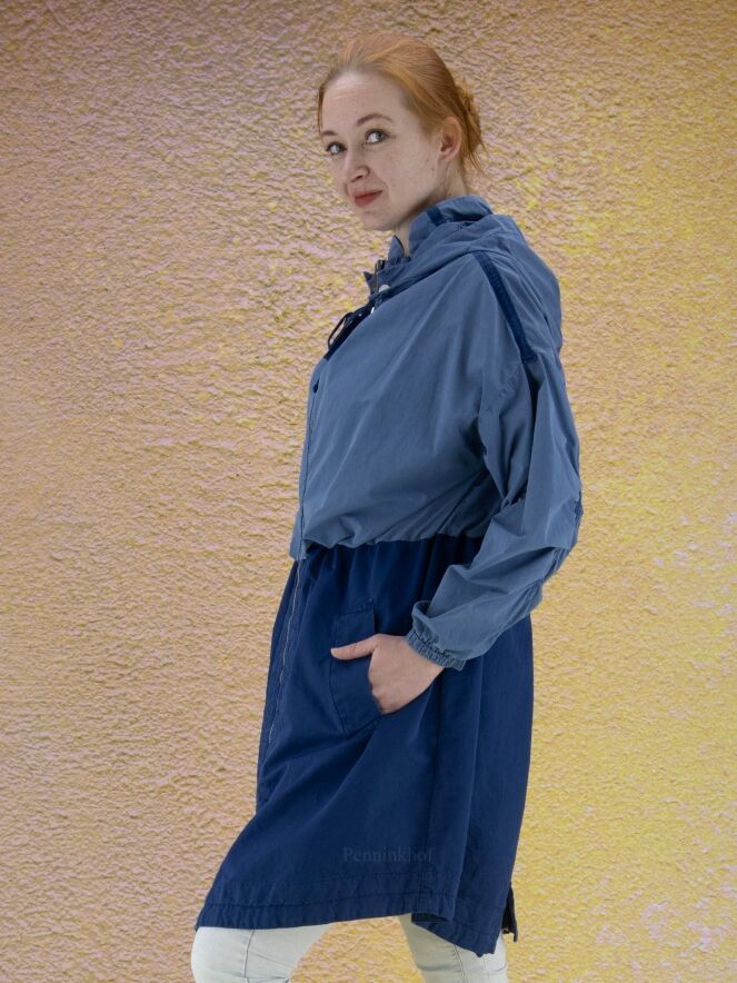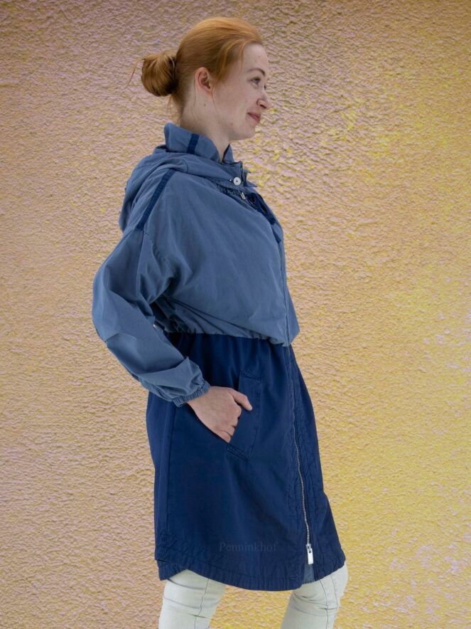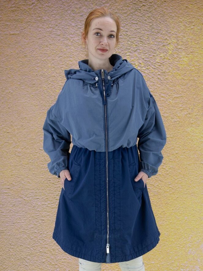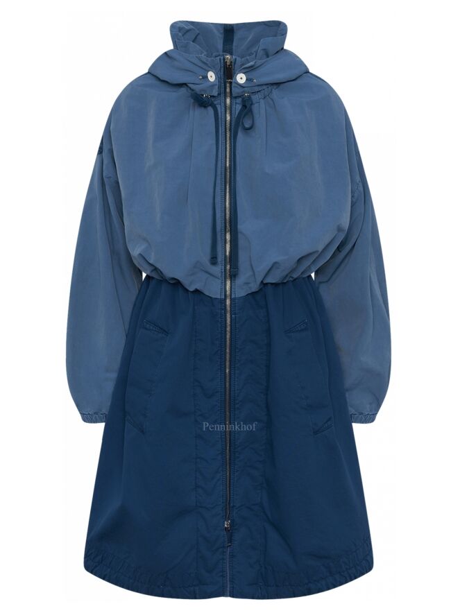 A medium-length coat from High in 2 shades of blue. Above the waist, the fabric is in a soft matte blue color. Below the waist, the coat has a cobalt blue color. The hood is detachable. Over the top of the sleeves is a trim along which the fabric is finely pleated. At the end of the sleeves is a narrow elastic band. The coat has a silver colored zipper and side pockets. This coat should not be washed.