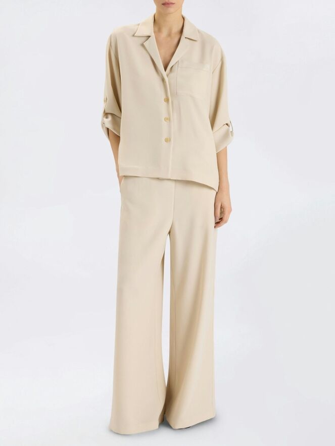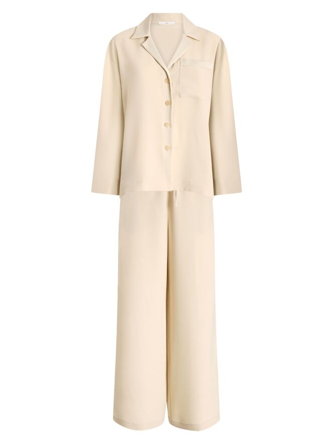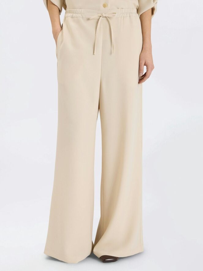 Suit by High in an elegant beige shade. The trousers feature an elastic waistband with finely pleated fabric. A drawstring belt in a tunnel construction allows the waist to be adjusted for a comfortable fit. The trousers are designed with wide legs, creating a fluid and contemporary silhouette.