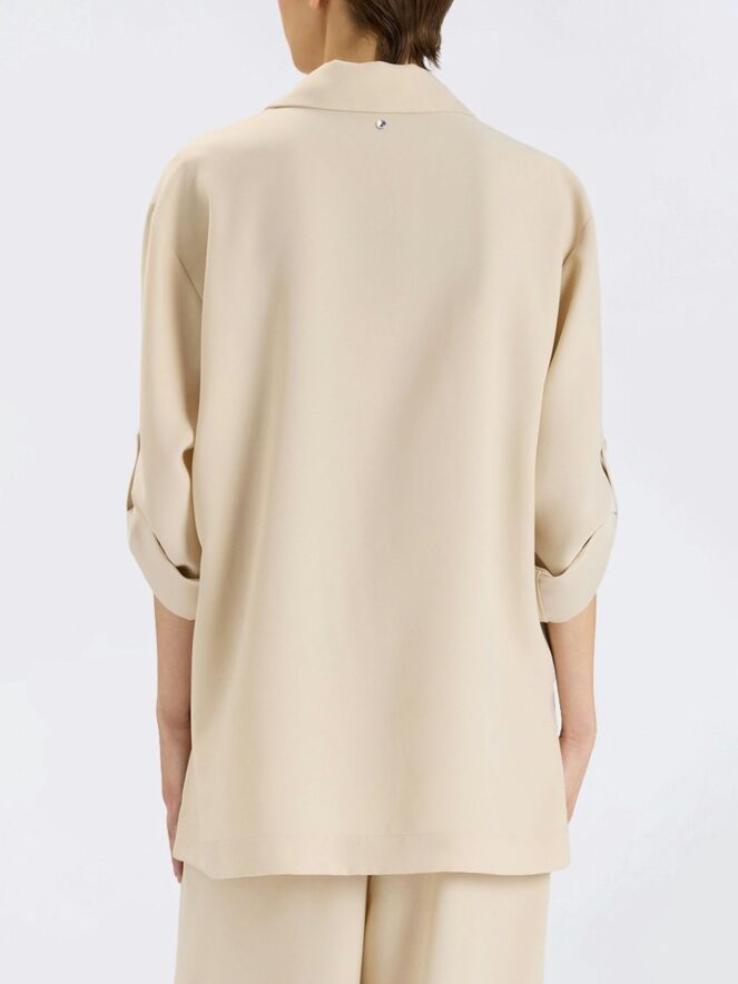 The blazer fastens with four buttons and features a chest pocket finished with a matte satin trim, adding a refined contrast. The sleeves can be rolled up and secured with a short strap and button closure. This ensemble should be hand-washed.