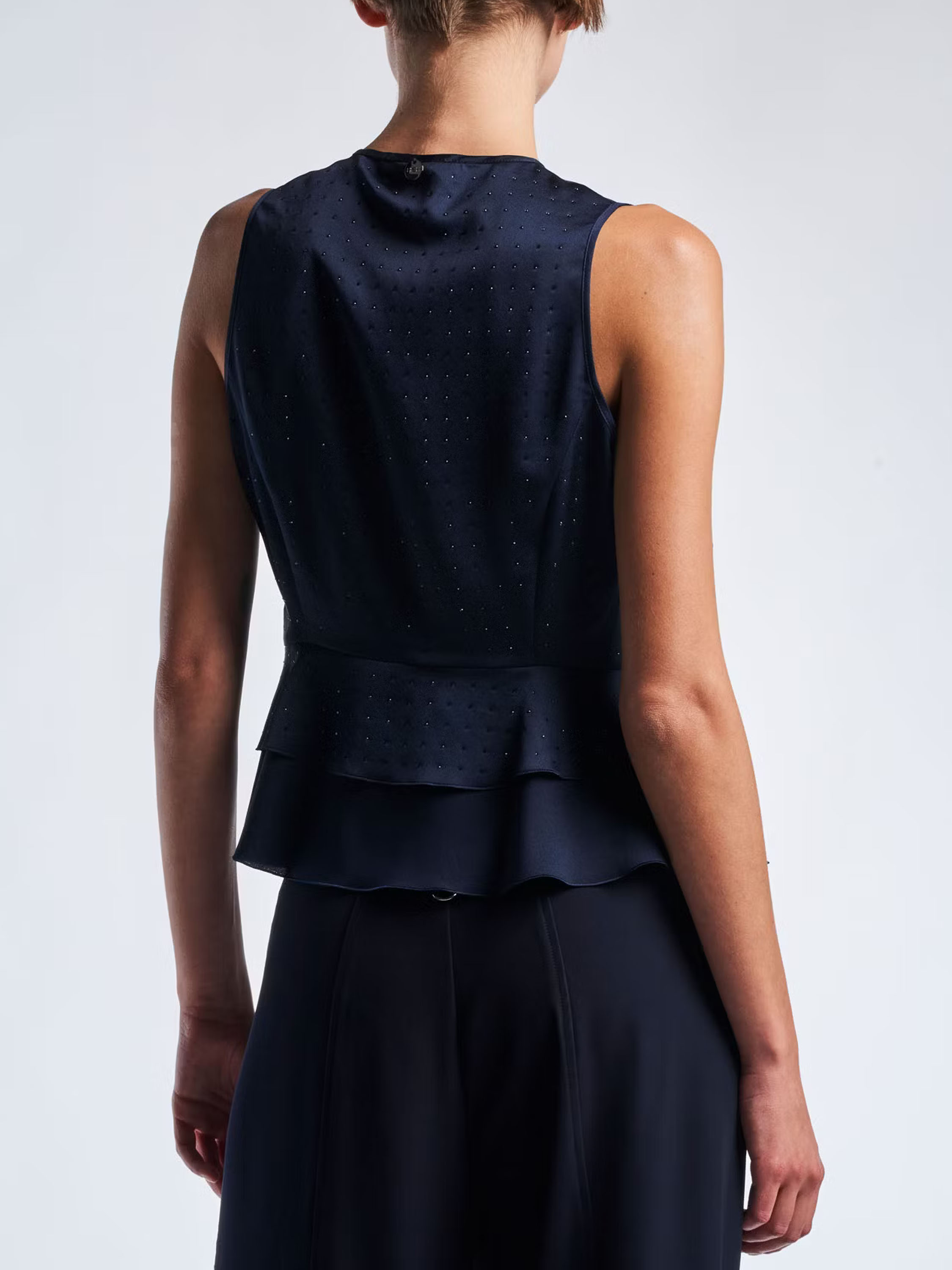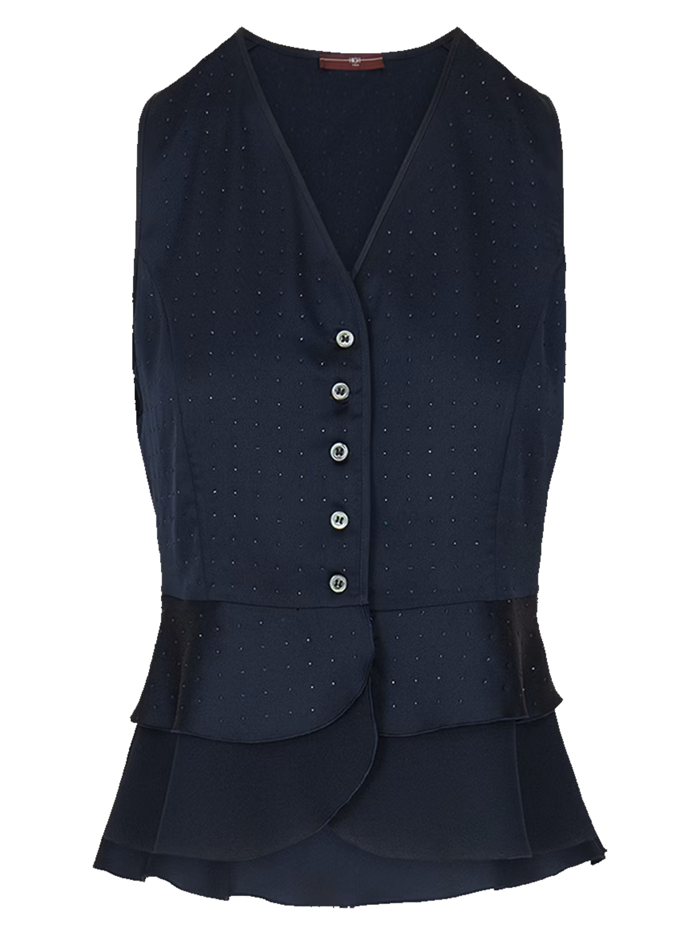 A matte satin vest by High in midnight blue color. Rhinestones are embedded in the fabric. At the bottom, there is a second layer of fabric in a light, transparent voile quality. This vest can be hand-washed.