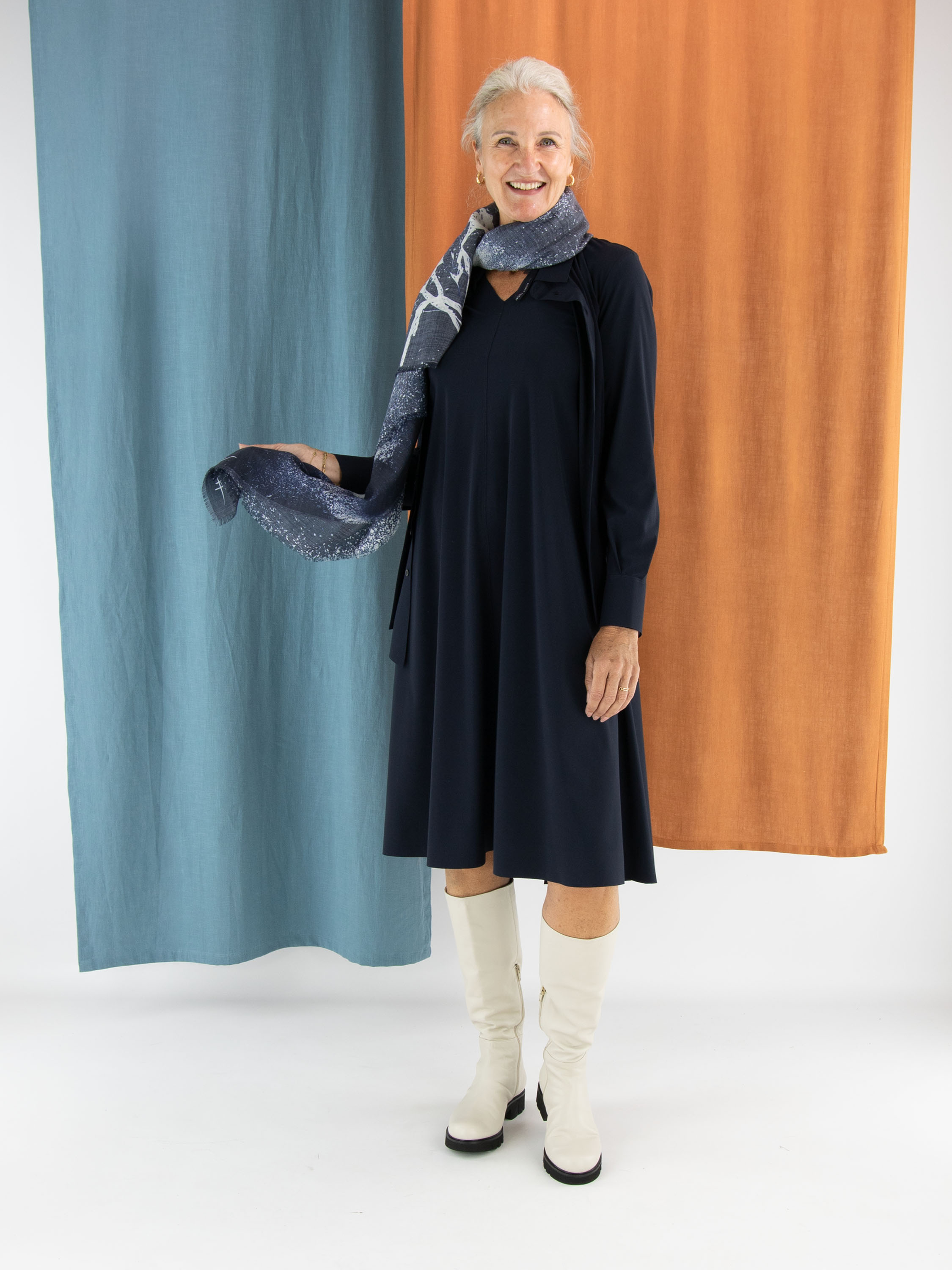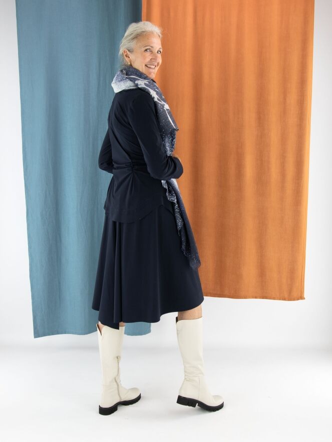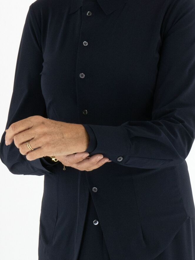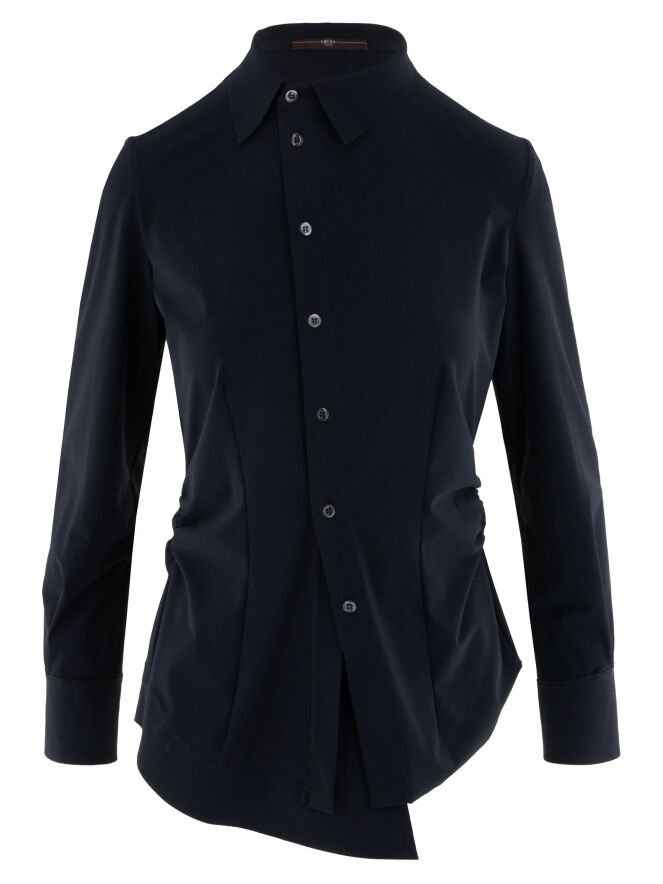 A navy blouse by High. The fabric is delicately gathered along the sides and along the waist seams at the back. The blouse has long sleeves and should be hand-washed.