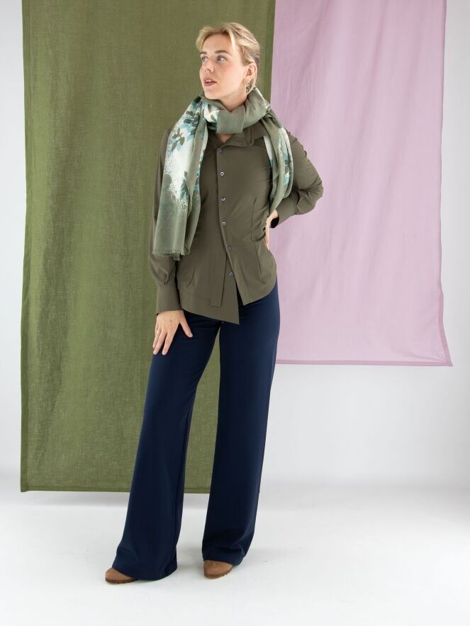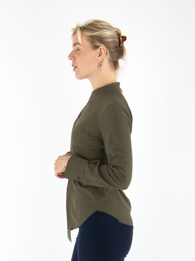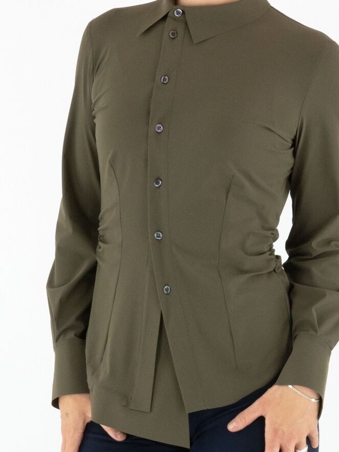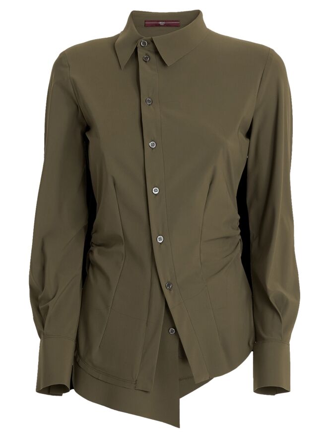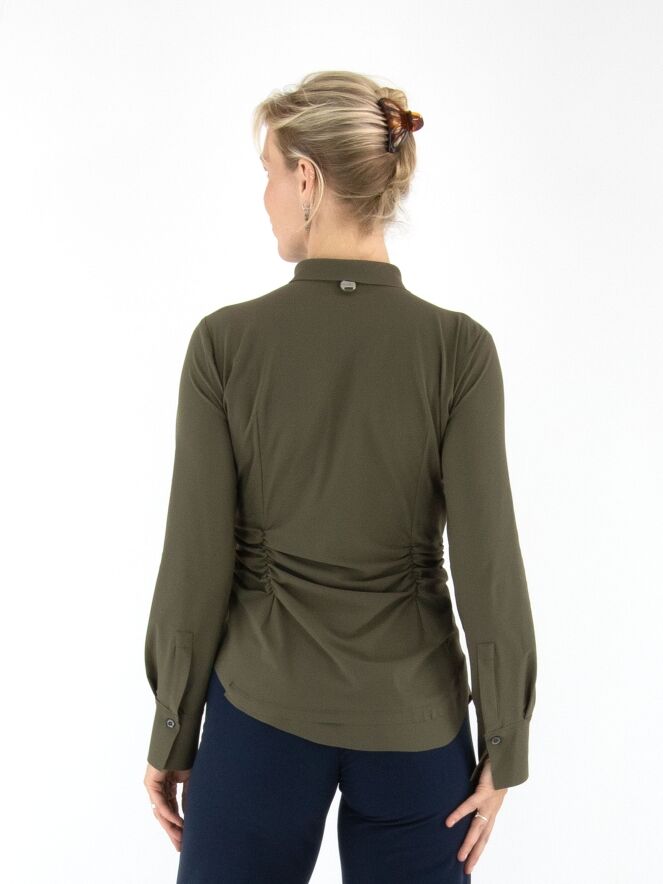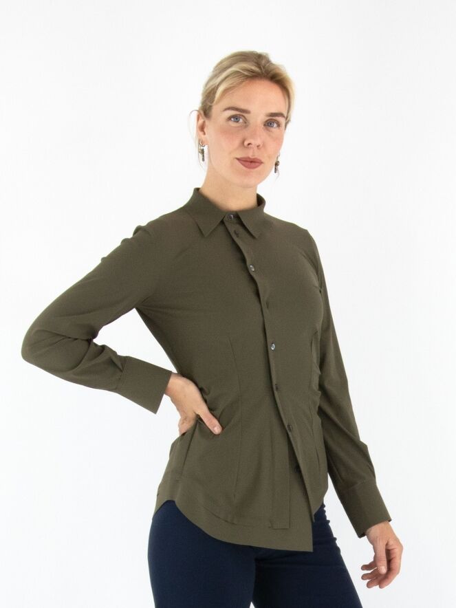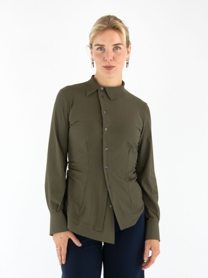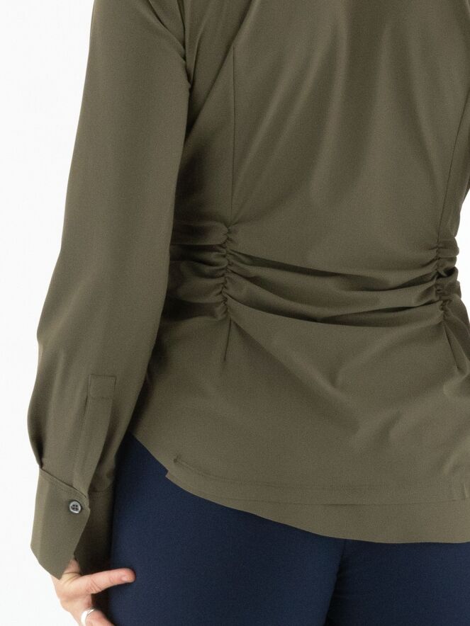 A blouse by High in olive green. The fabric is finely pleated along the sides and the waist seams at the back. The blouse has long sleeves and should be hand-washed.