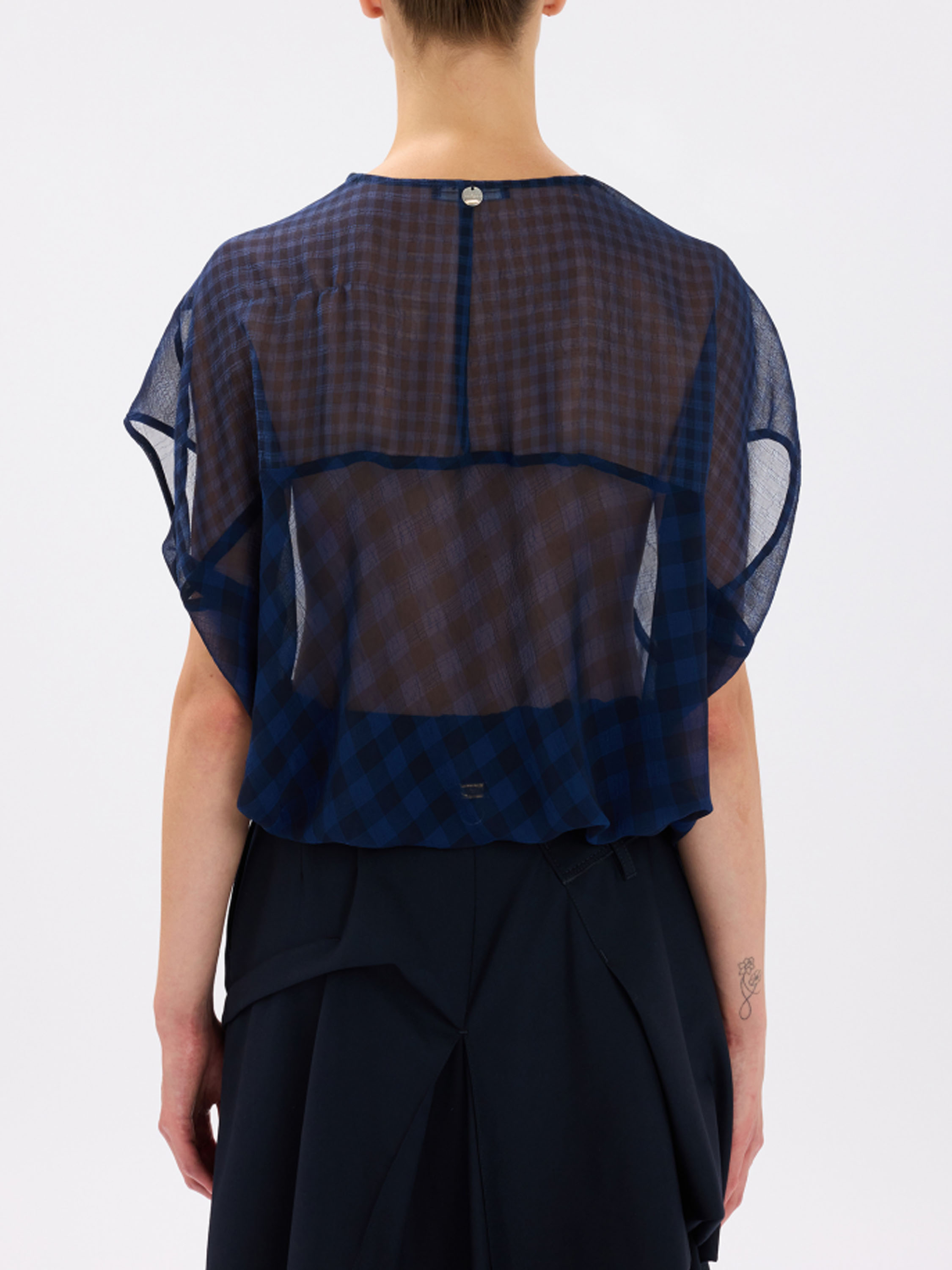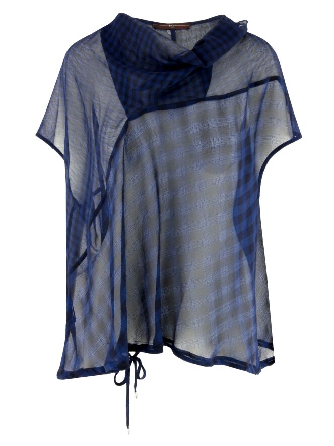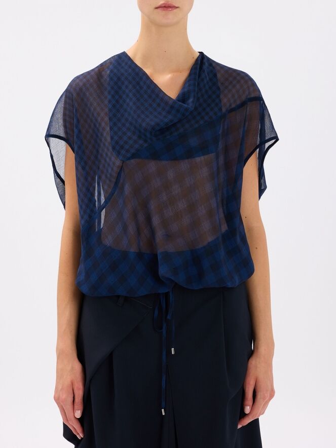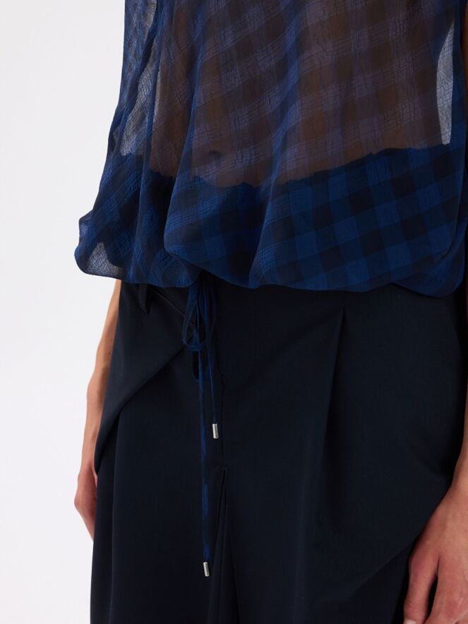 A transparent top from High with a checked pattern in midnight blue. The top features a draped neckline. Along the hem, a ribbon is inserted in a tunnel construction, allowing a pleated effect to be created. This top can be hand-washed.