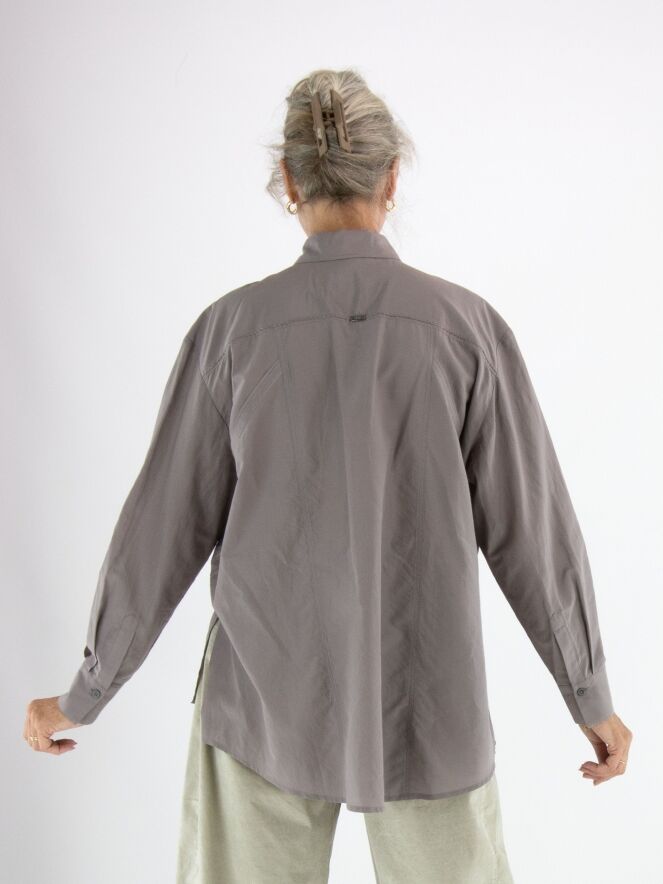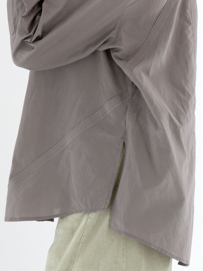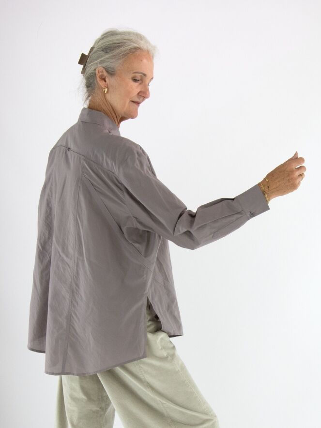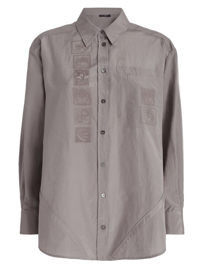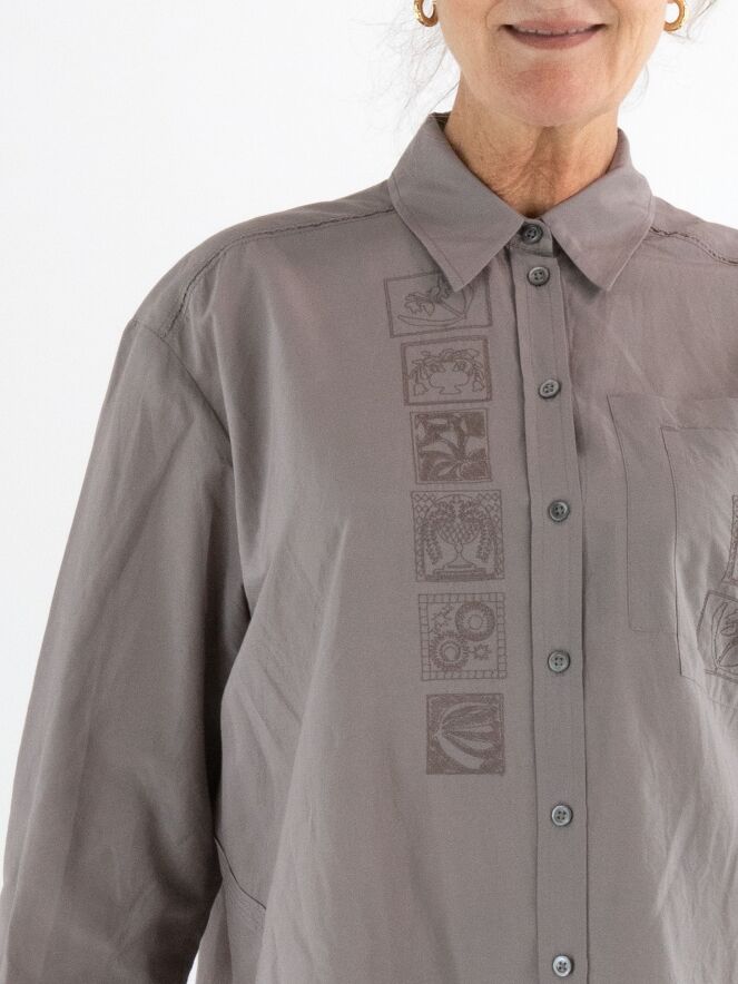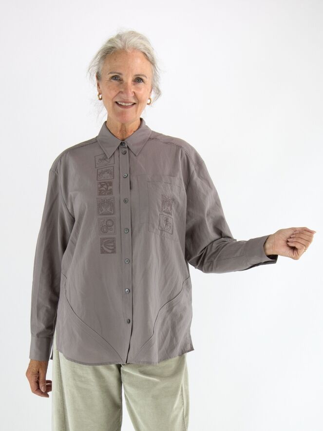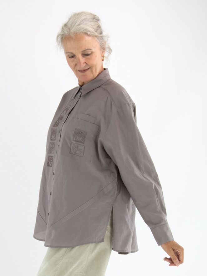 A loose-fitting blouse by High in a mauve shade. The front features several small square panels with embroidered floral designs. There are slits at both side seams at the hem. This blouse should be hand-washed.