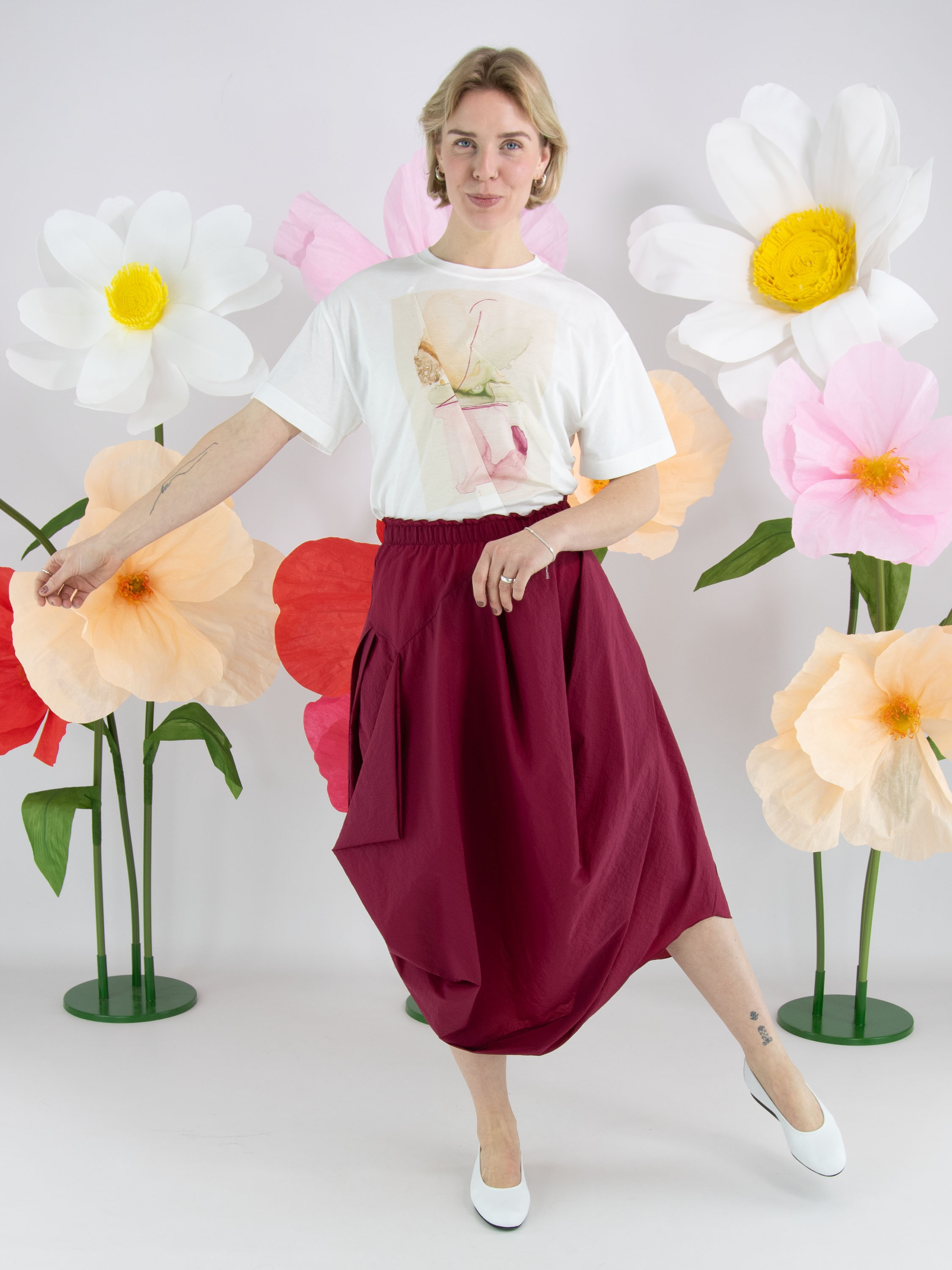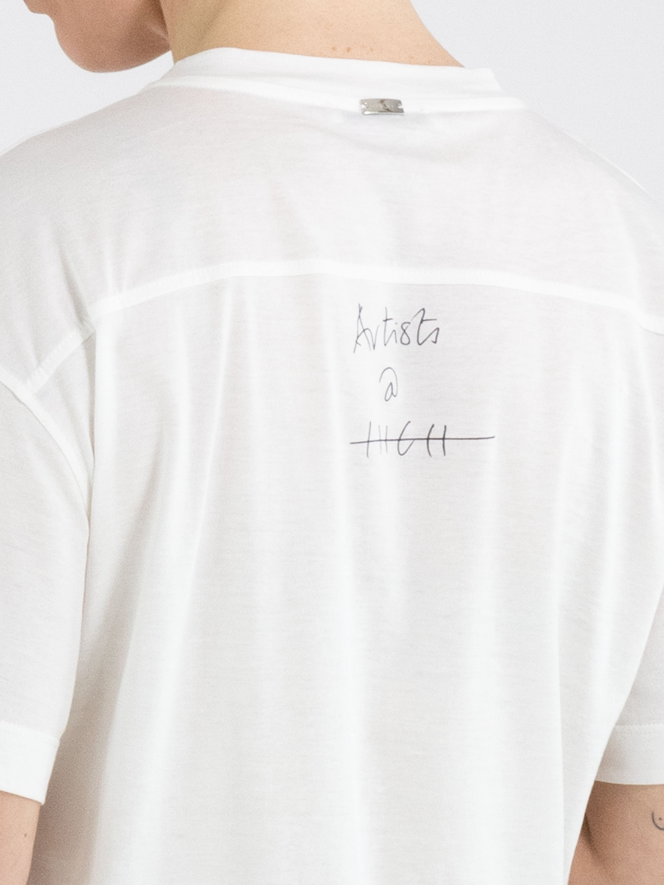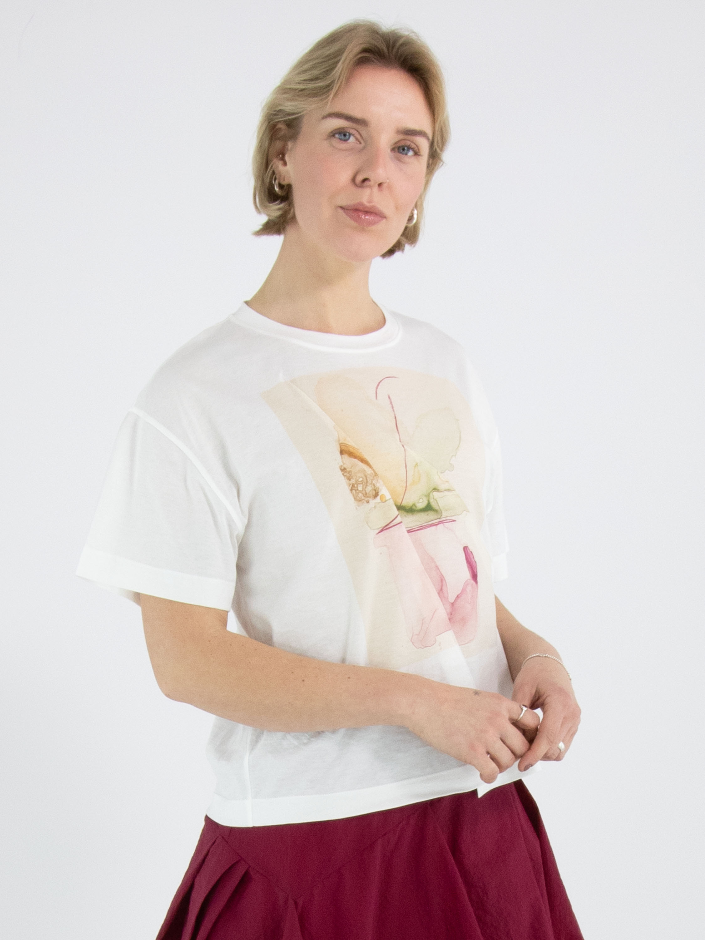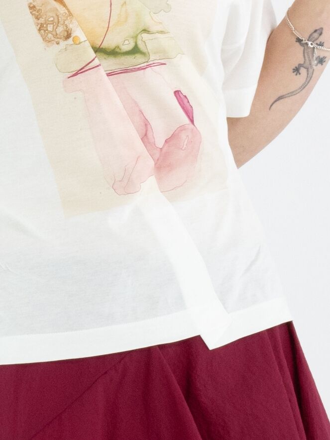 A shirt from High in white. On the front is a graphic photograph by photographer Manuela de la Vega Castro. From the right shoulder, two diagonal seams run downward. The shirt has short sleeves and a round neckline and can be hand-washed.
