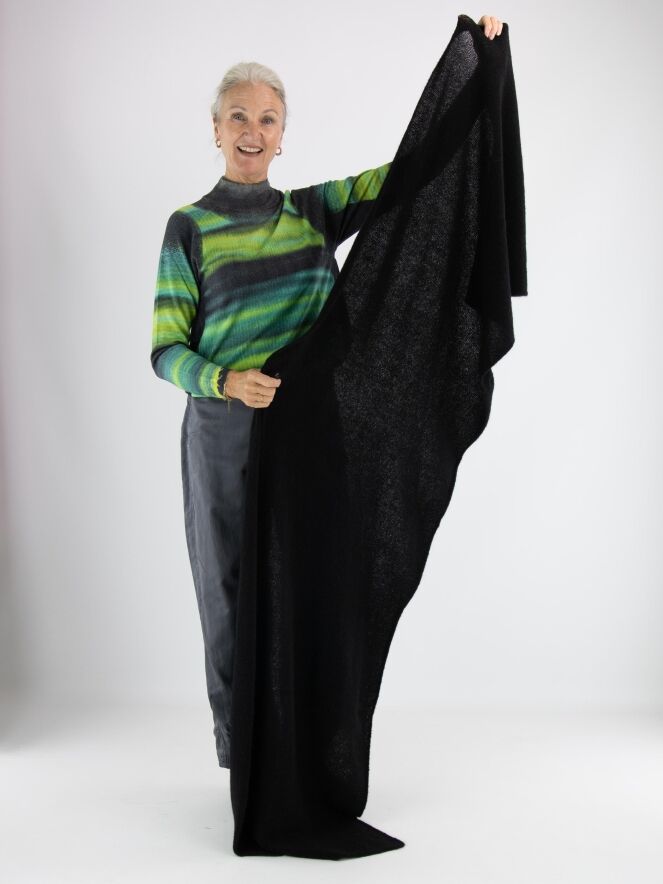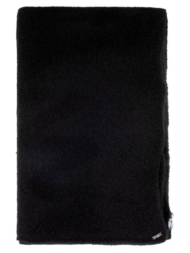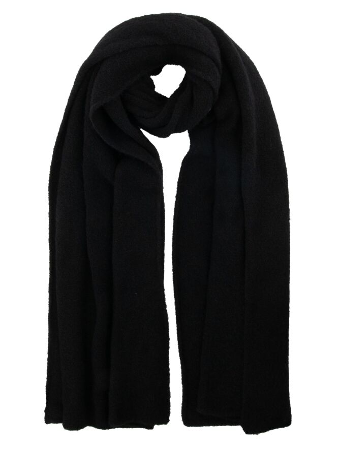 Scarf by High in black. The scarf is finely knitted and should be hand-washed.