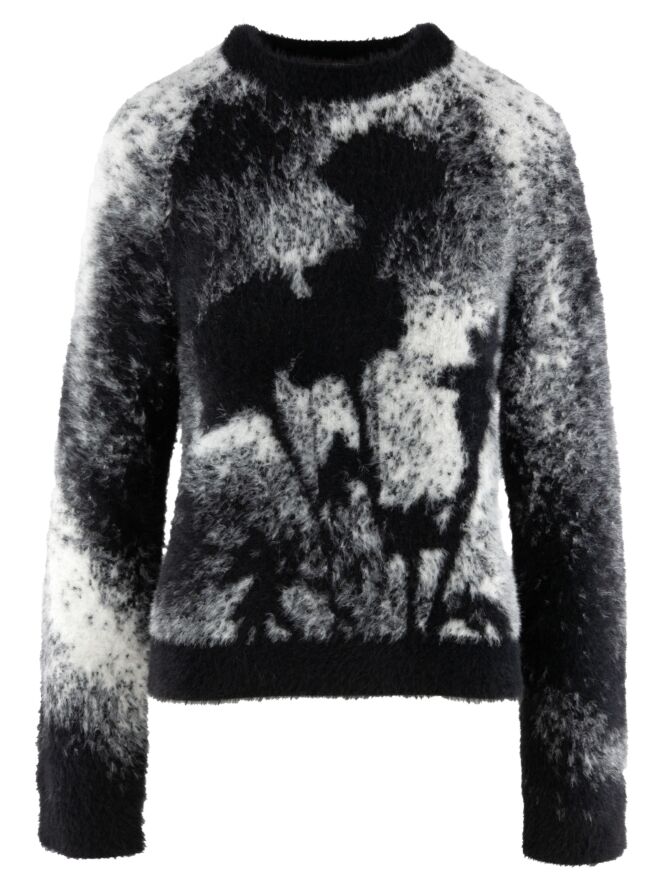 A pullover by High featuring a graphic print in black and off-white. The round neckline, cuffs, and hem are finished with a white trim. The fabric is elastic and has a mohair-like texture. This pullover should be hand washed.