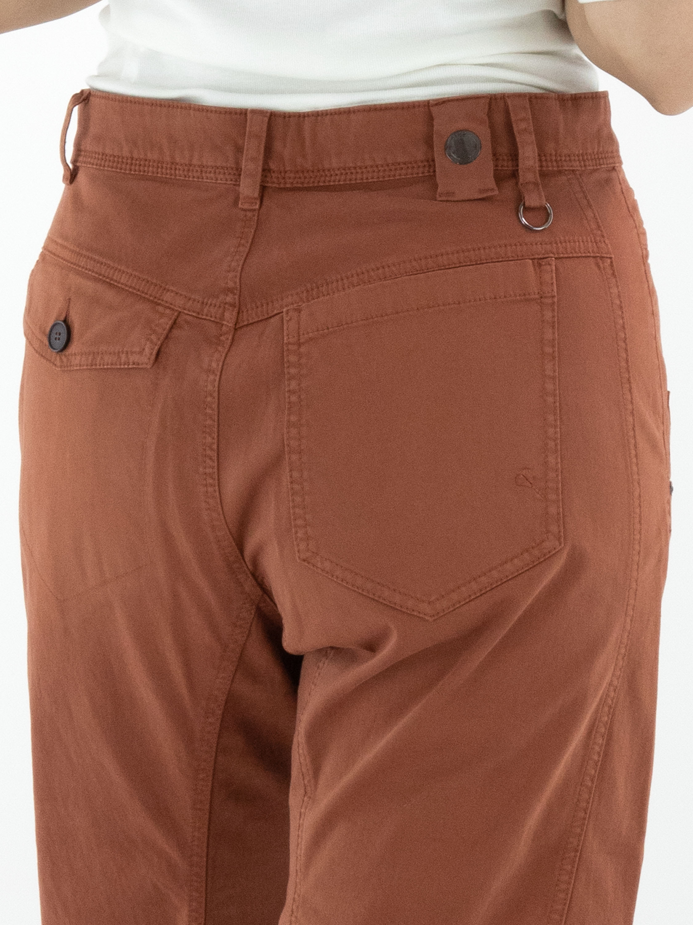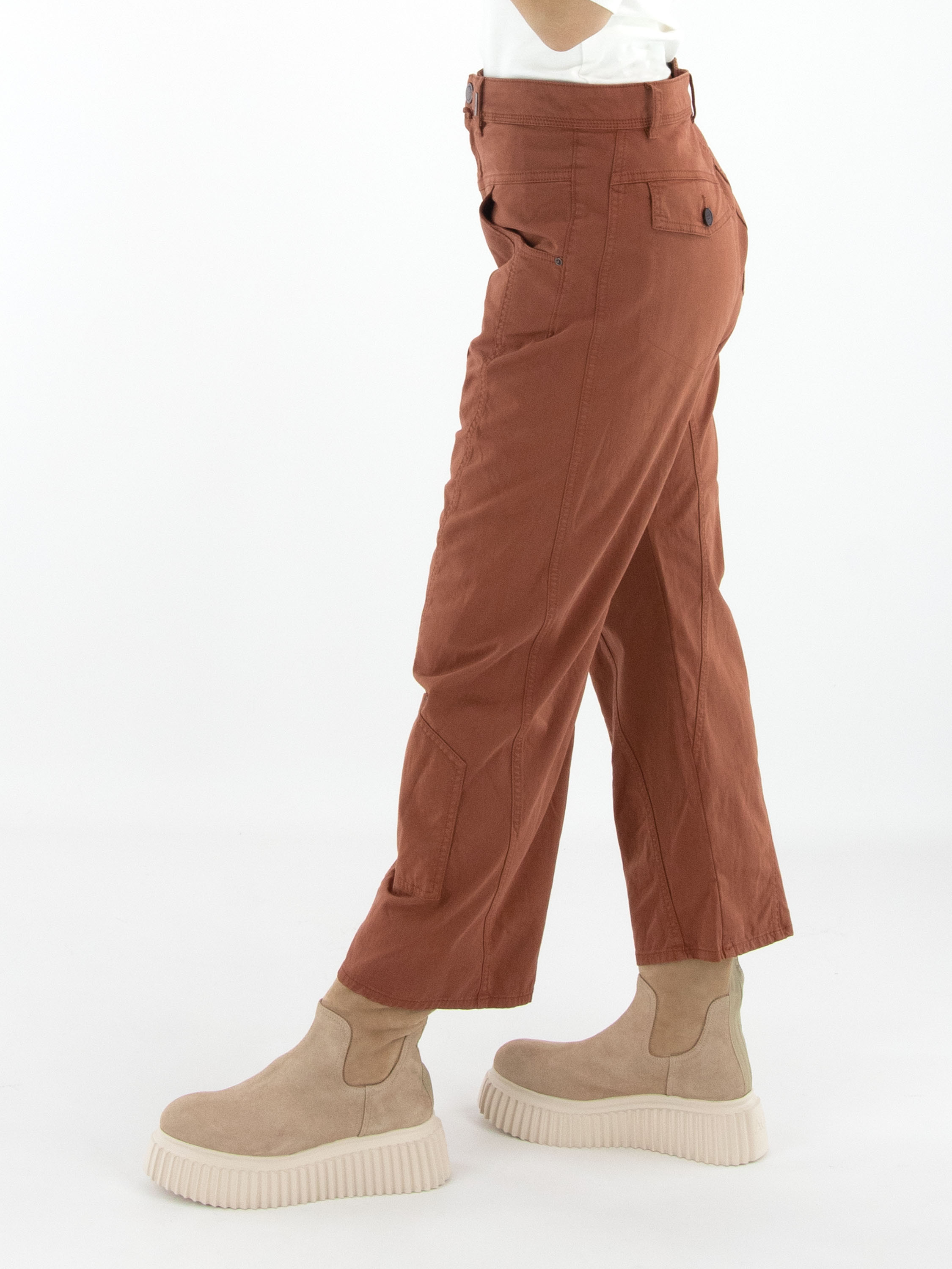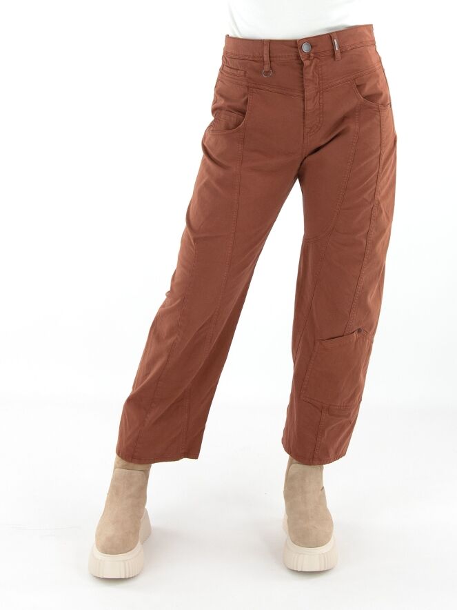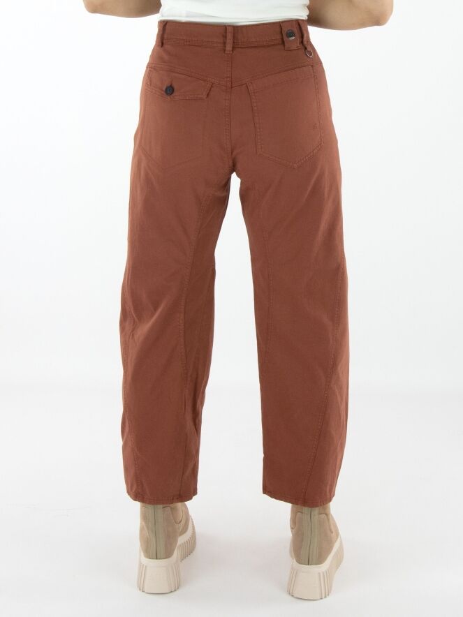 A pair of jeans from High in rust brown. Designed in a 5-pocket style with a unique twist, it features a decorative inverted pocket placed at the bottom of the left leg, adding an eye-catching and artistic detail. These jeans can be washed at 30 degrees.