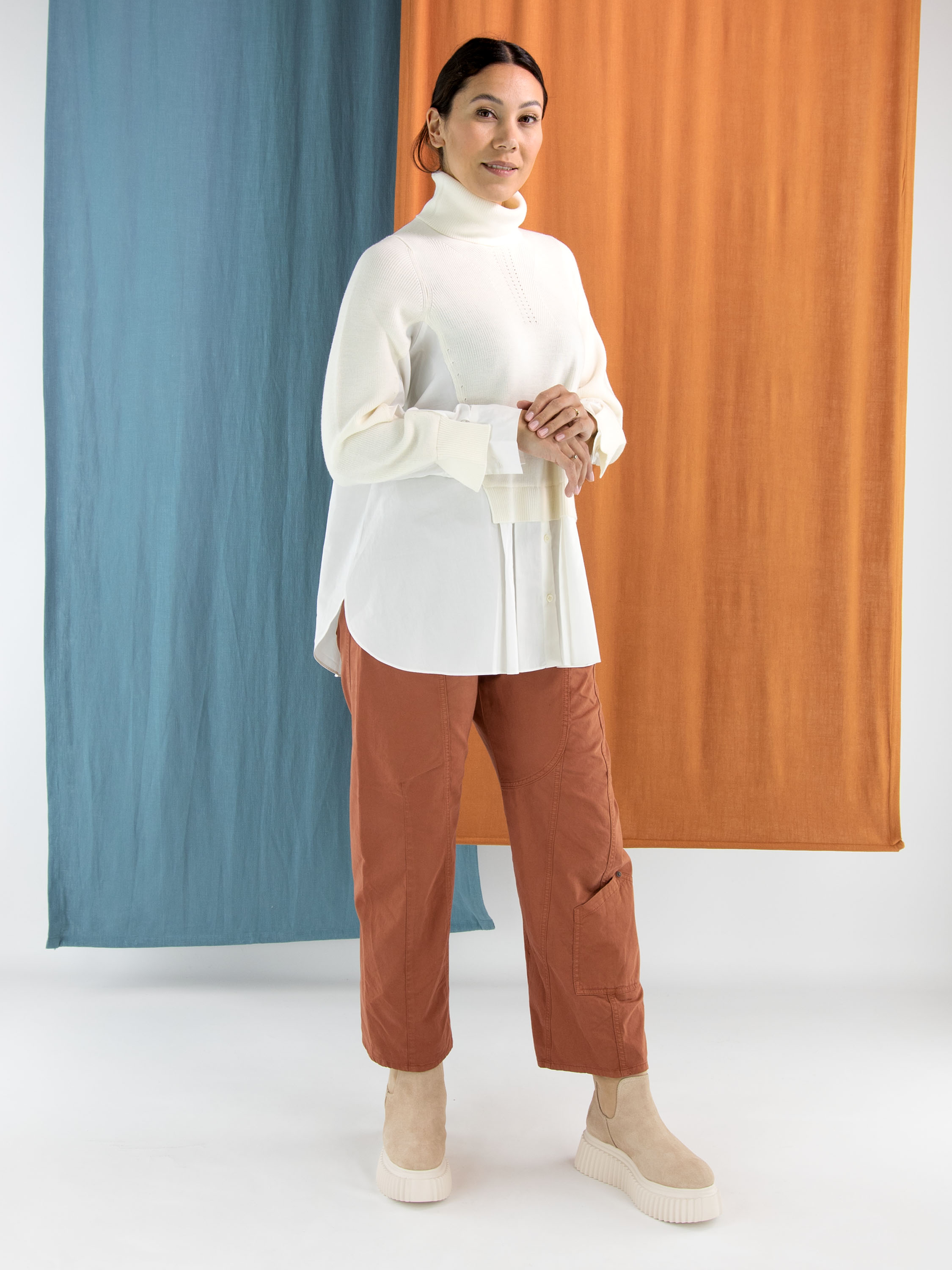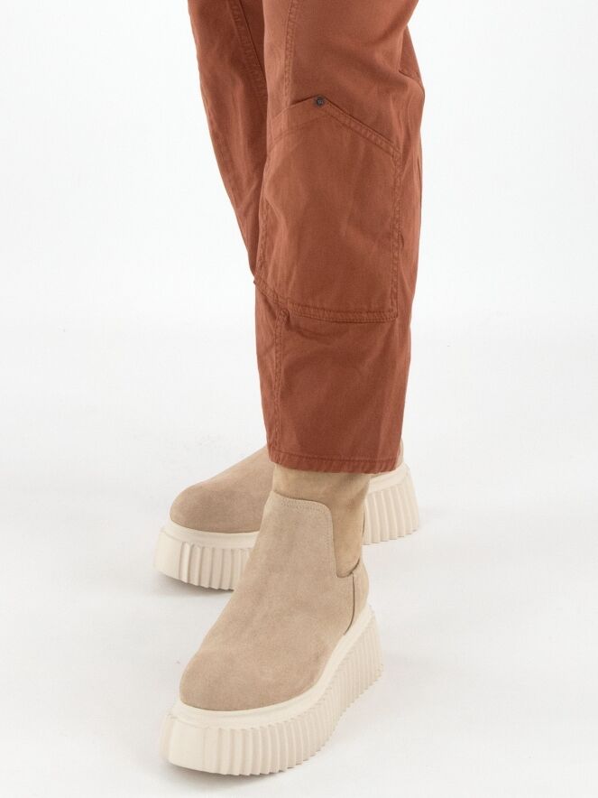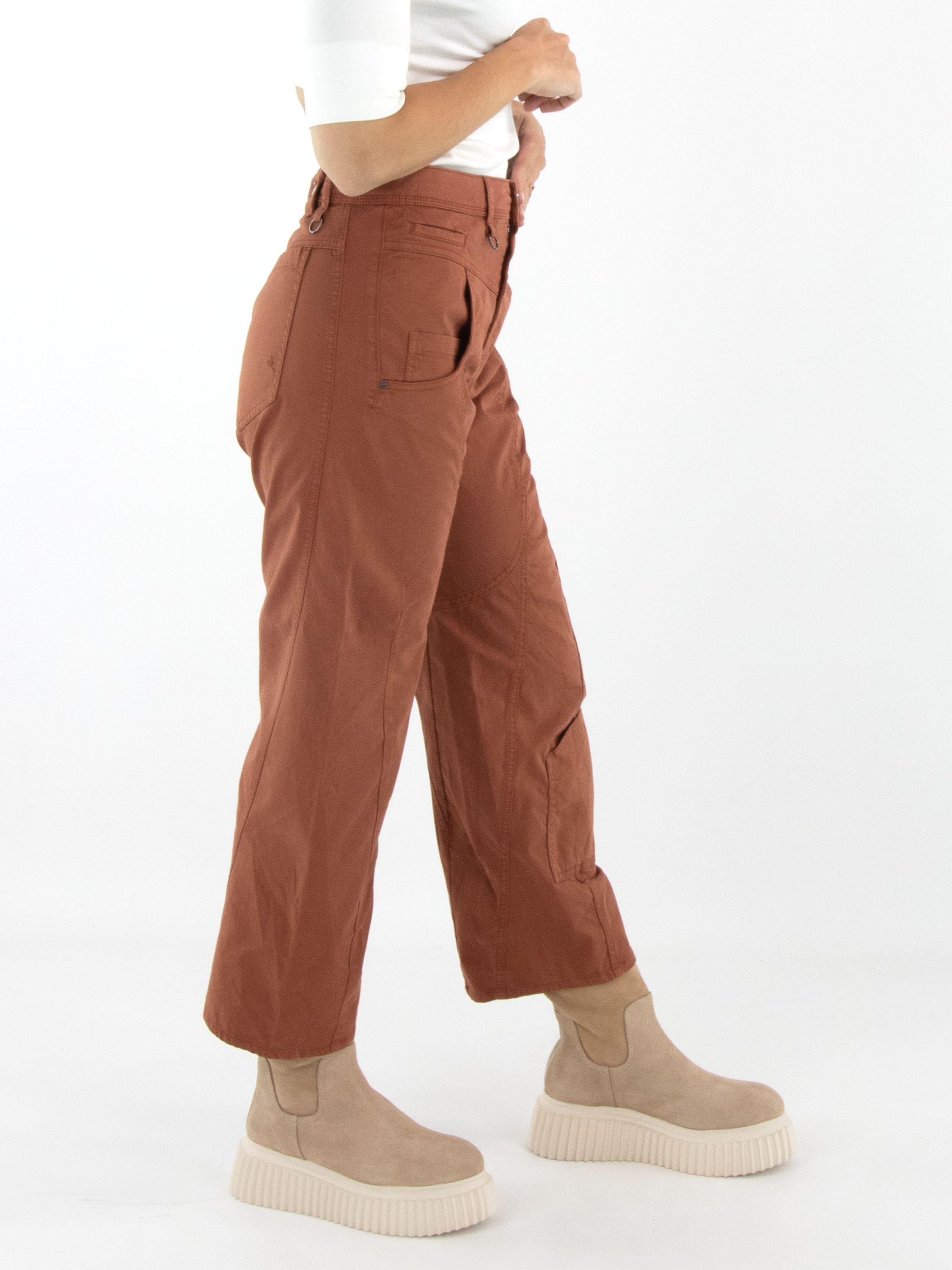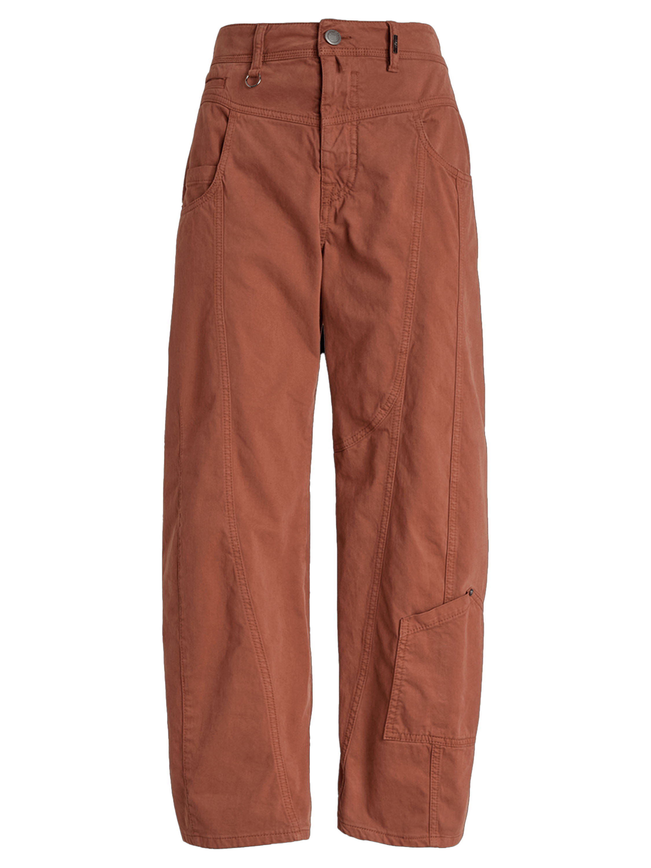 A pair of jeans from High in rust brown. Designed in a 5-pocket style with a unique twist, it features a decorative inverted pocket placed at the bottom of the left leg, adding an eye-catching and artistic detail. These jeans can be washed at 30 degrees.