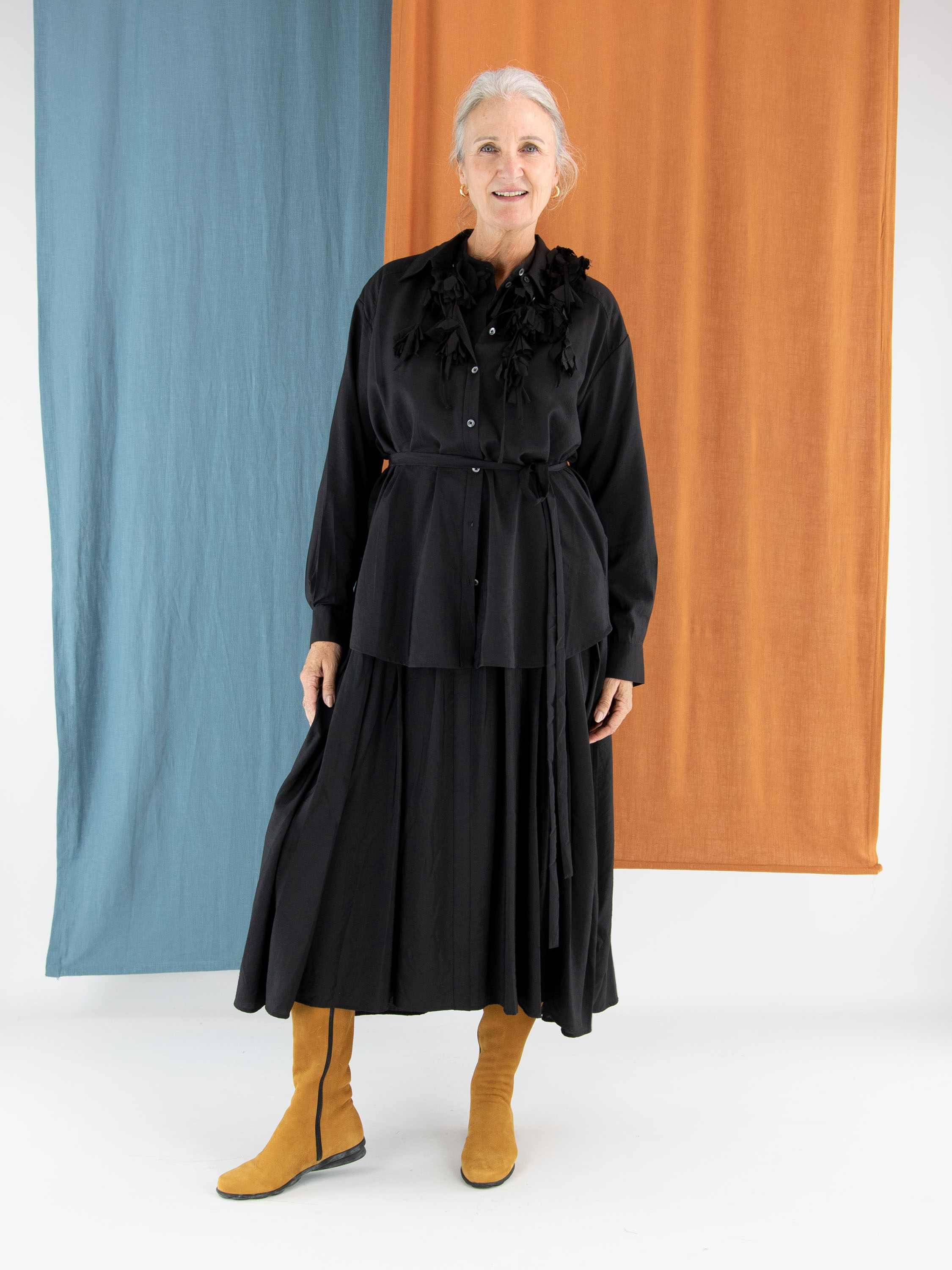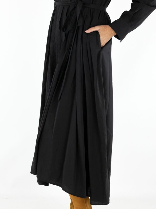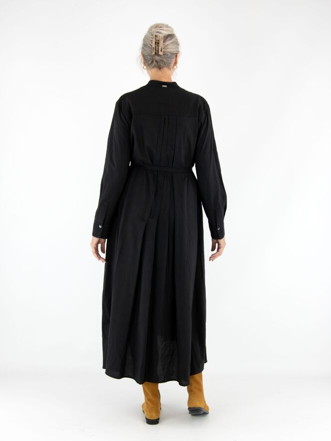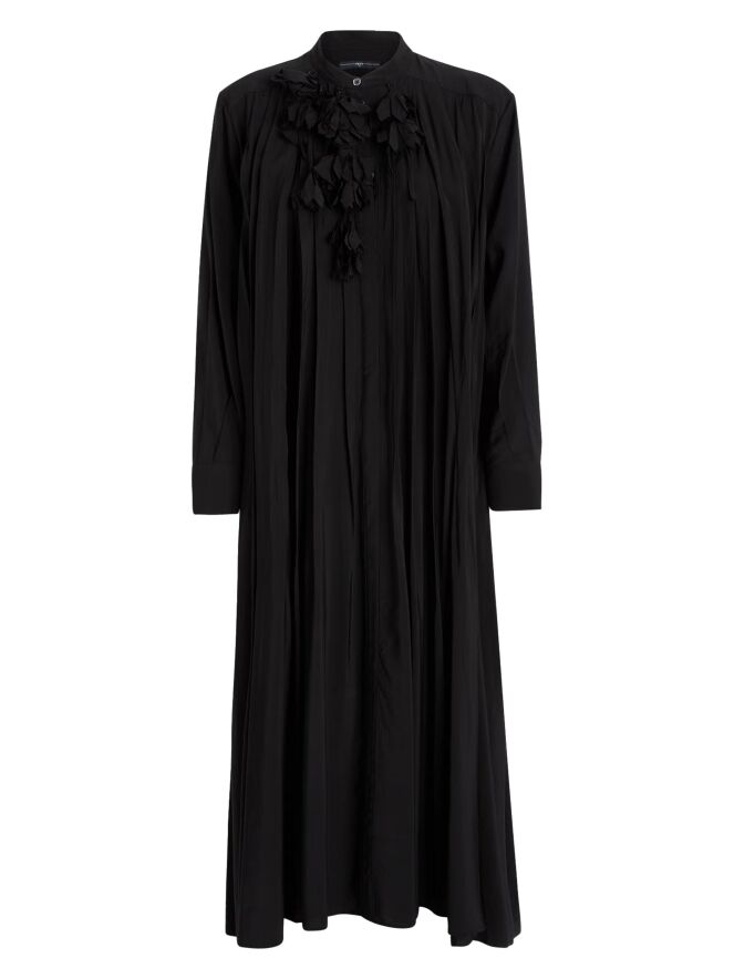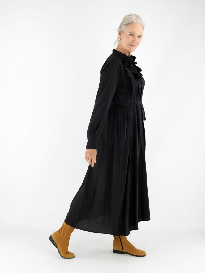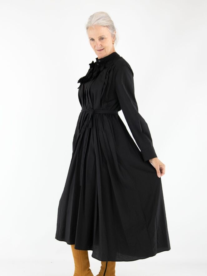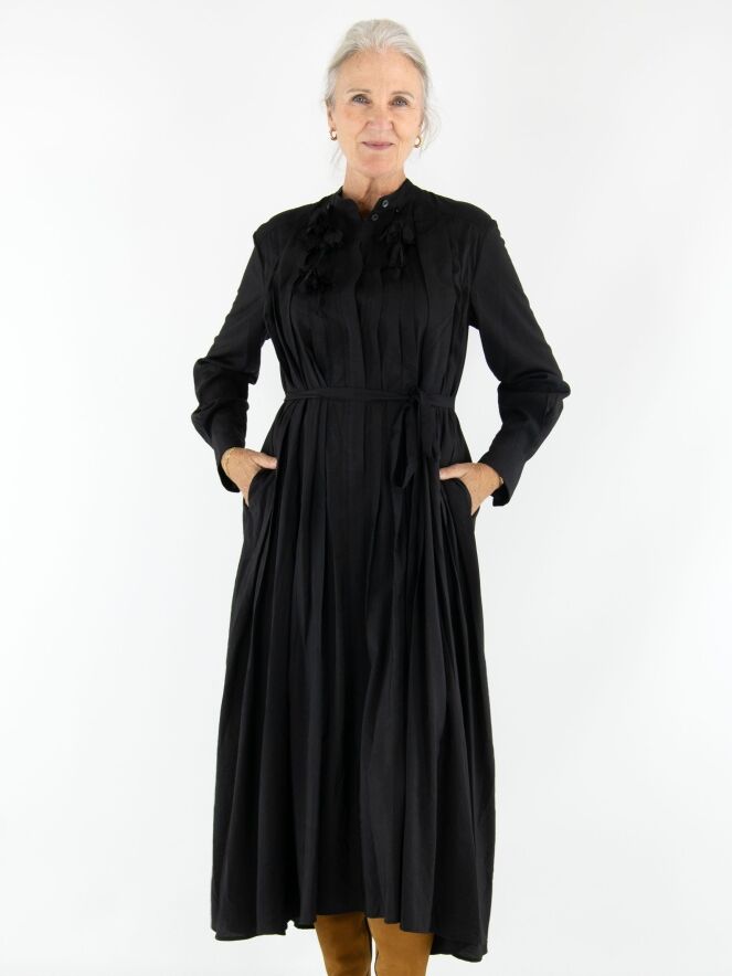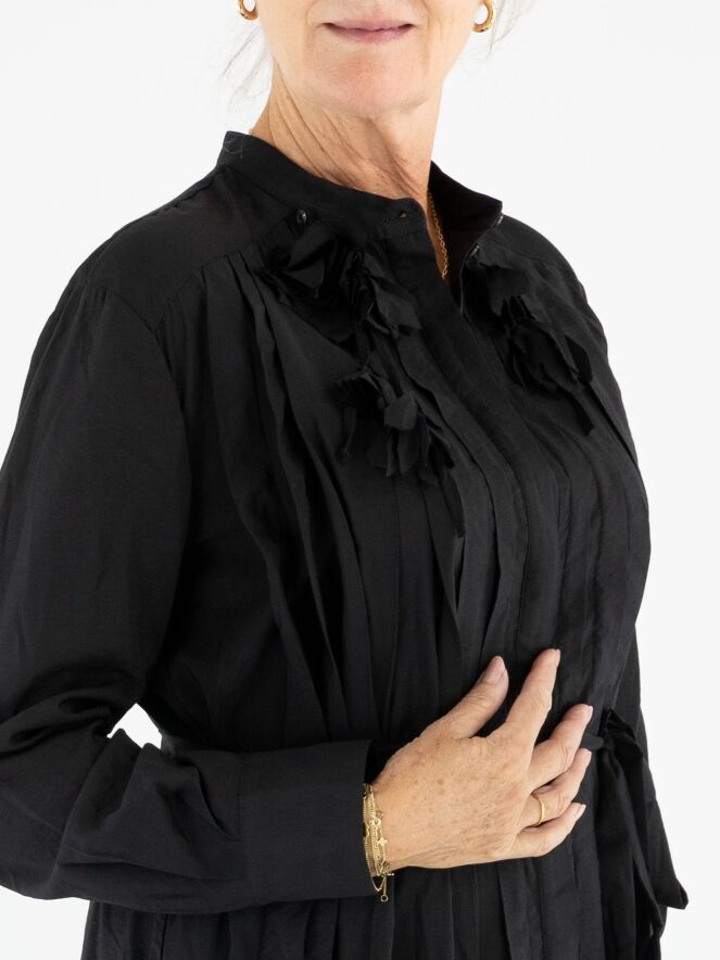 A dress from High in black. From the high neckline runs a concealed button placket down to the waist. At the front, the fabric is pleated from the shoulders, while at the back this detail reappears in the panel between the shoulder blades. Along the neckline, ribbons are attached with fabric flowers hanging from them, lending the dress a refined and artistic character. This dress can be hand-washed.