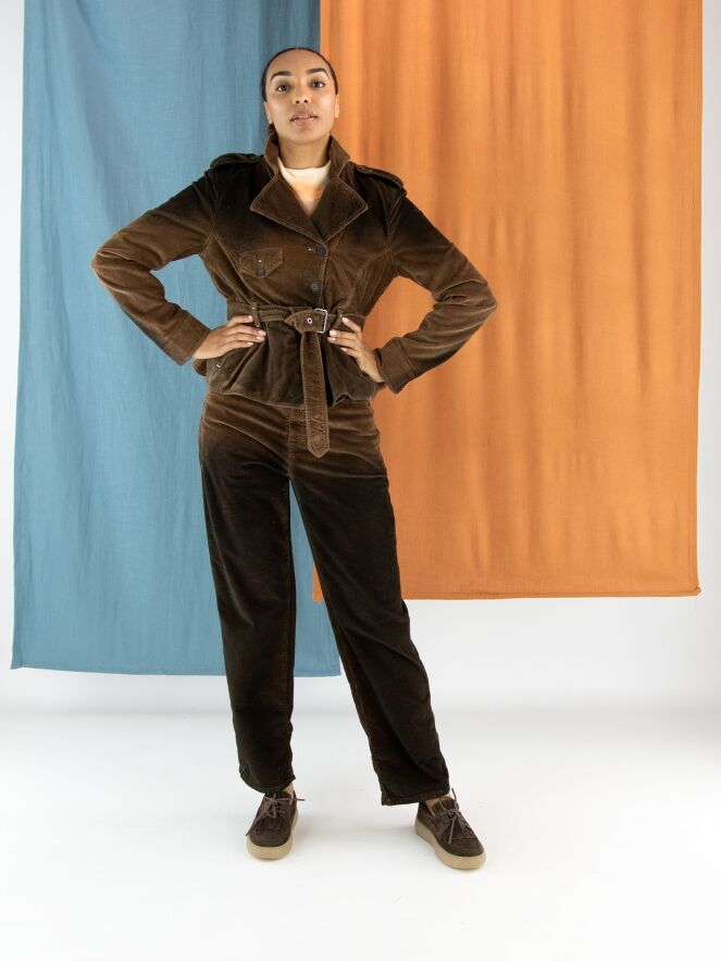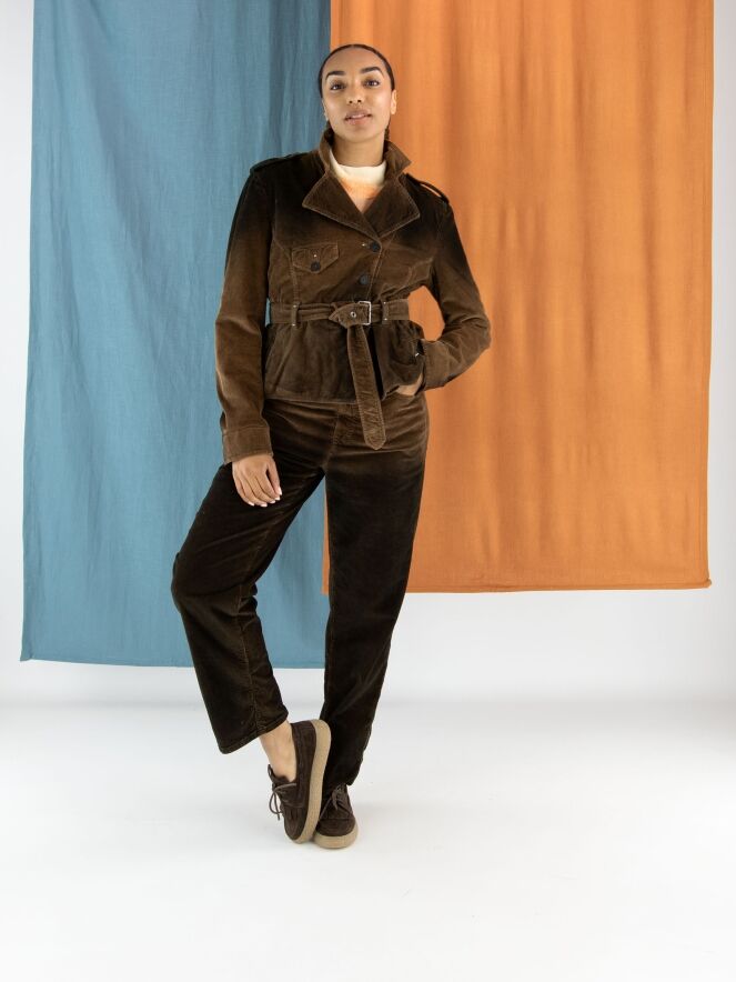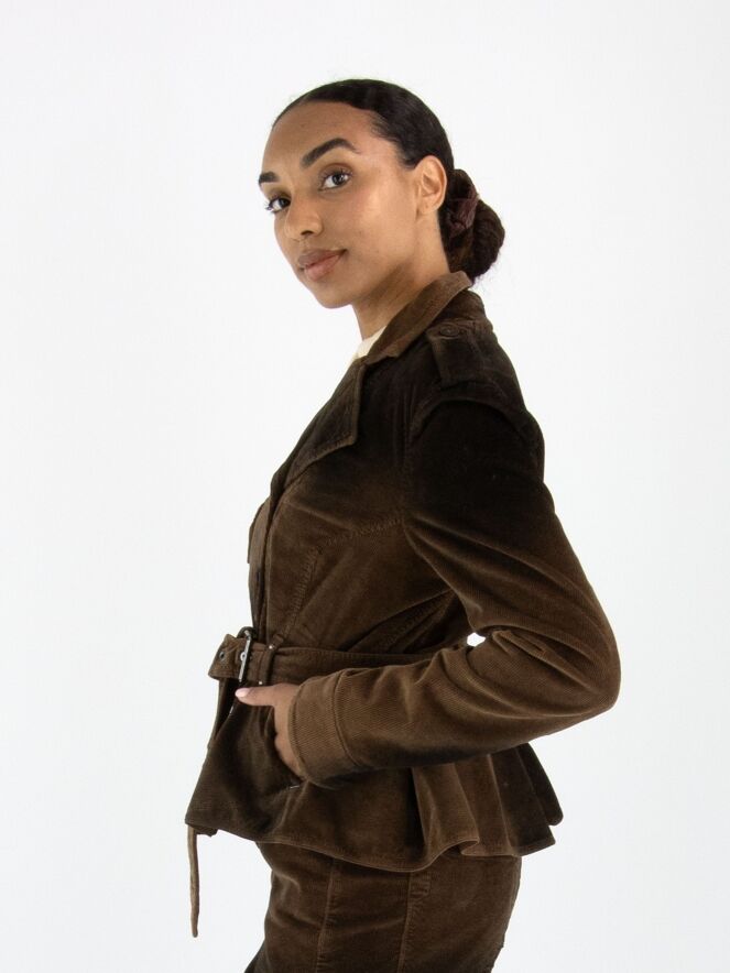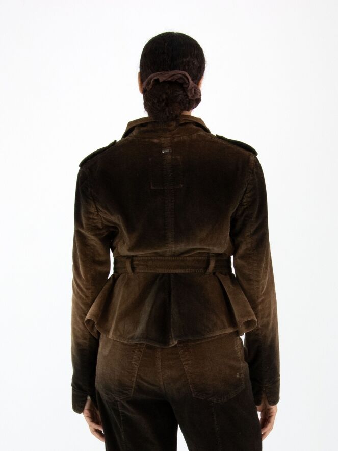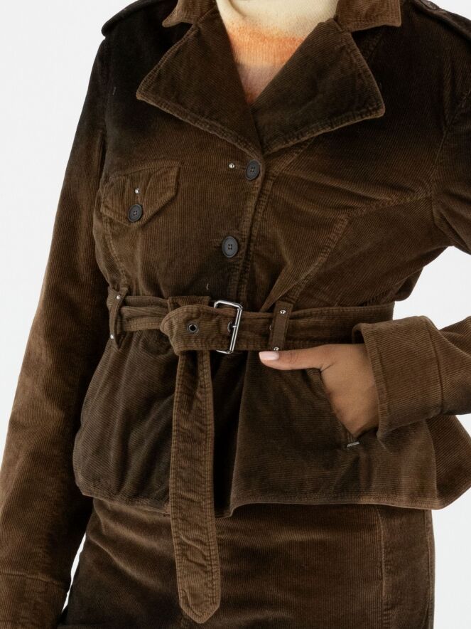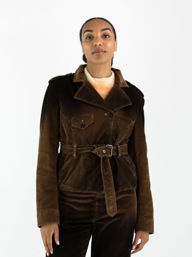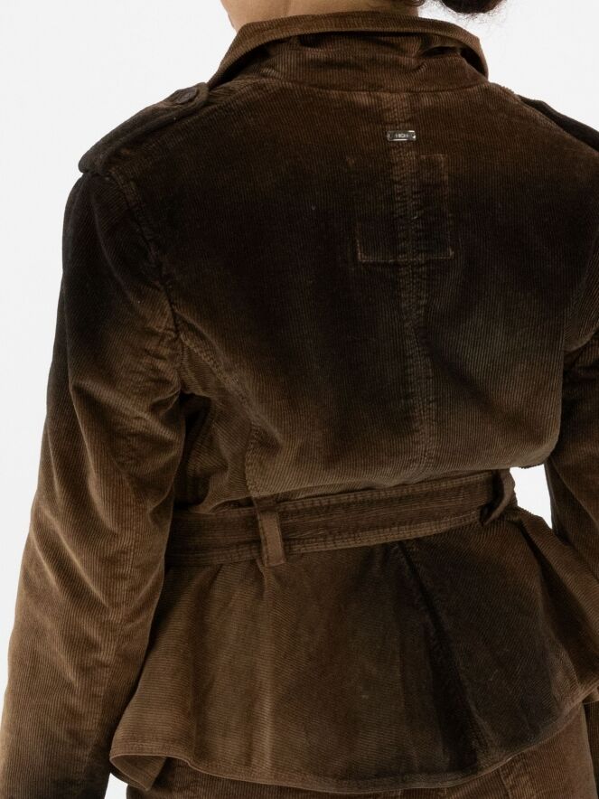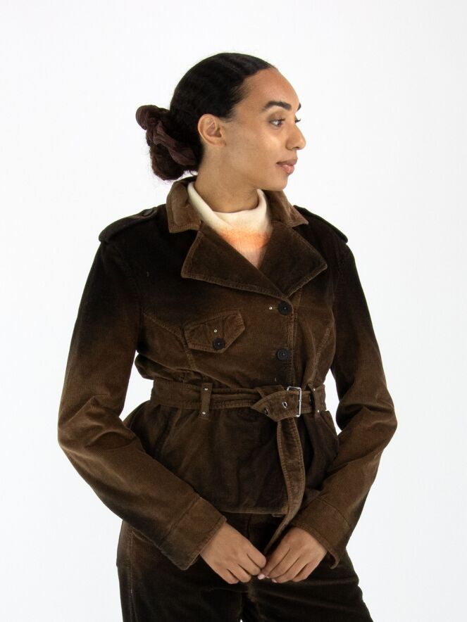 A ribcord blazer by High in a dégradé tone: mocha brown at the shoulders and hem, and a warmer brown at the centre. The blazer features an asymmetrical button fastening and a matching fabric belt at the waist. Below the waist are welt pockets. Sequins embellish the shoulders. This blazer should be hand washed.