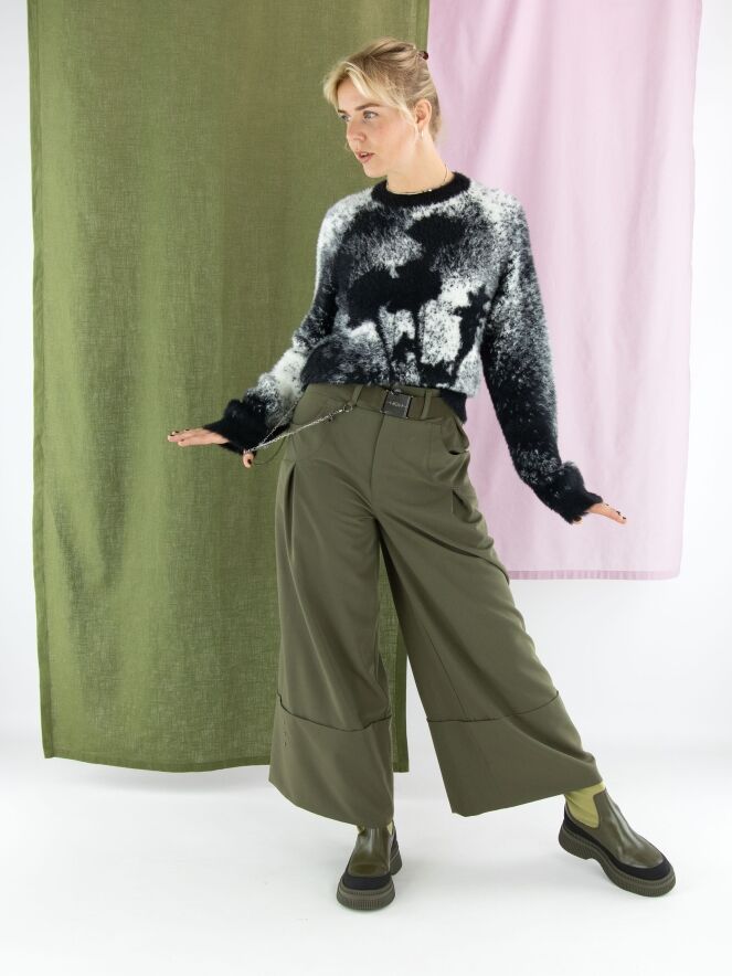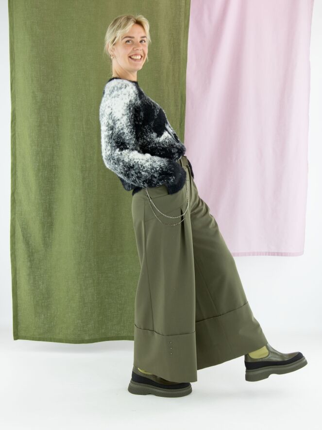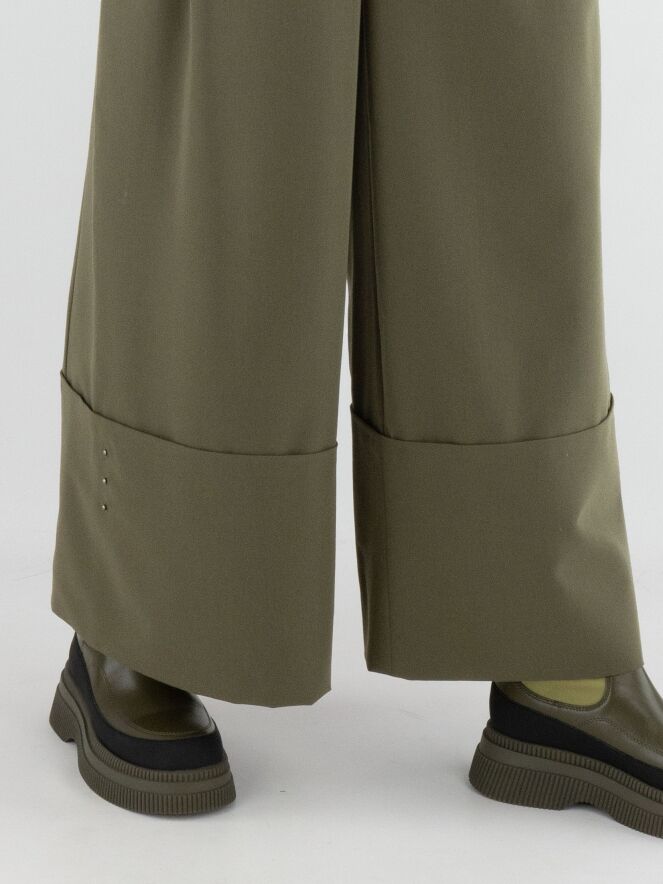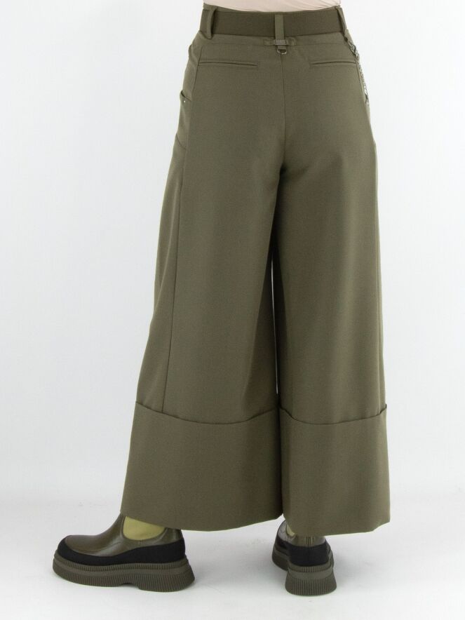 A wide-leg pair of trousers from High in olive green. The waistband features an elastic belt with a square nickel-colored buckle. Below the rounded side pockets, a pleat is added. At the lower calf, there is a reverse seam. Below this seam, on the outer side of the leg, three decorative studs are placed vertically. These trousers must not be washed.